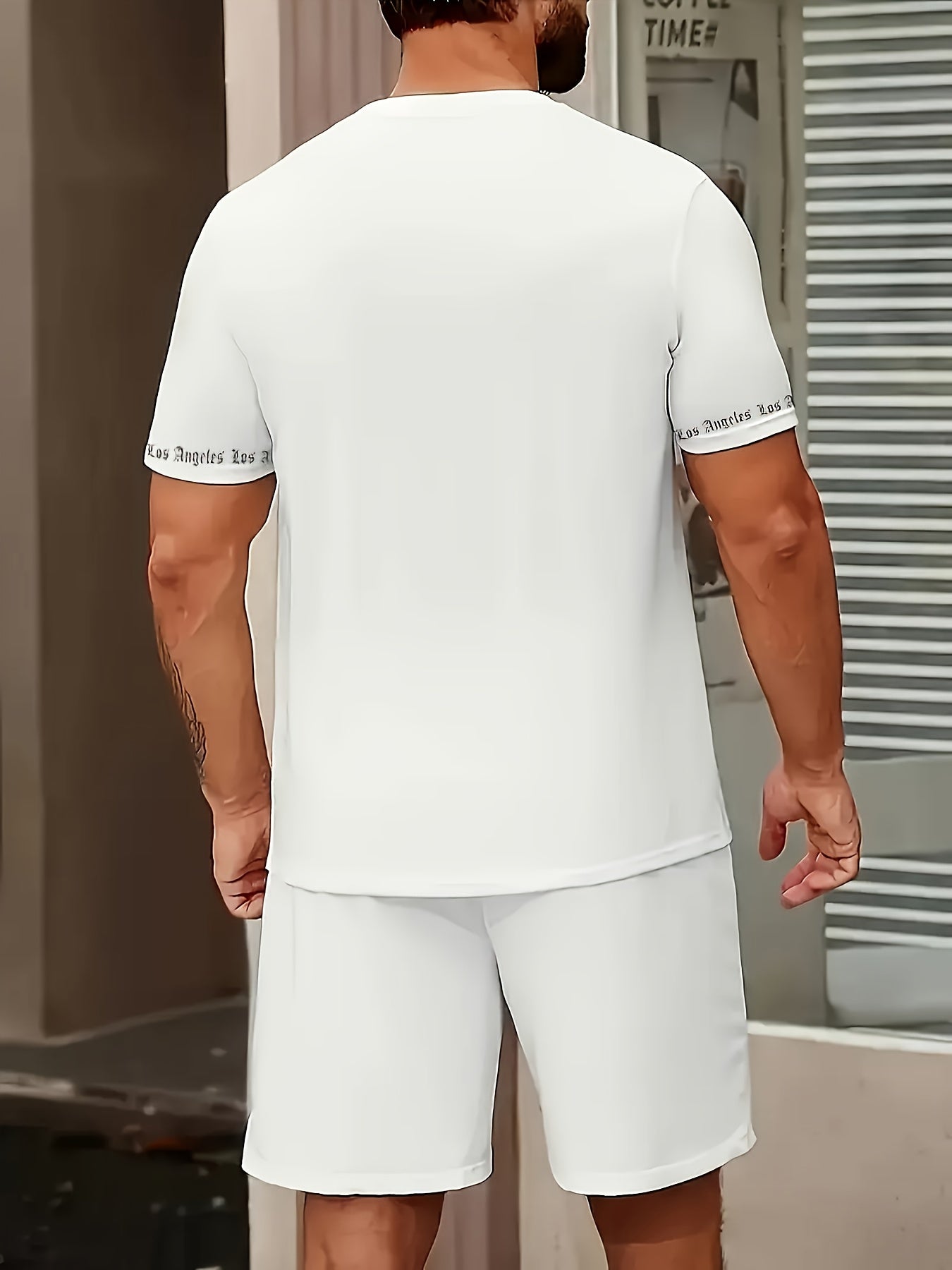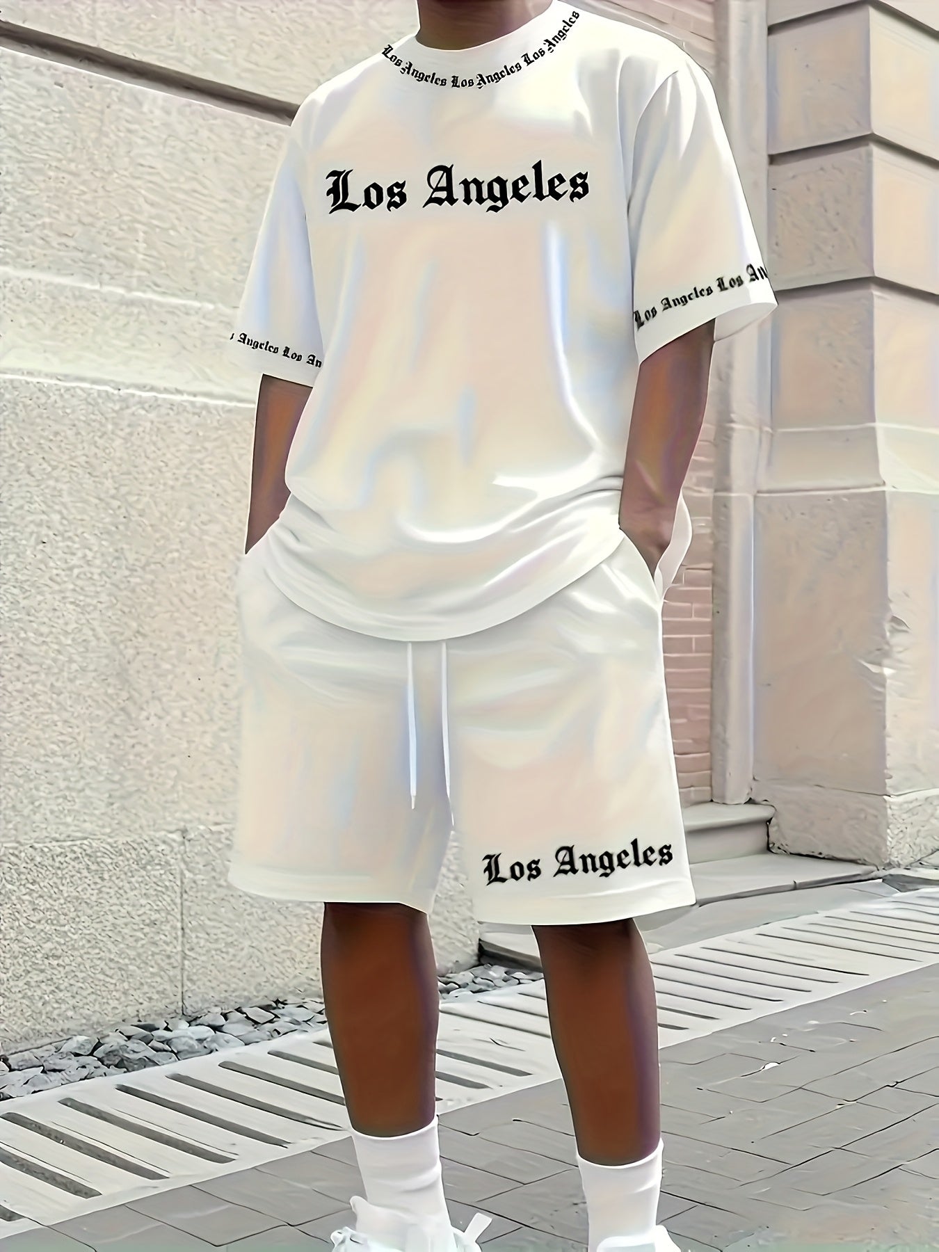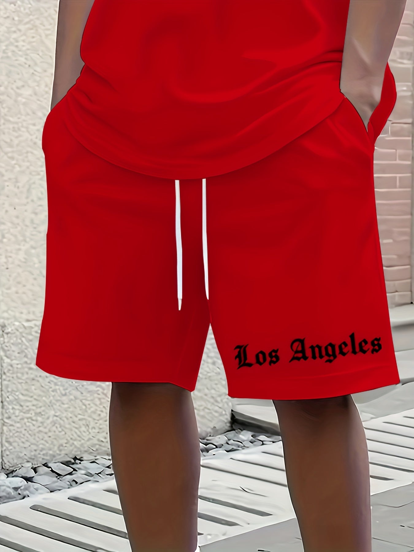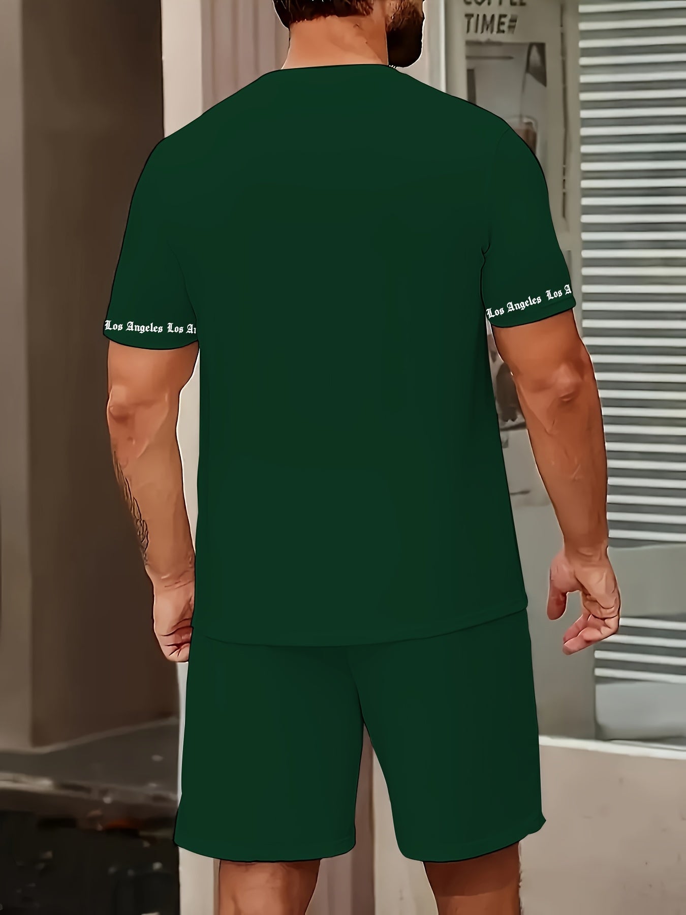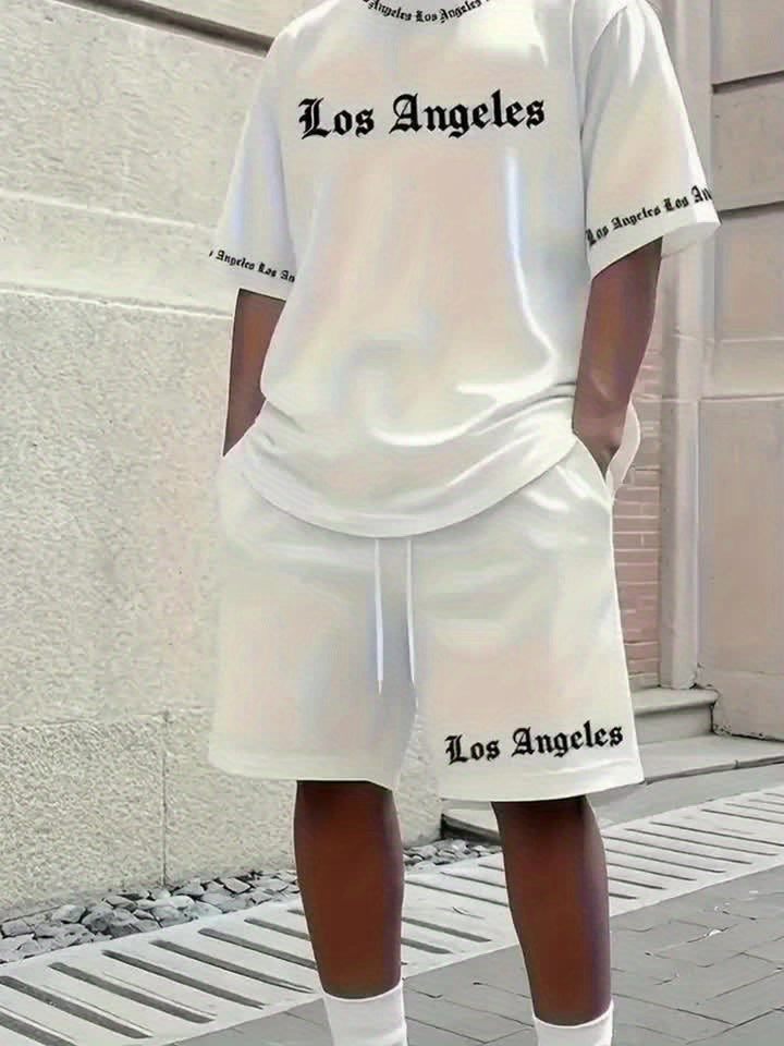 Men'S Los Angeles Graphic Print Casual Sportswear Set - Breathable Summer Short Sleeve T-Shirt & Drawstring Shorts with Pockets, Regular Fit, Crew Neck, Comfortable & Stylish for Casual Attire, Leisure Clothing | Trendy Sport