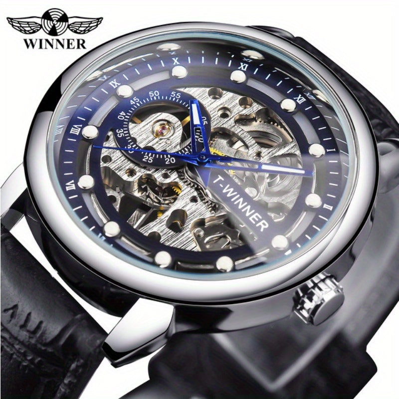 Men'S Luxury Mechanical Skeleton Watch with Golden-Tone Alloy Case & Faux Leather Strap - Mechanical Hand-Wind, World Time, Date Display, Elegant Fashion Accessory for Casual Attire, Mechanical Watch, Sophisticated Design, In