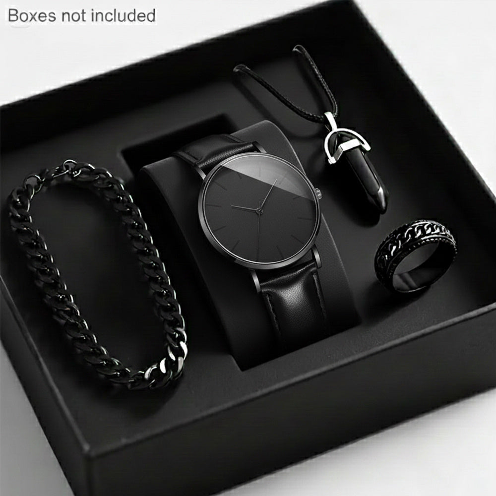 Men'S Luxury Quartz Wristwatch and Jewelry Set | Black Analog Watch with Dual Display, Includes Matching Bracelet, Necklace, and Ring - Ideal for Birthdays, Christmas, Ramadan