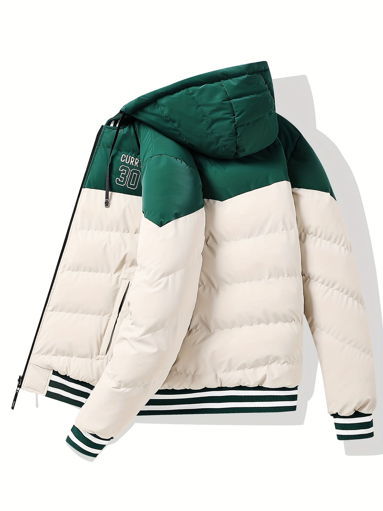 Men's Modern Streetwear Hooded Jacket with Embroidered Lettering, Color-Block Design, Removable Hood & Polyester Fill - Machine Washable Long Sleeve Coat with Pockets for Fall Winter Casual Wear