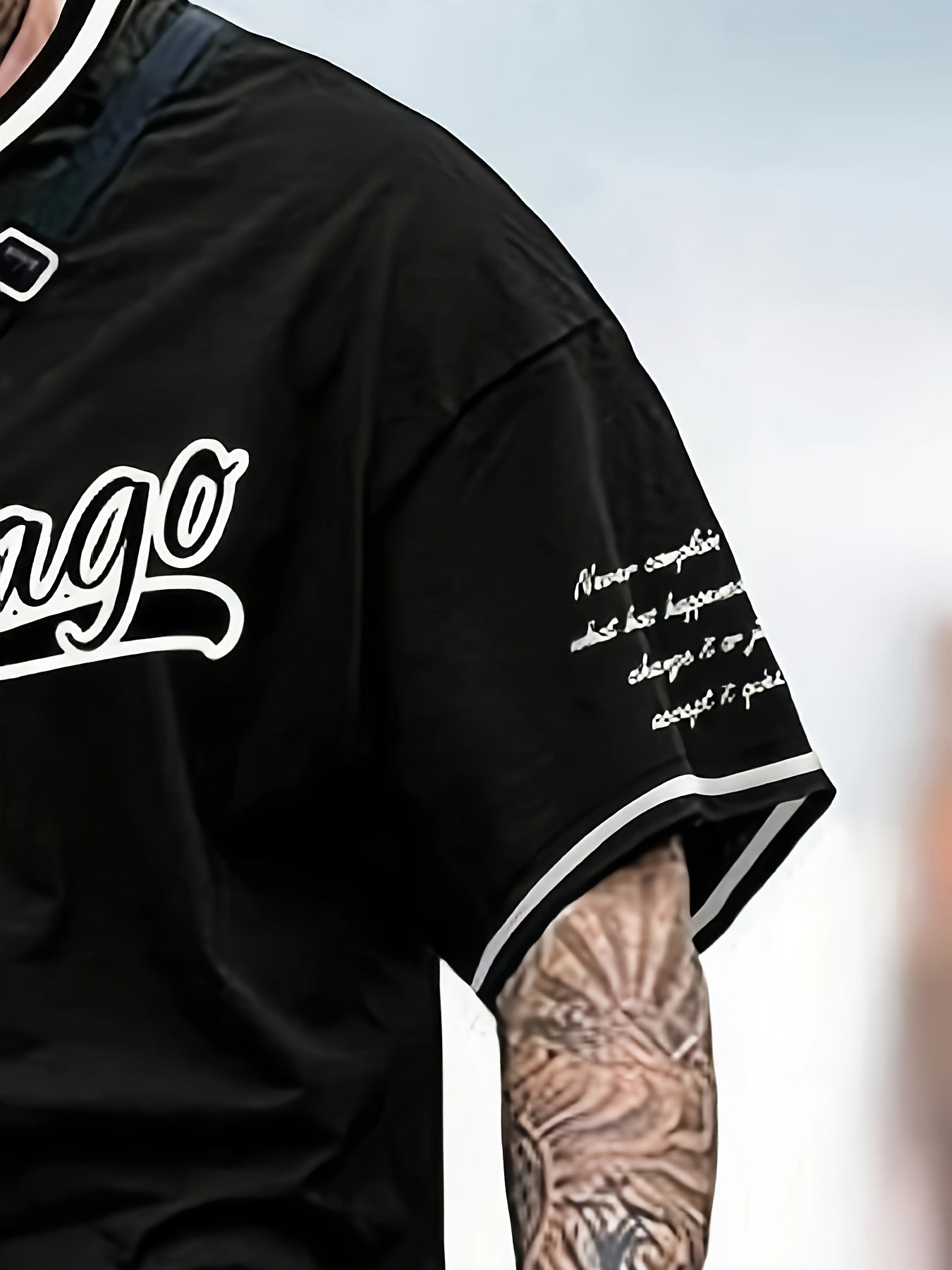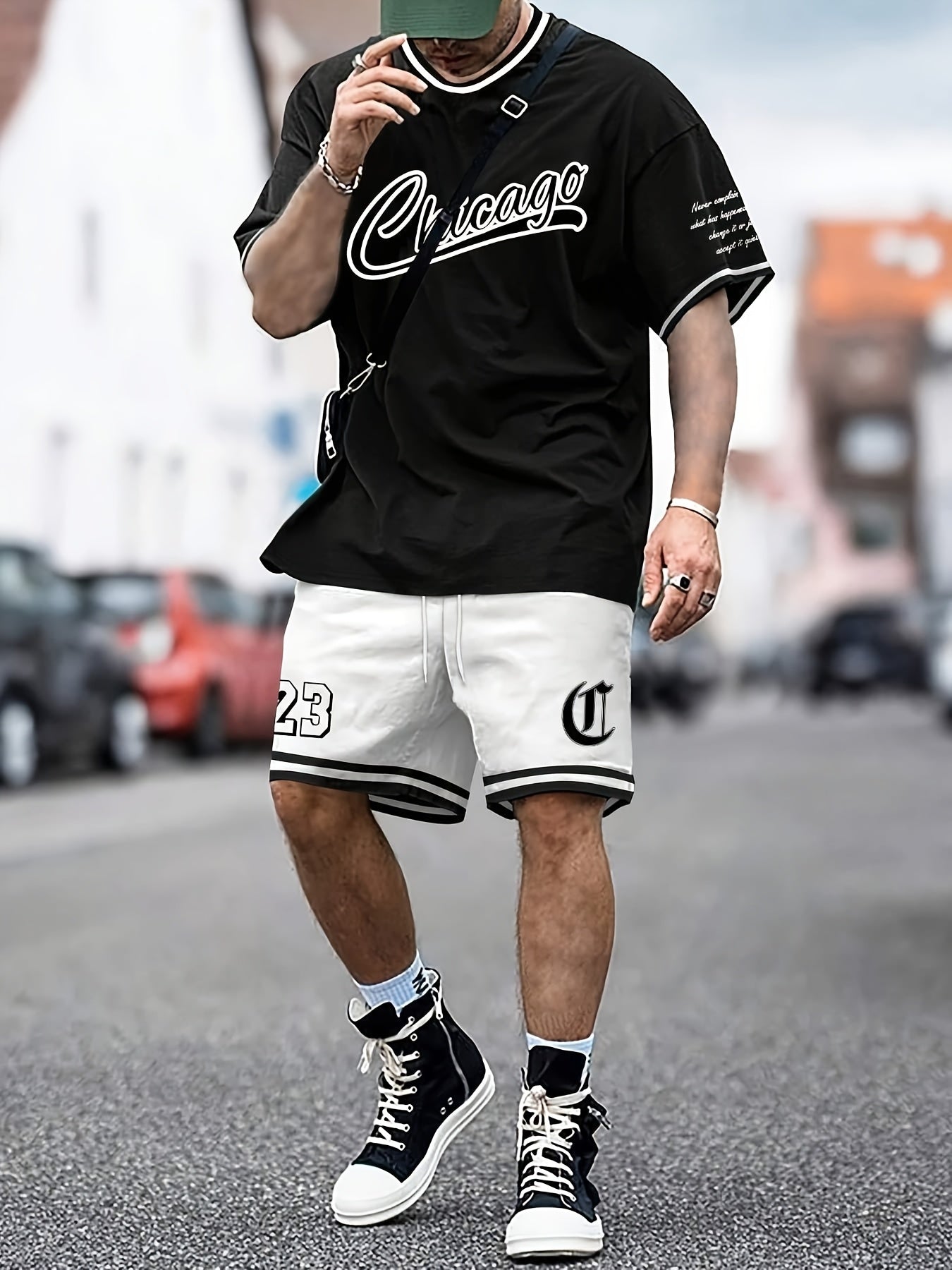 Men's Outfit, Chicago Graphic Print Casual Crew Neck Short Sleeve T-Shirt & Shorts 2-piece Set For Summer Outdoor Activities