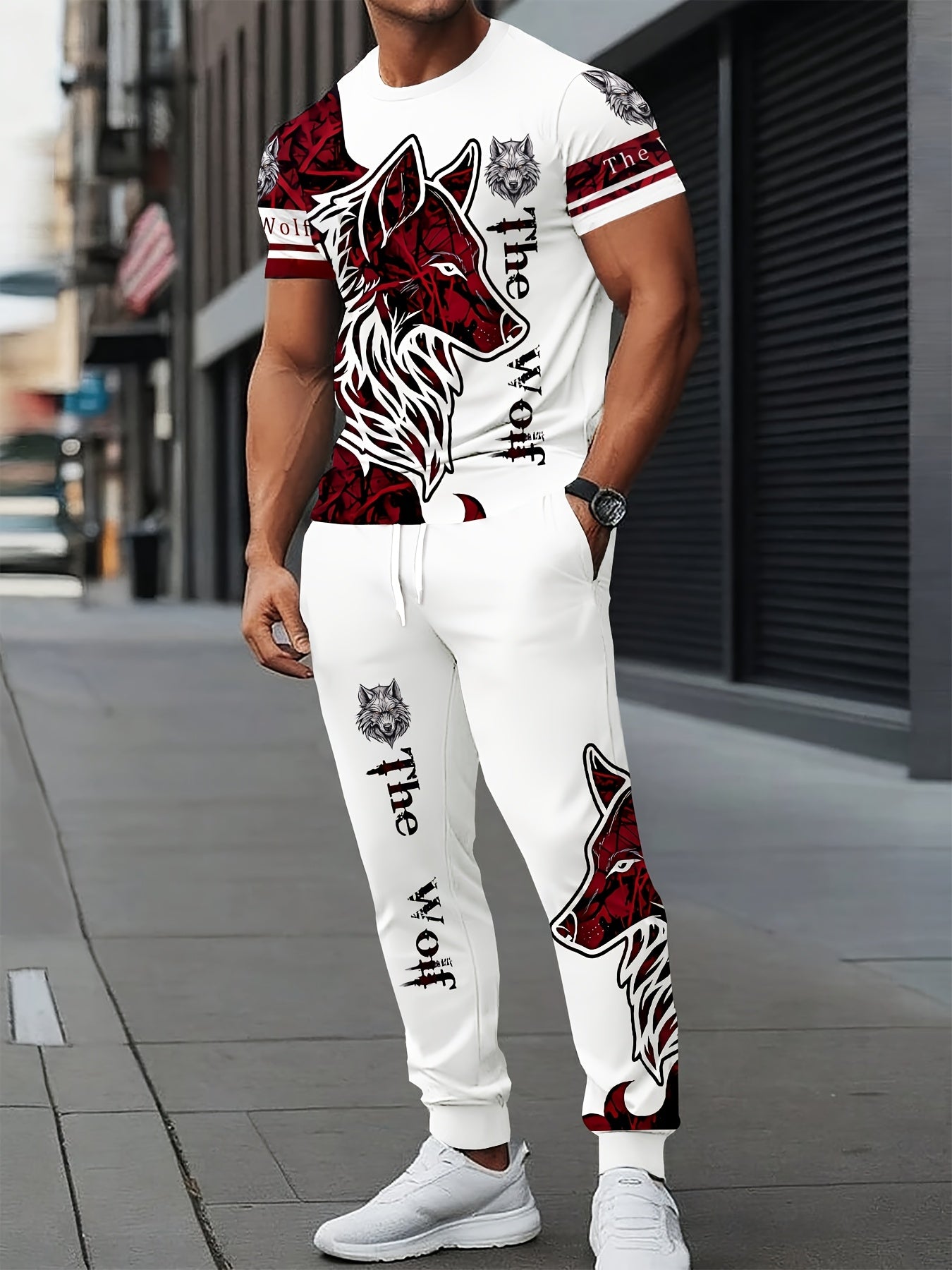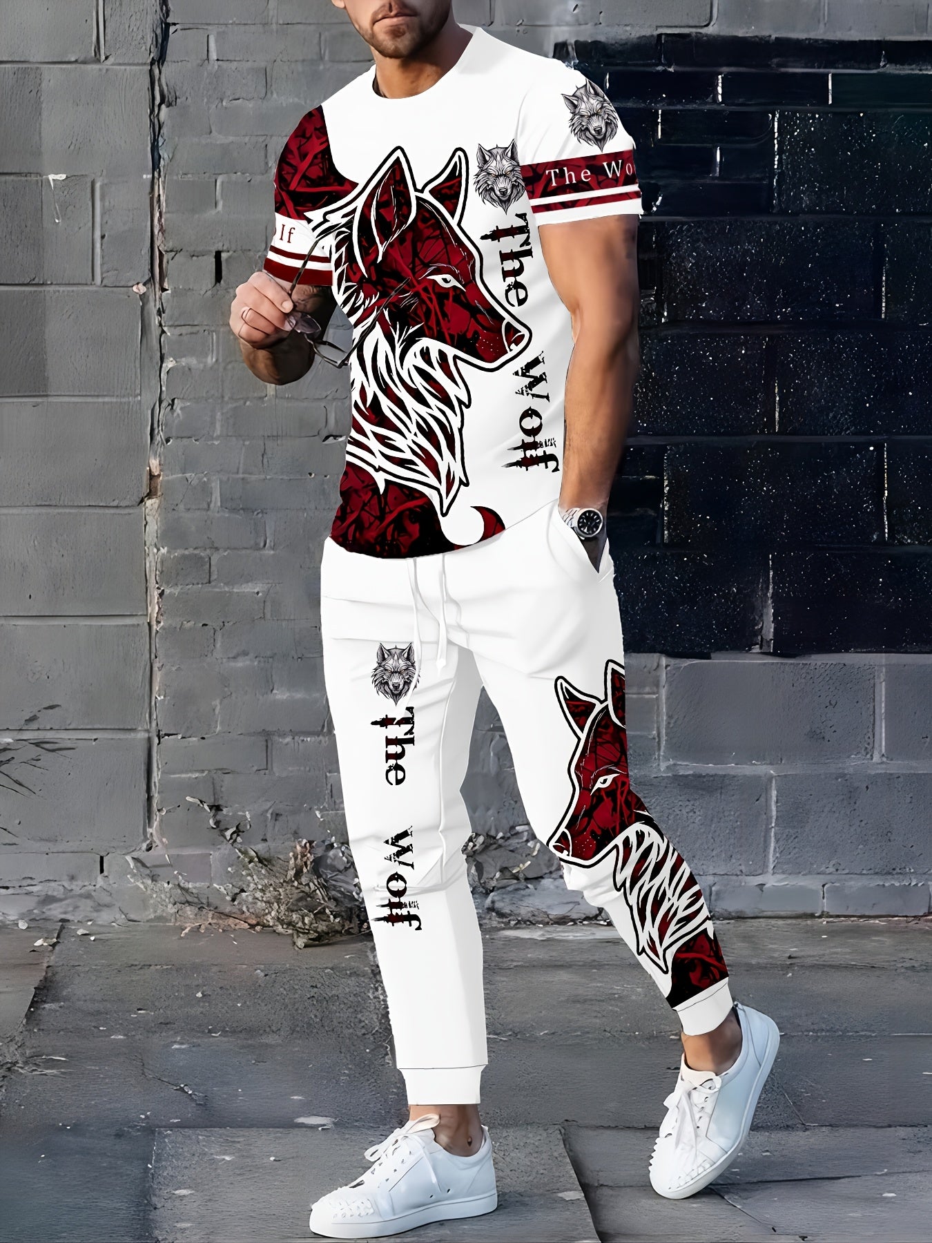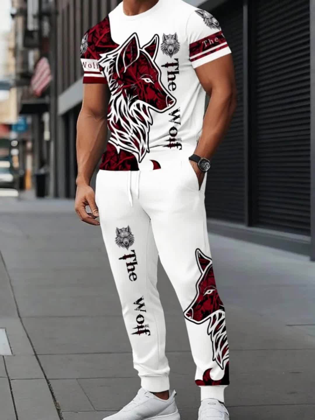 Men's polyester sportswear | Elegant and casual round neck with a Wolf head | Slightly elastic knitted strap with 3D printing | 2pcs set with normal style | Patterned short-sleeved T-shirt and trousers