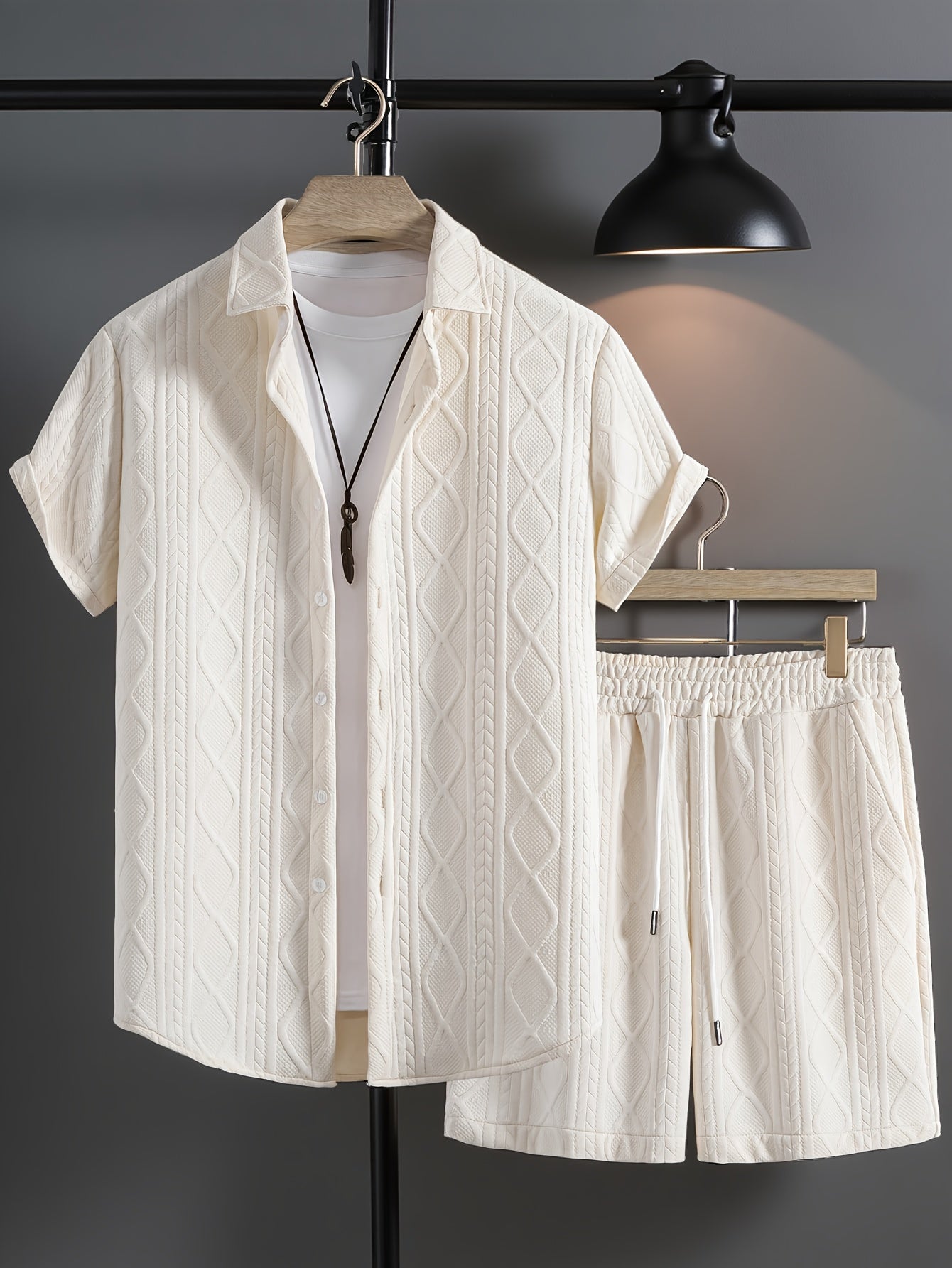 Men's Set Shirt Short Sleeve Shorts Thick Solid Color Knit Jacquard Casual Comfort High-Quality Two-Piece Set