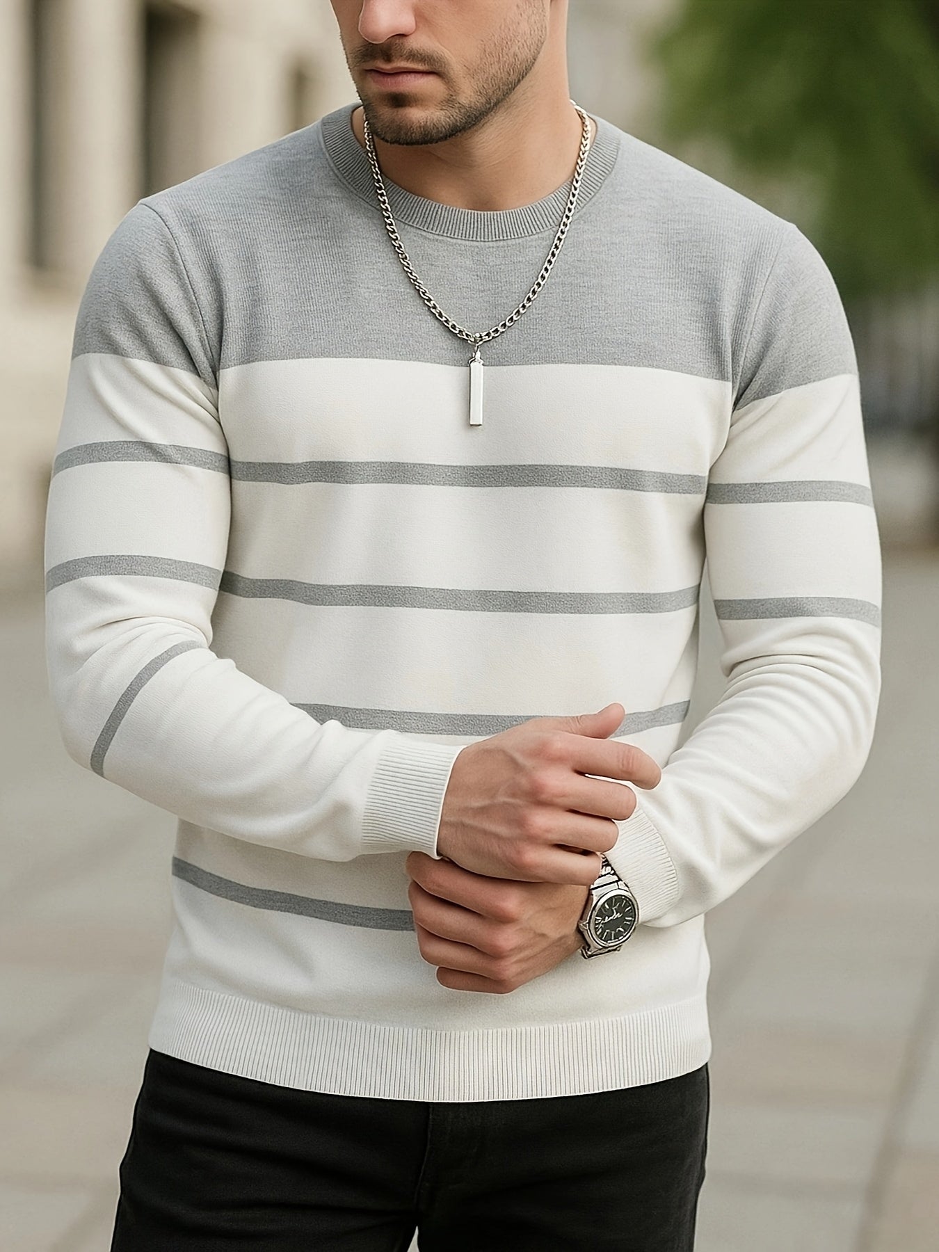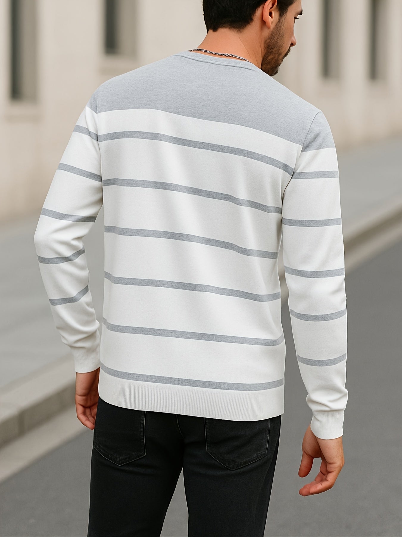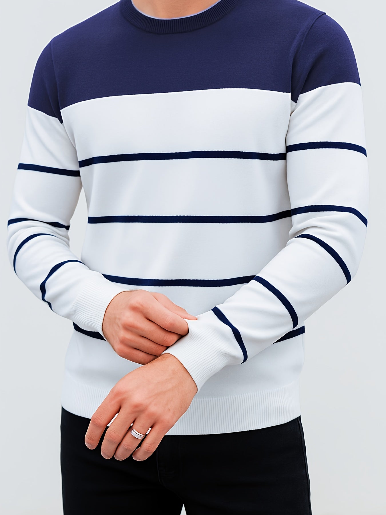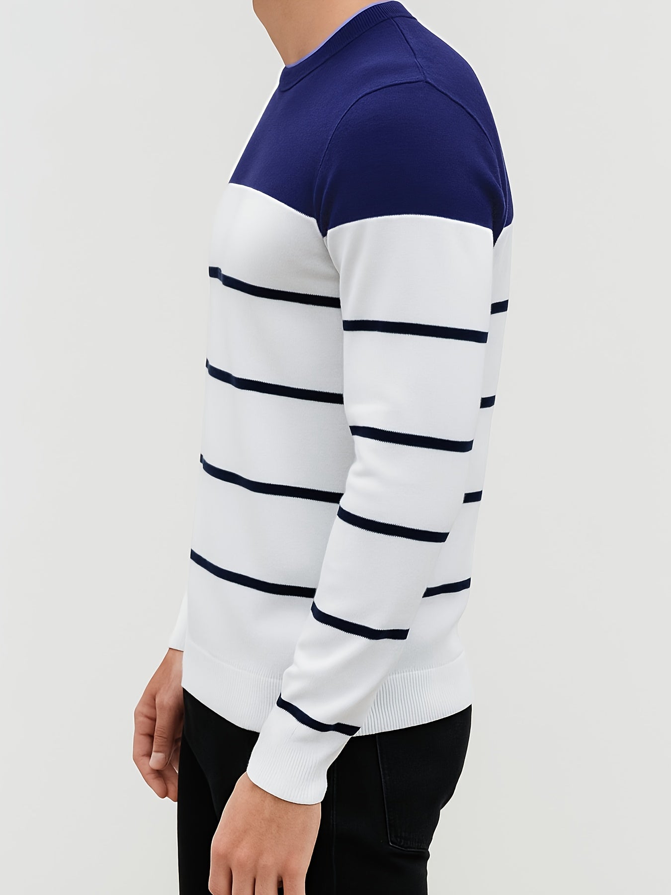 Men's Slim-Fit Striped Knit Sweater - All-Season Business Casual & Casual Attire, Navy Blue/White Horizontal Stripes with Contrast Trim, Round Neck Long Sleeve Pullover, Multi-Color Options (Black/Beige/Light Brown/Navy) - Co