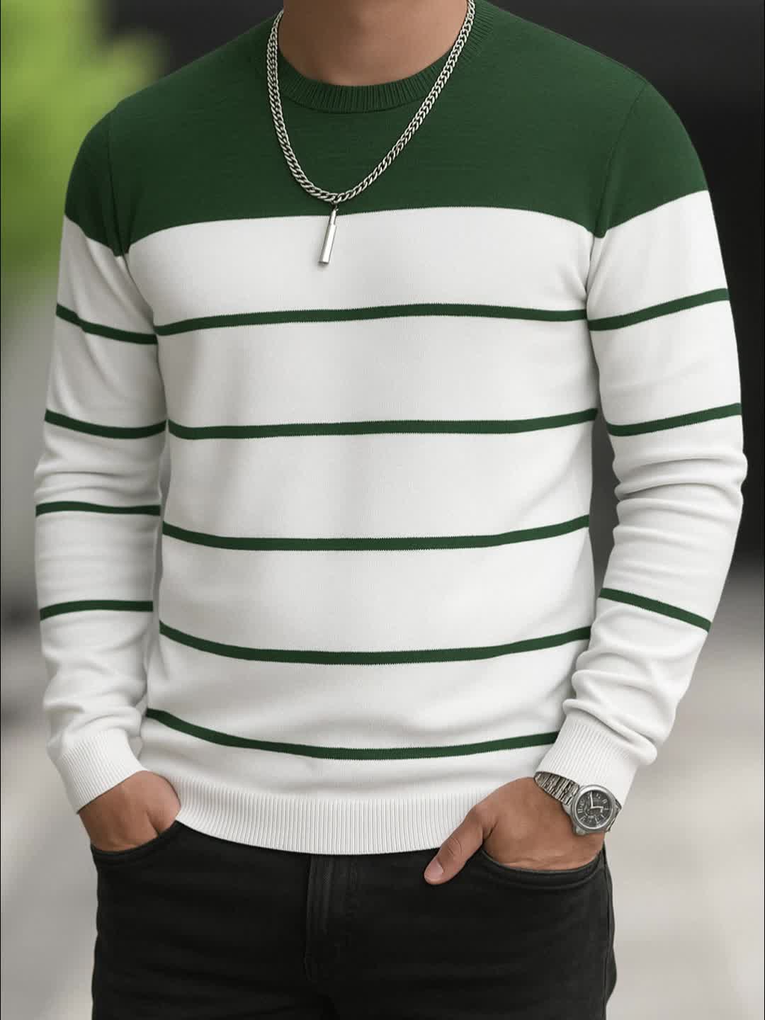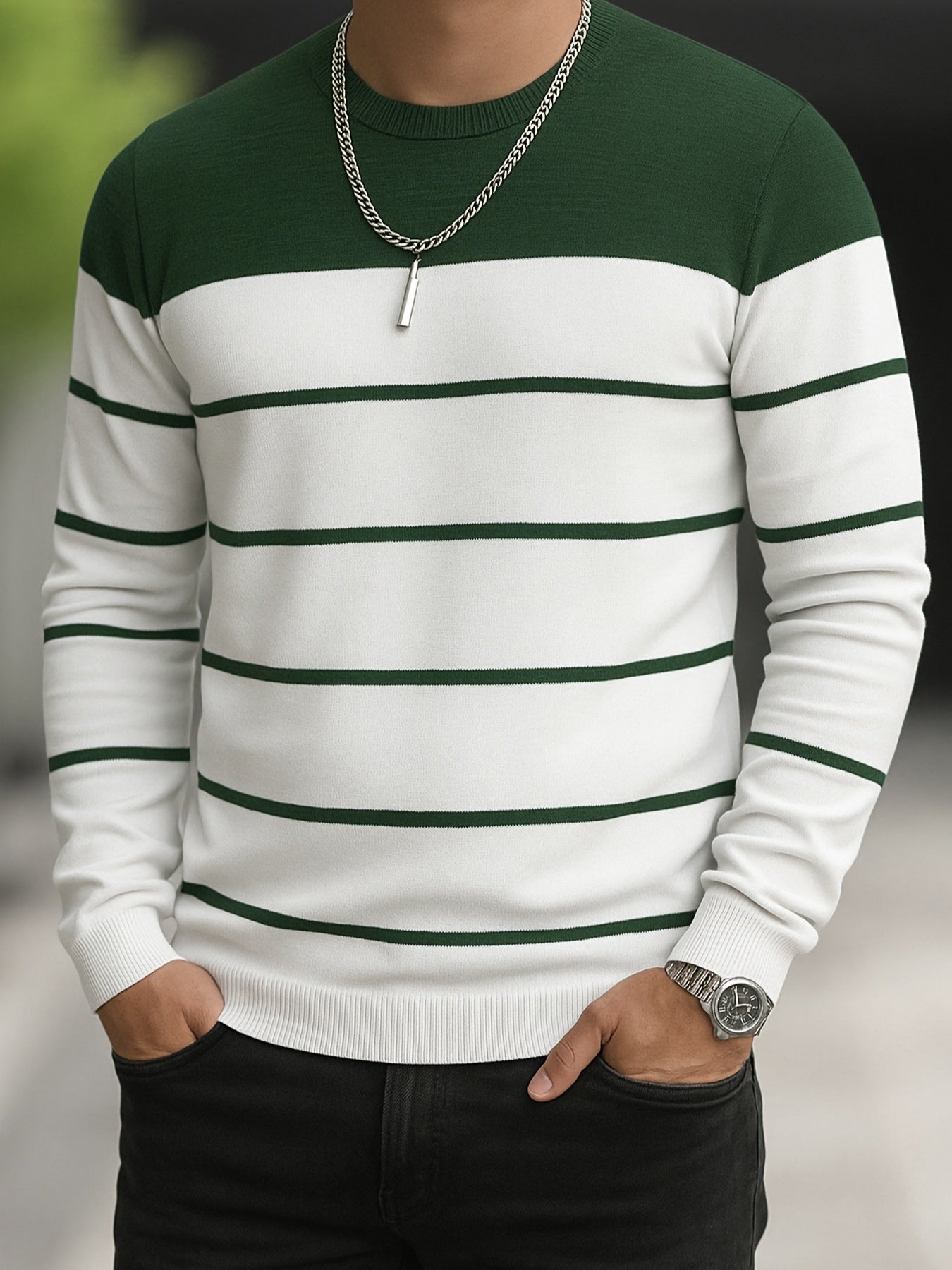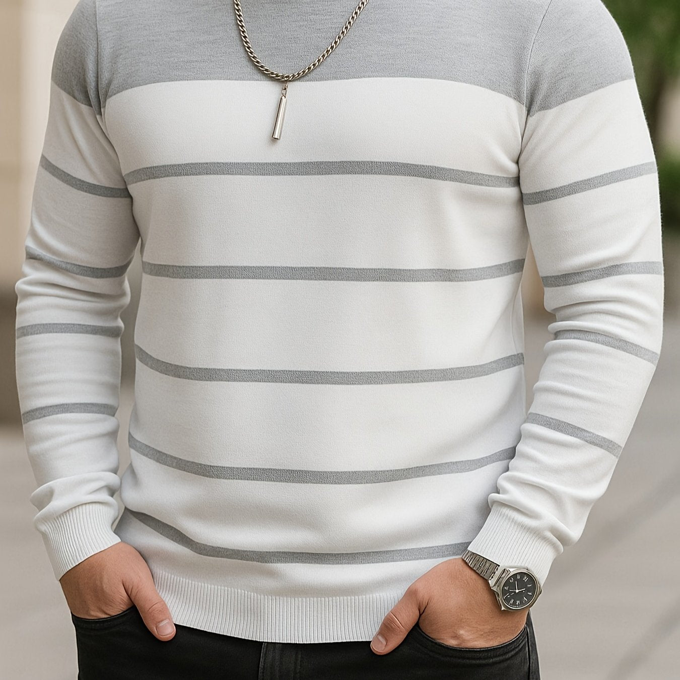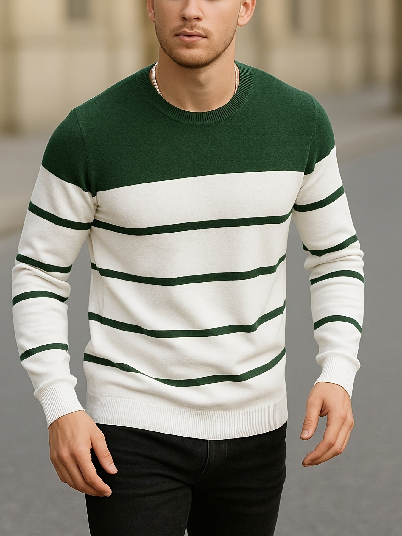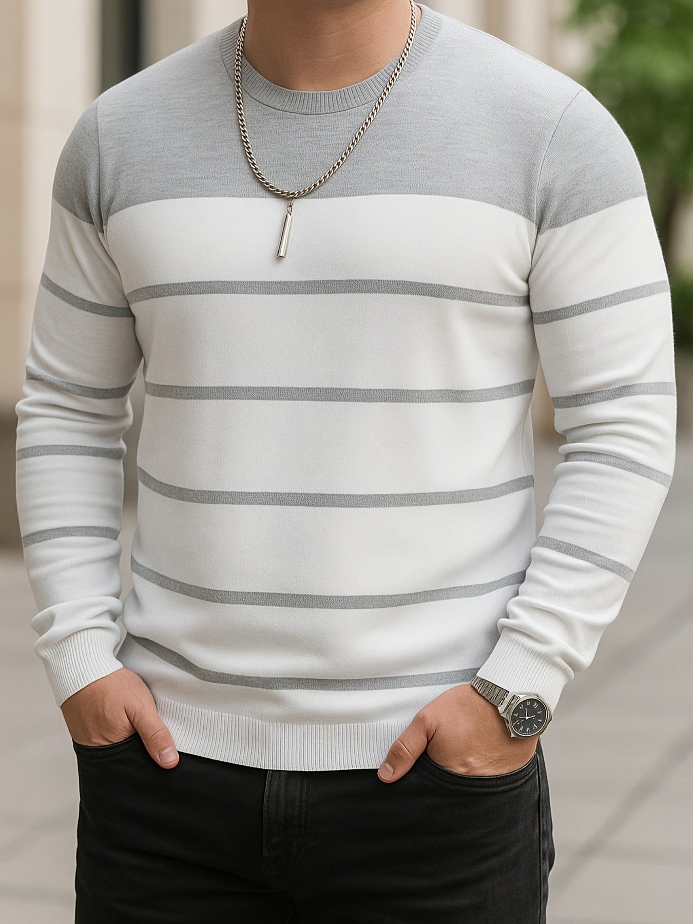 Men's Slim-Fit Striped Knit Sweater - All-Season Business Casual & Casual Attire, Navy Blue/White Horizontal Stripes with Contrast Trim, Round Neck Long Sleeve Pullover, Multi-Color Options (Black/Beige/Light Brown/Navy) - Co