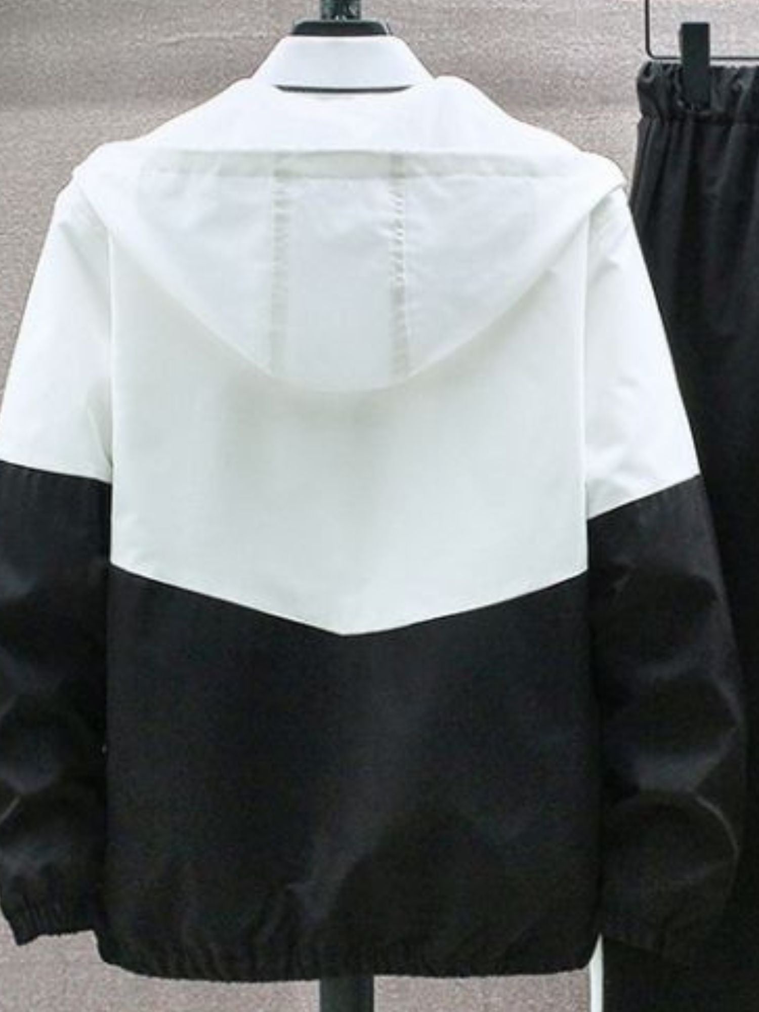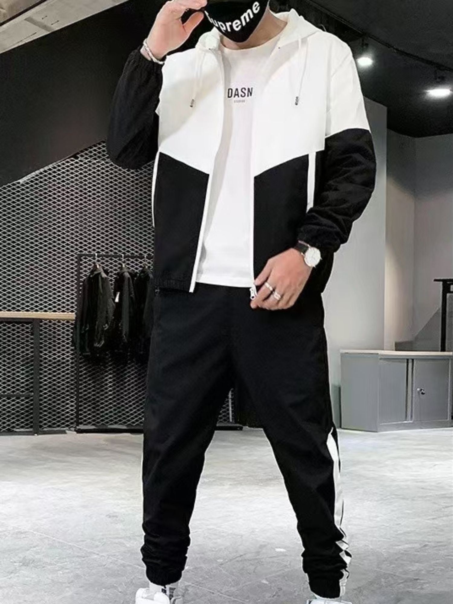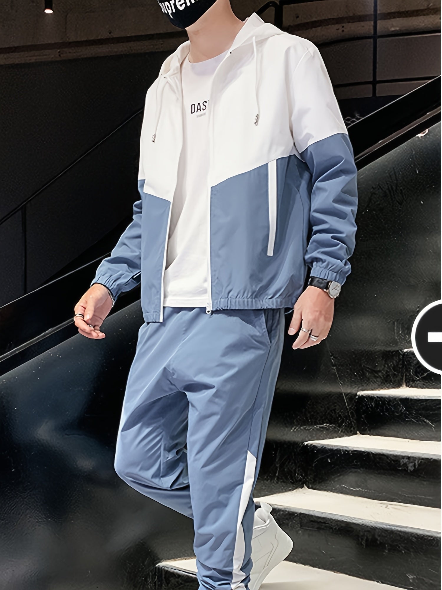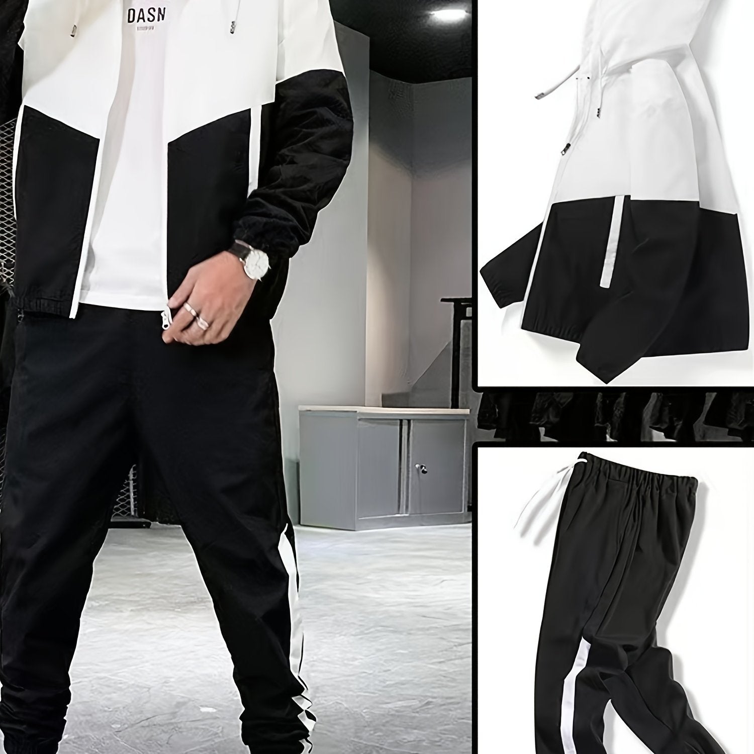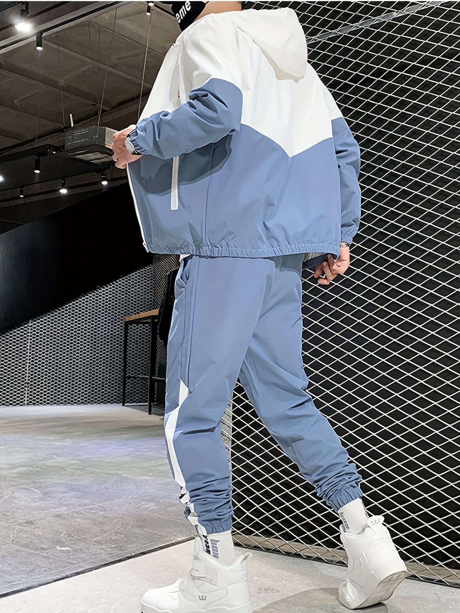 Men's Spring Autumn Outdoor Sports Training Casual Color Block Stitched Hoodie Adjustable Set Home Top and Pants Fashionable Windproof Jacket Pants Two-Piece Suit