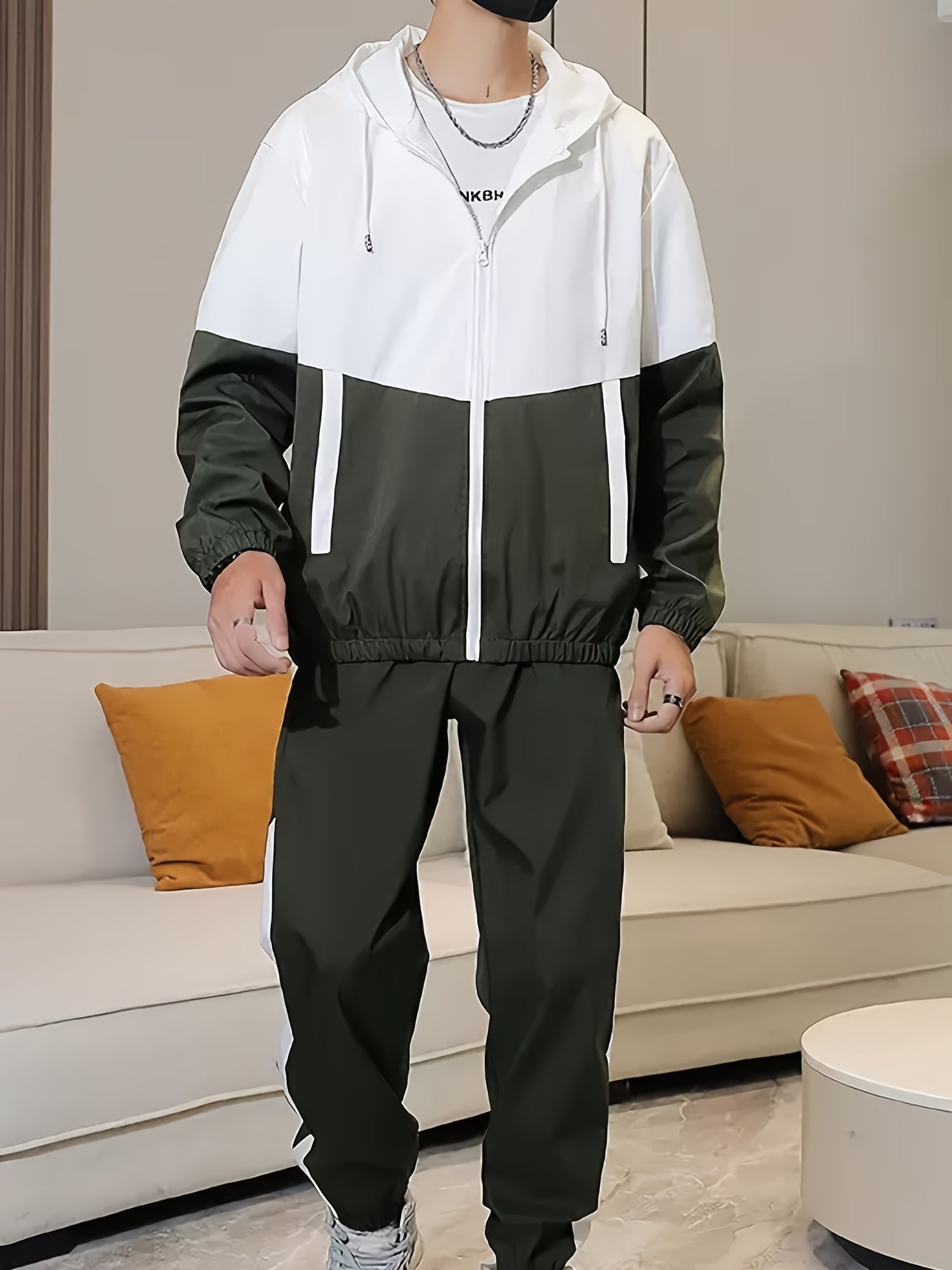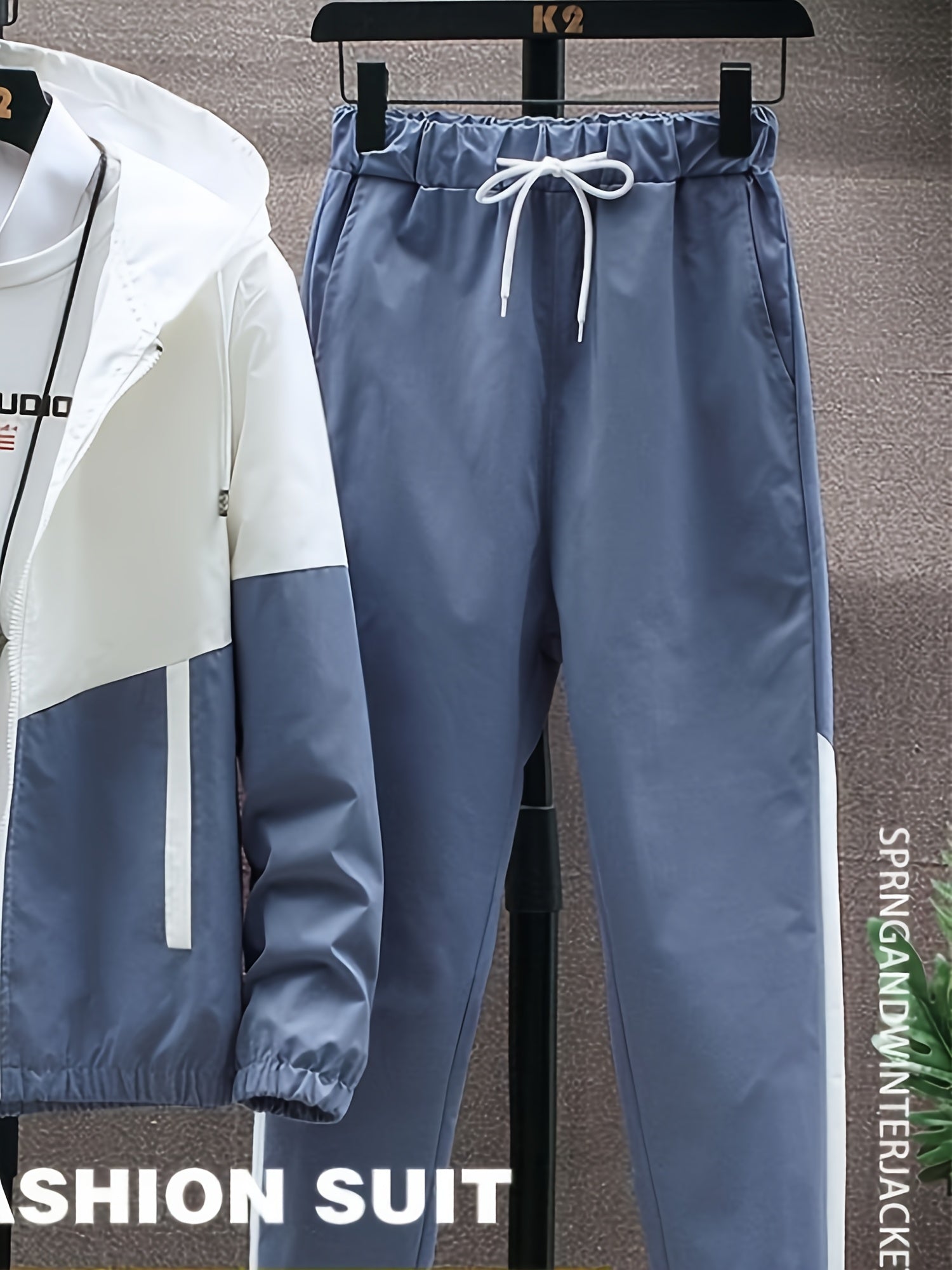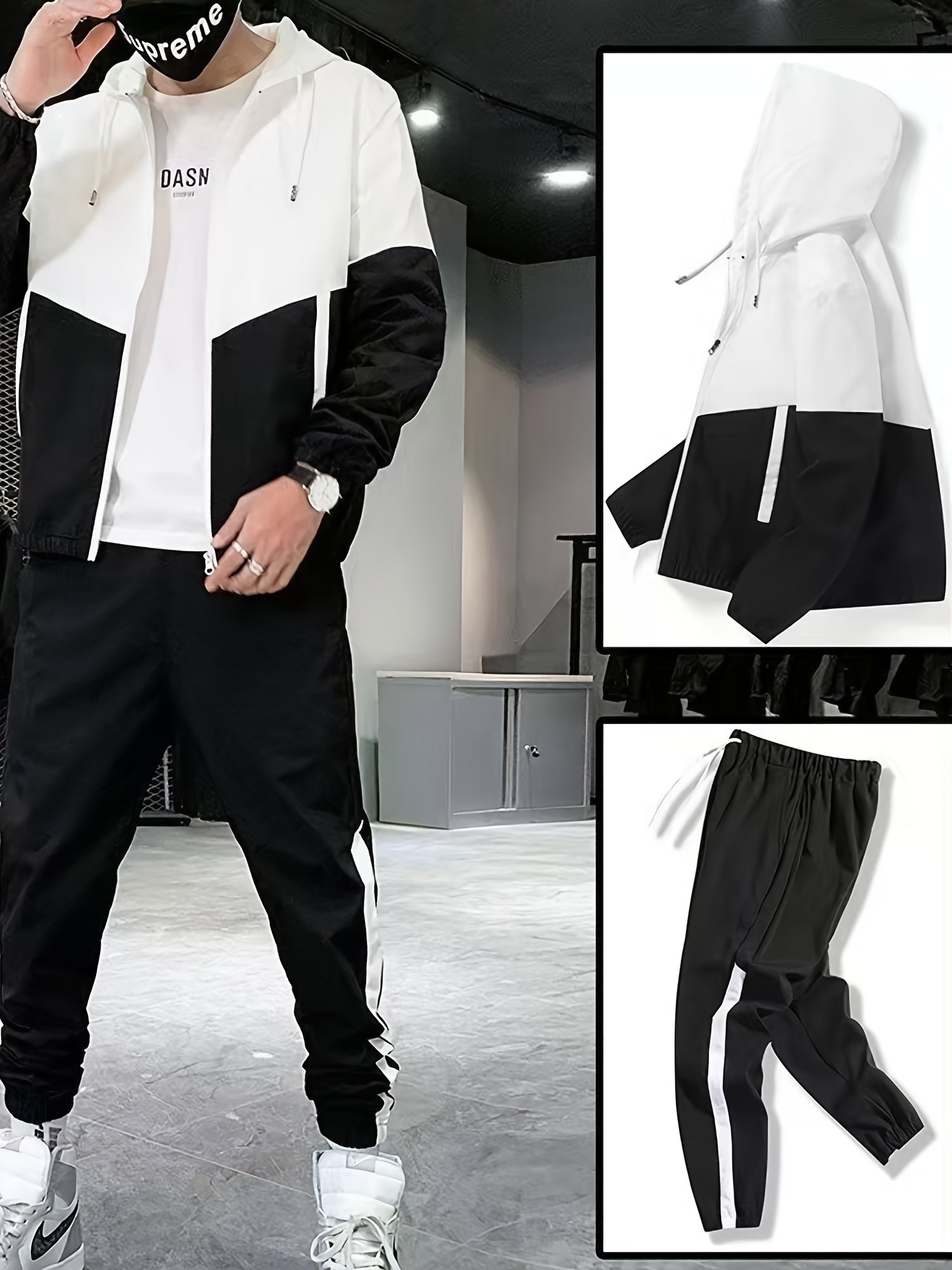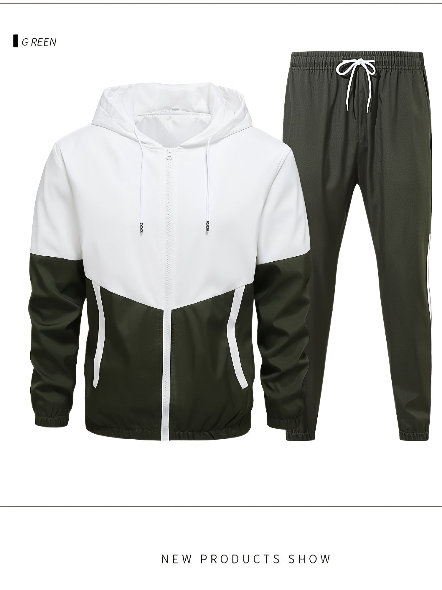 Men's Spring Autumn Outdoor Sports Training Casual Color Block Stitched Hoodie Adjustable Set Home Top and Pants Fashionable Windproof Jacket Pants Two-Piece Suit