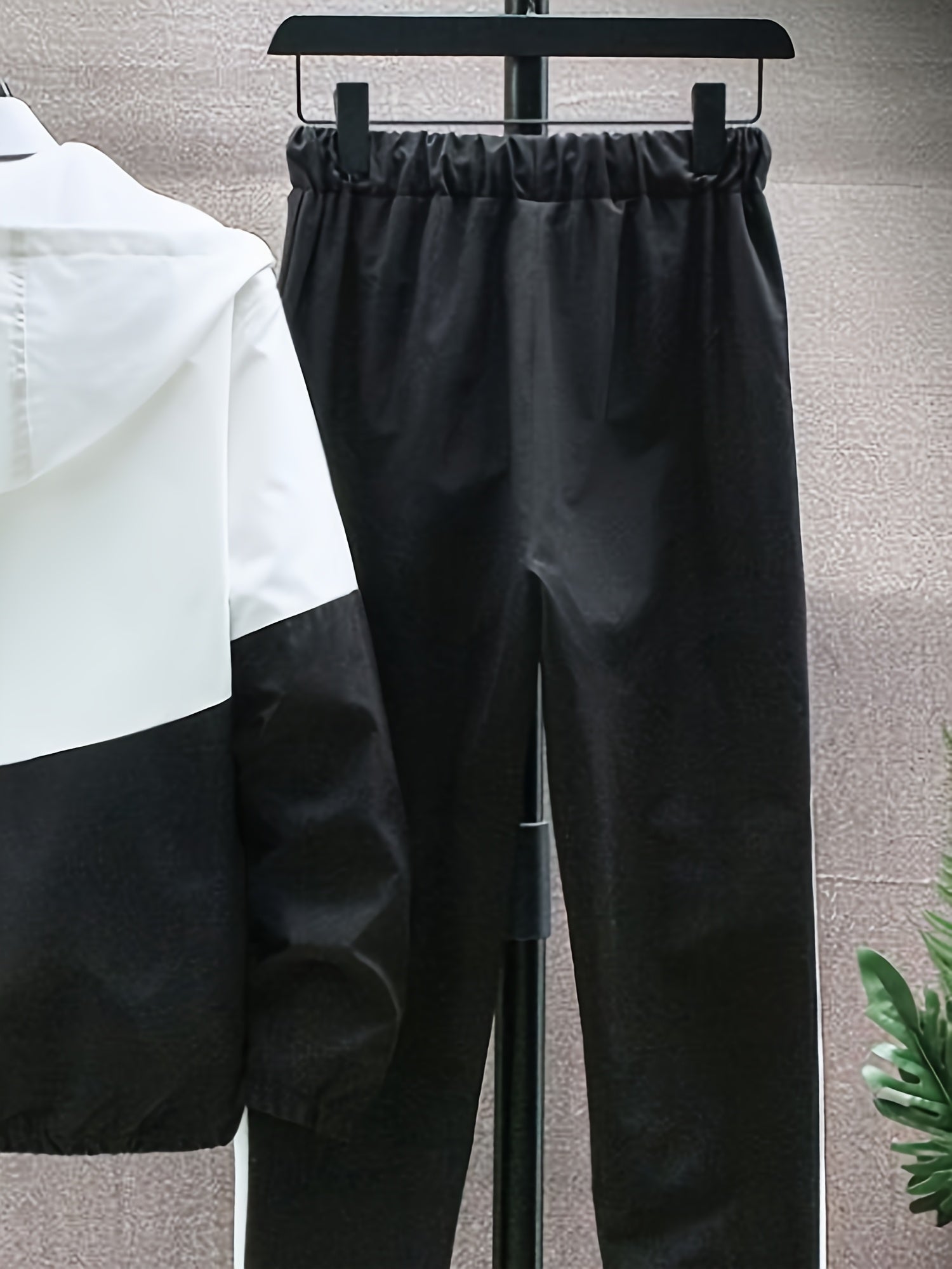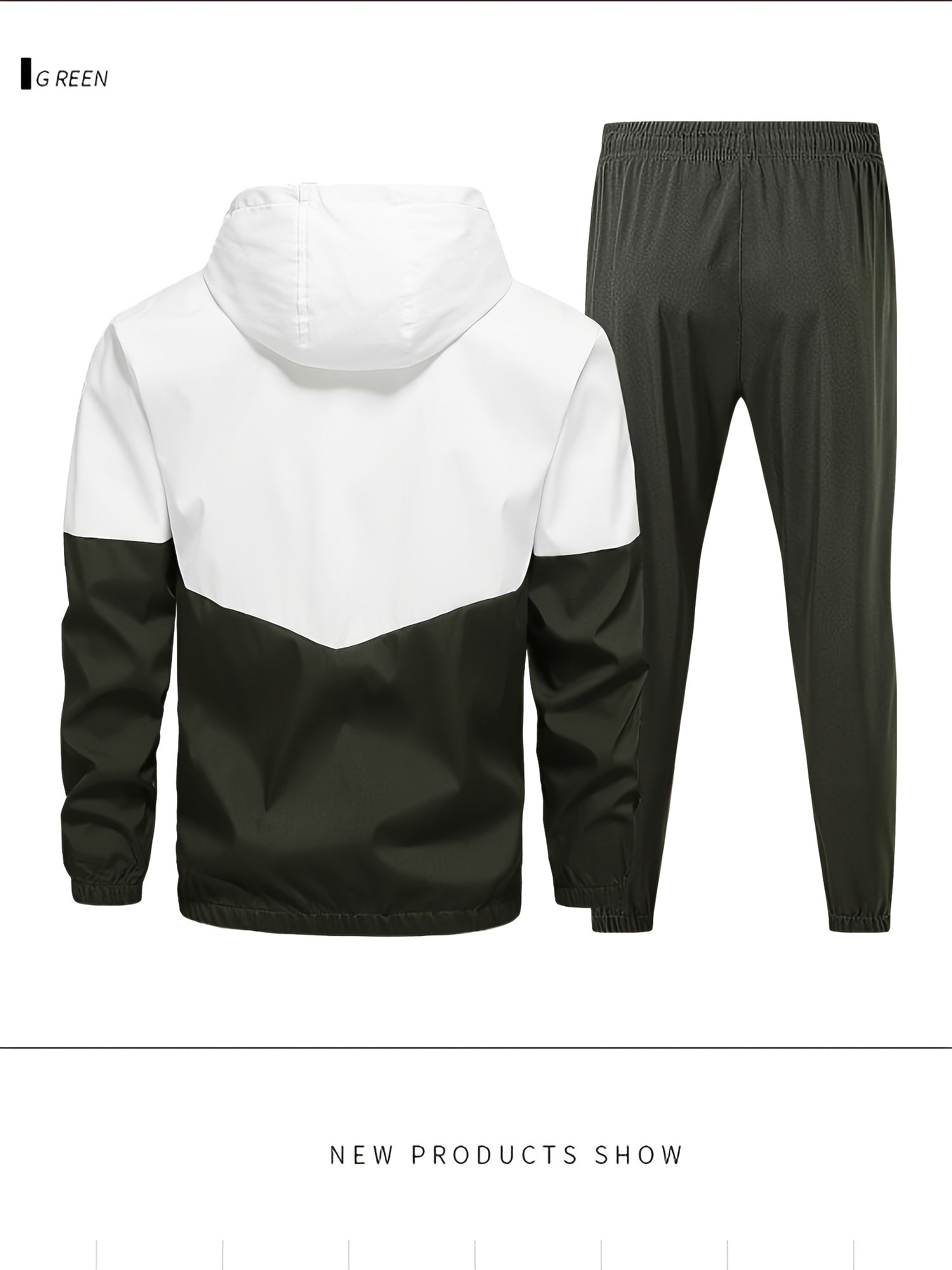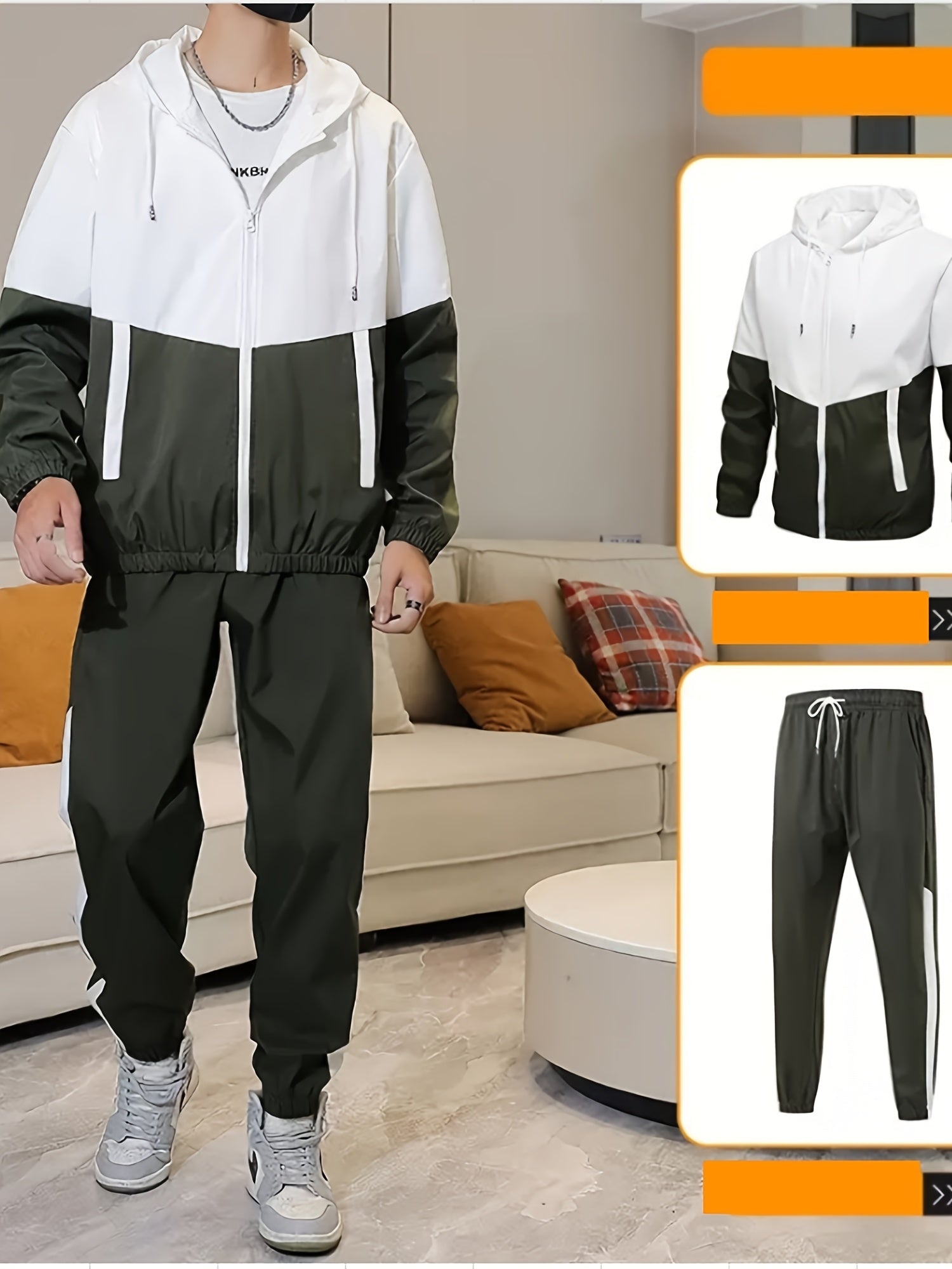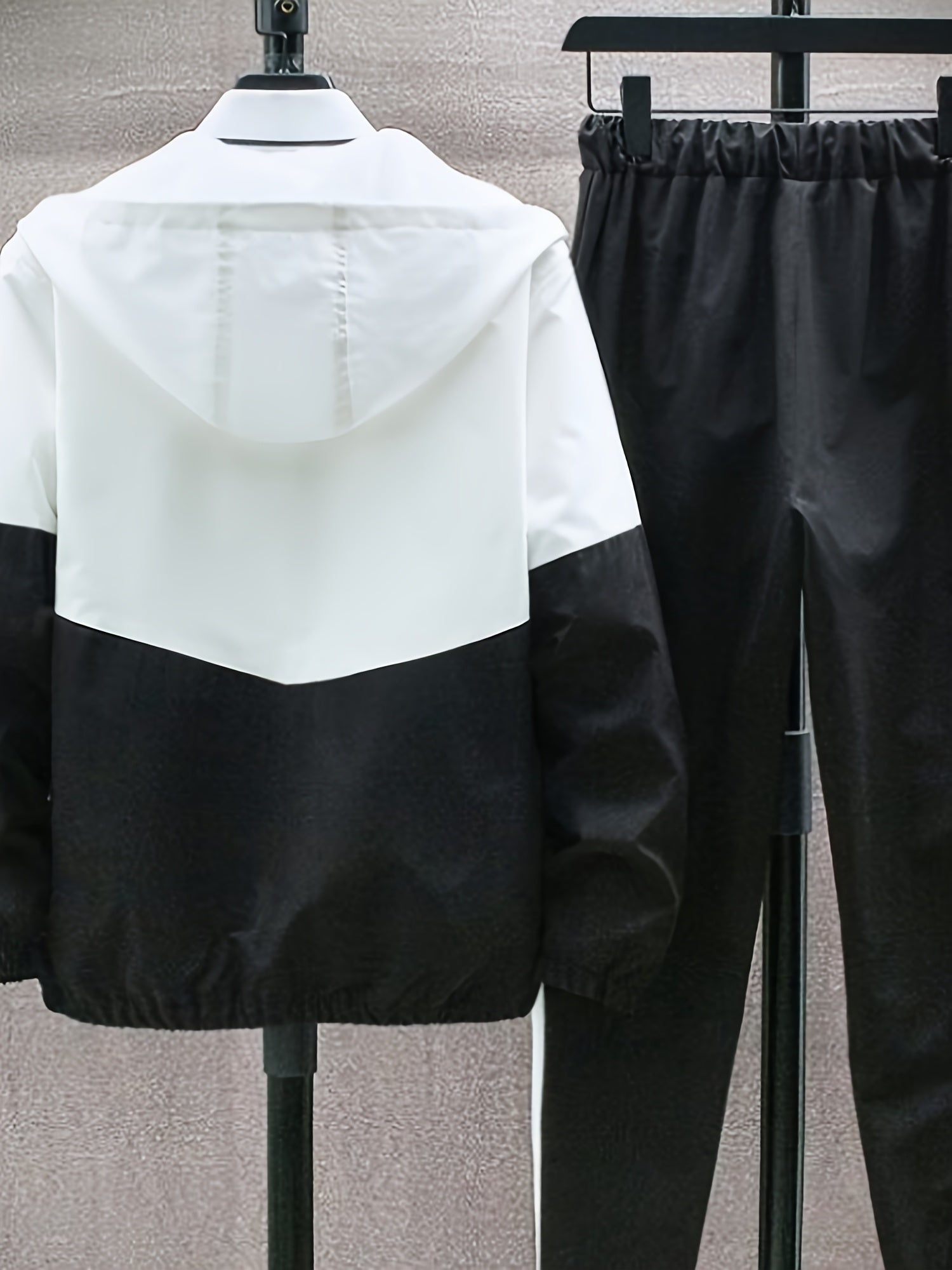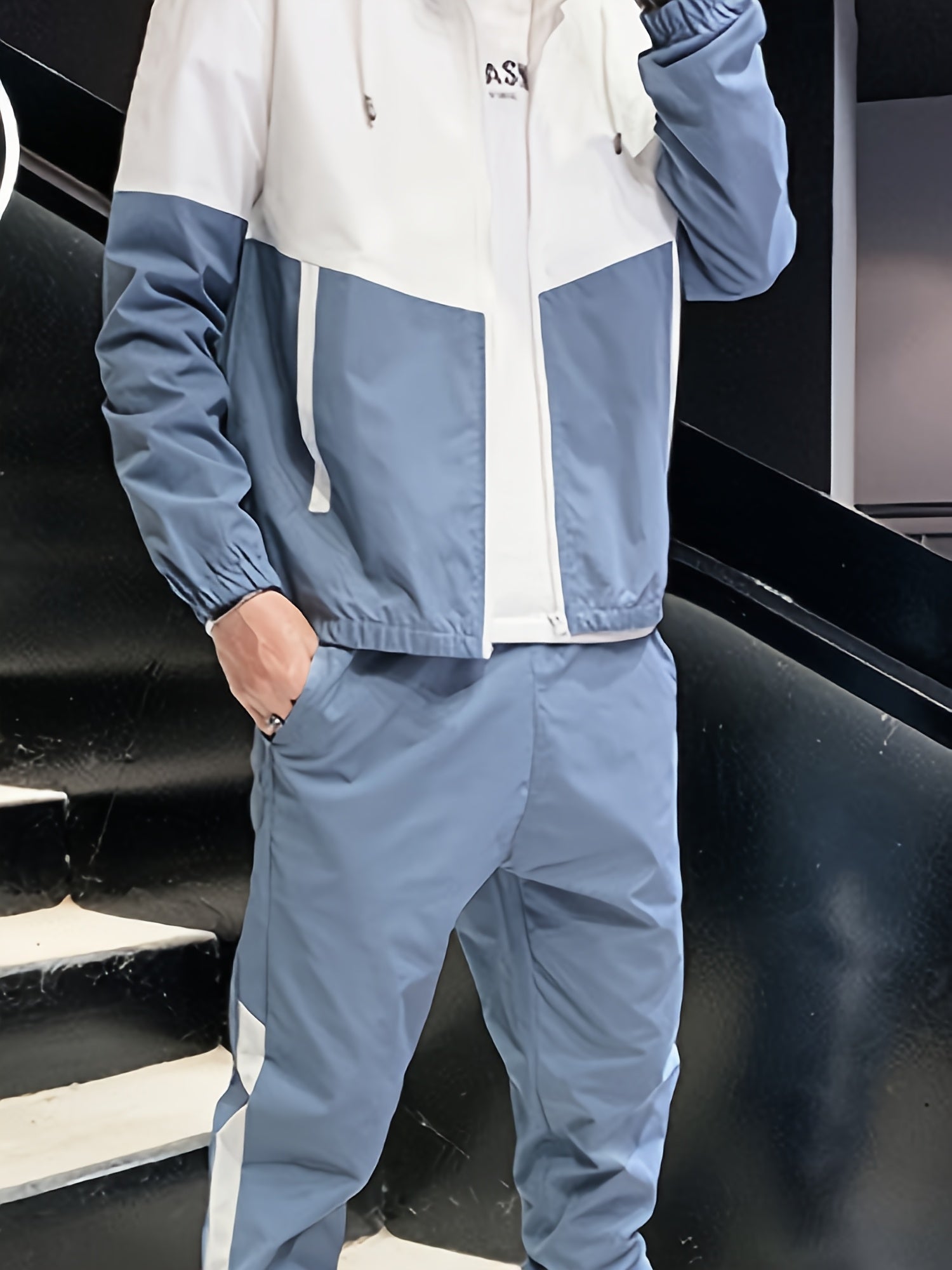 Men's Spring Autumn Outdoor Sports Training Casual Color Block Stitched Hoodie Adjustable Set Home Top and Pants Fashionable Windproof Jacket Pants Two-Piece Suit