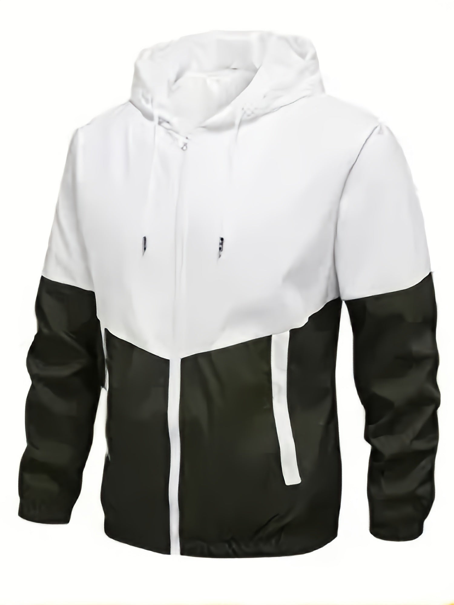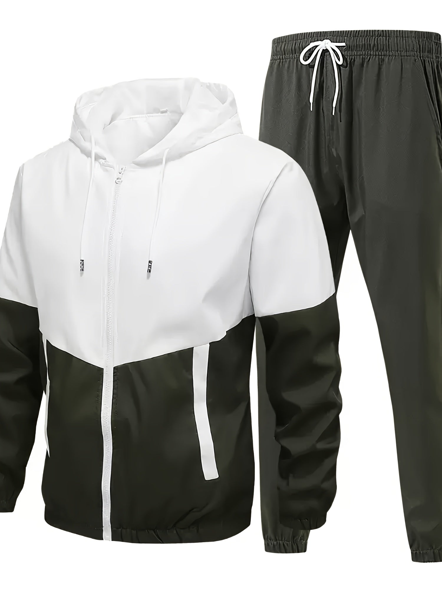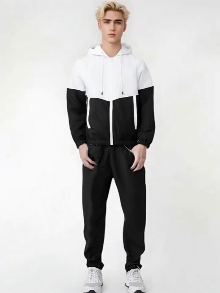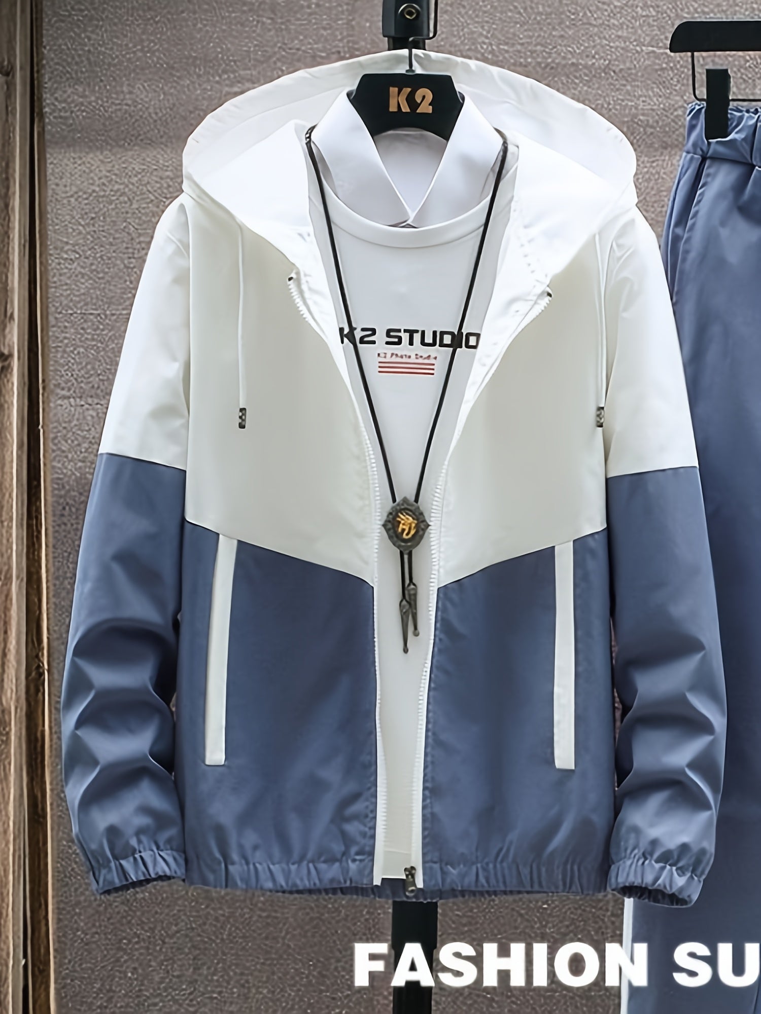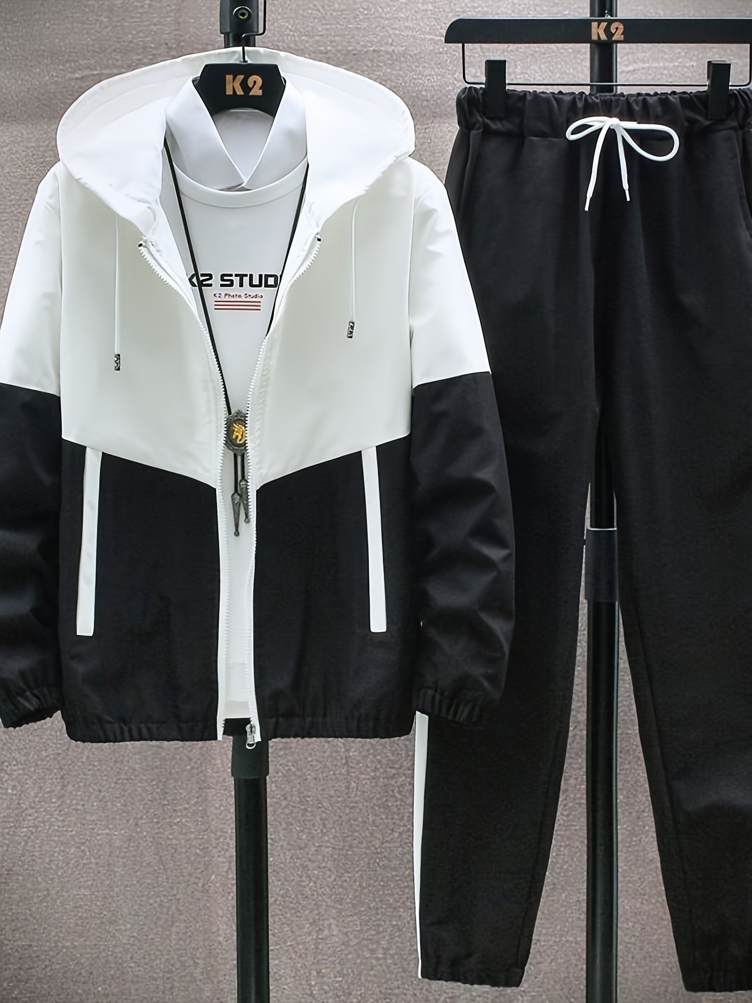 Men's Spring Autumn Outdoor Sports Training Casual Color Block Stitched Hoodie Adjustable Set Home Top and Pants Fashionable Windproof Jacket Pants Two-Piece Suit