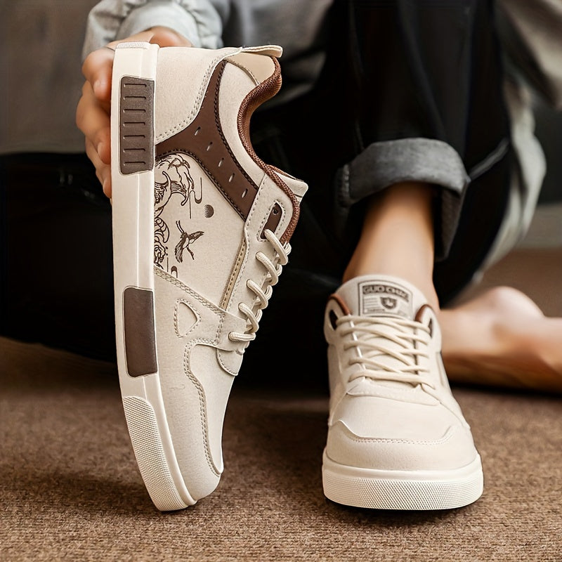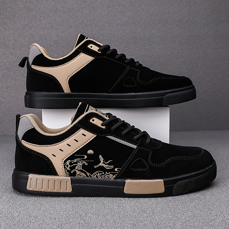 Men's Spring Collection Black and Beige Casual Sneakers - Anti-Slip, Odor-Resistant, Thick Rubber Sole for Height Boost, Lace-Up Sports Shoes with Fish Design