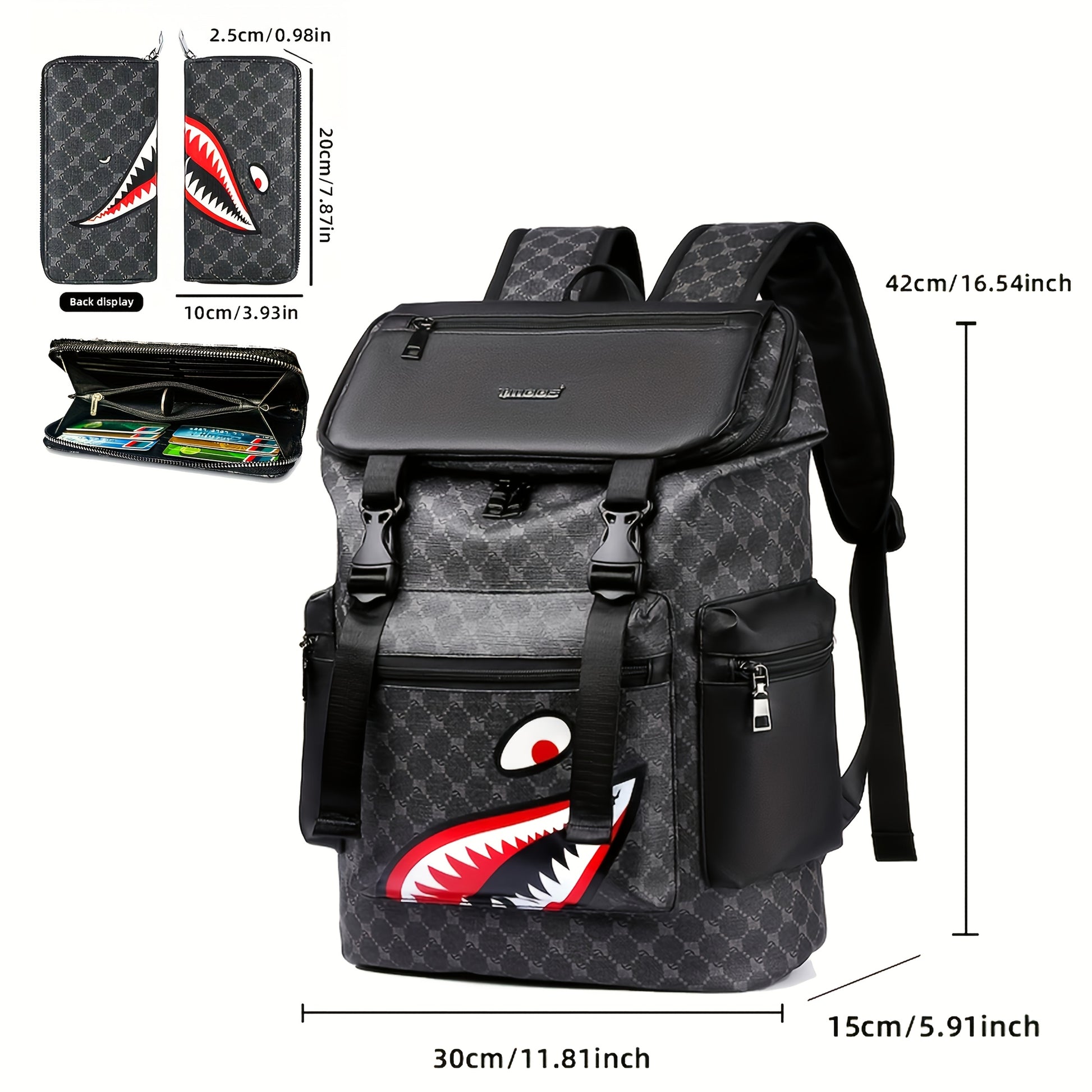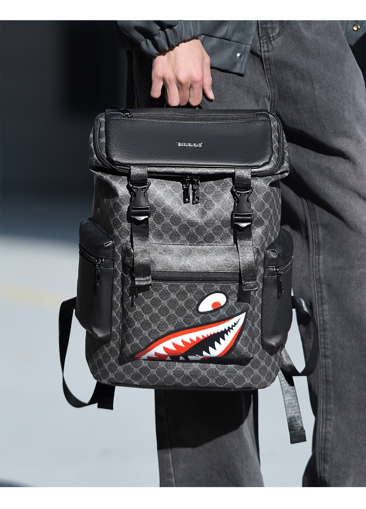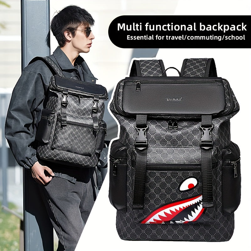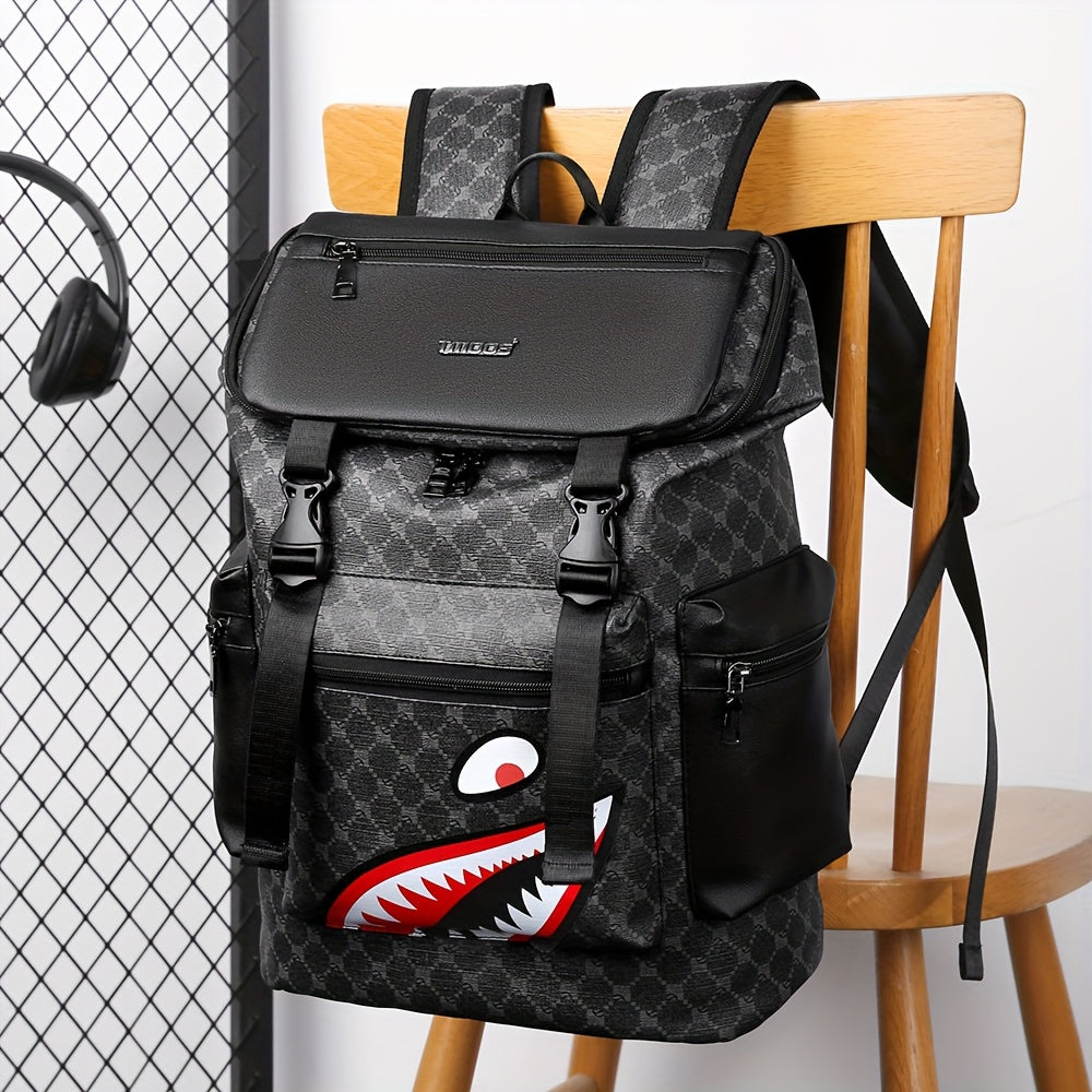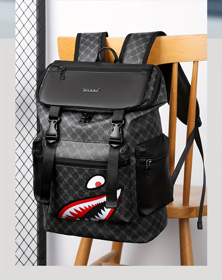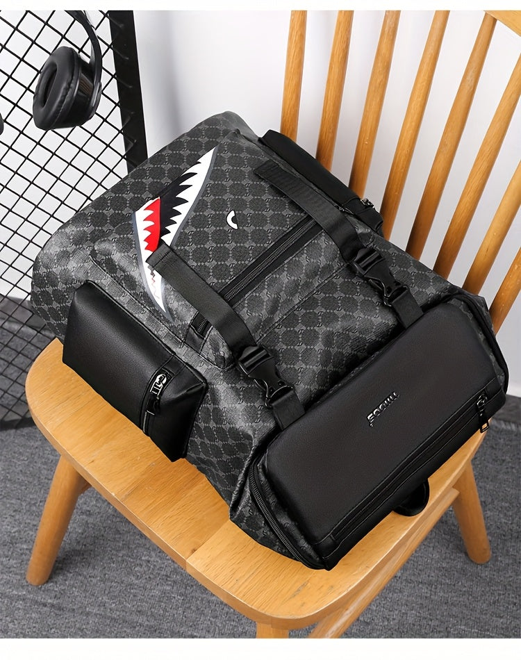 Men'S Stylish Black Backpack with Shark Graphic - Lightweight, Large Capacity, Multi-Functional Shoulder Bag for Travel, Commuting, School - Durable PVC Material, Sports & Fitness Design, Backpack for Travel