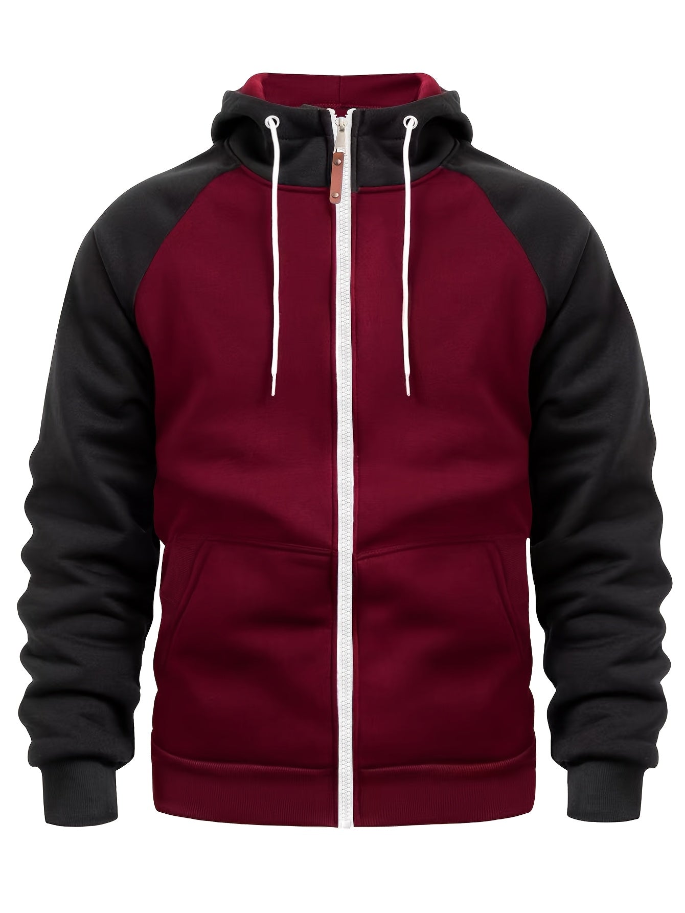 Men'S Stylish Color Block Hoodie - Casual Zip-Up Hooded Sweatshirt with Front Pockets, Long Sleeves, and Ribbed Cuffs - Maroon & Black Design, Comfortable for Fall and Winter Wear