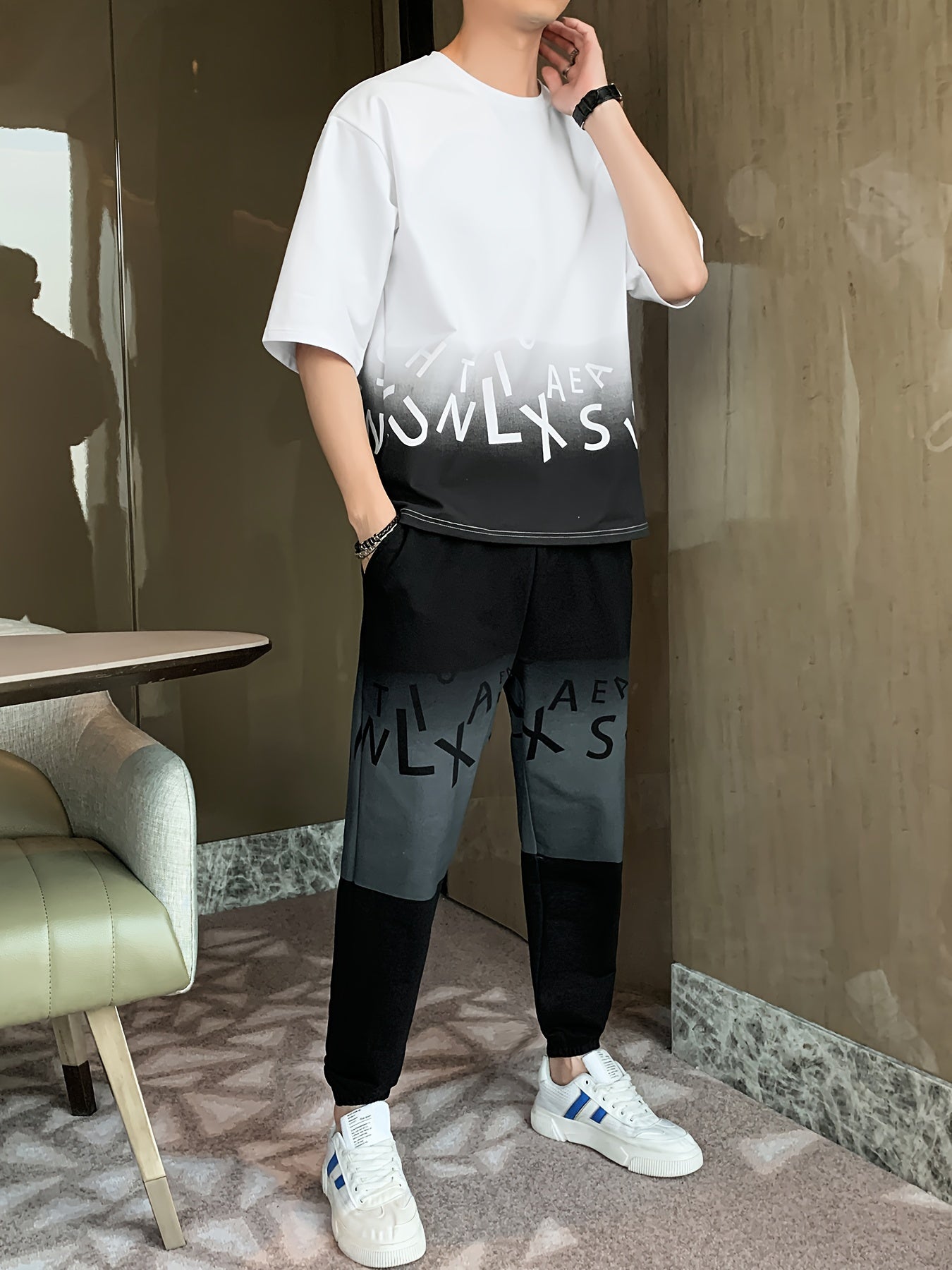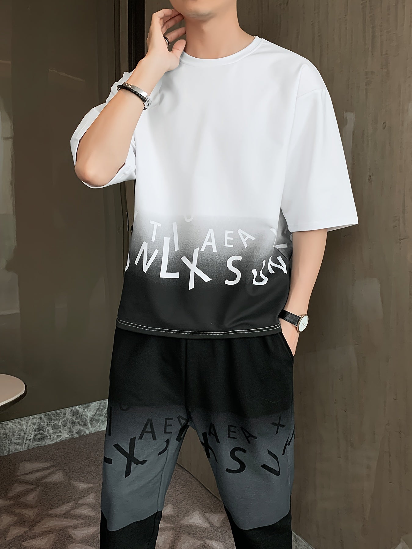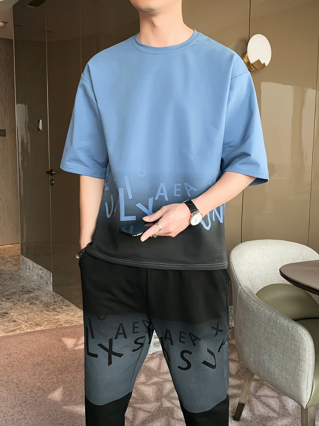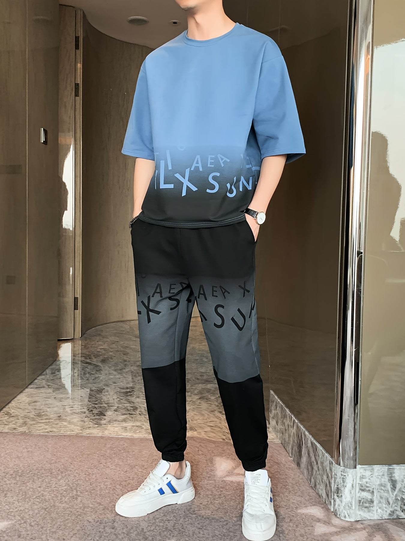 Men's Summer Casual Cotton Blend Outfit Set - Gradient Color Short Sleeve T-Shirt & Stylish Drawstring Shorts, Machine Washable
