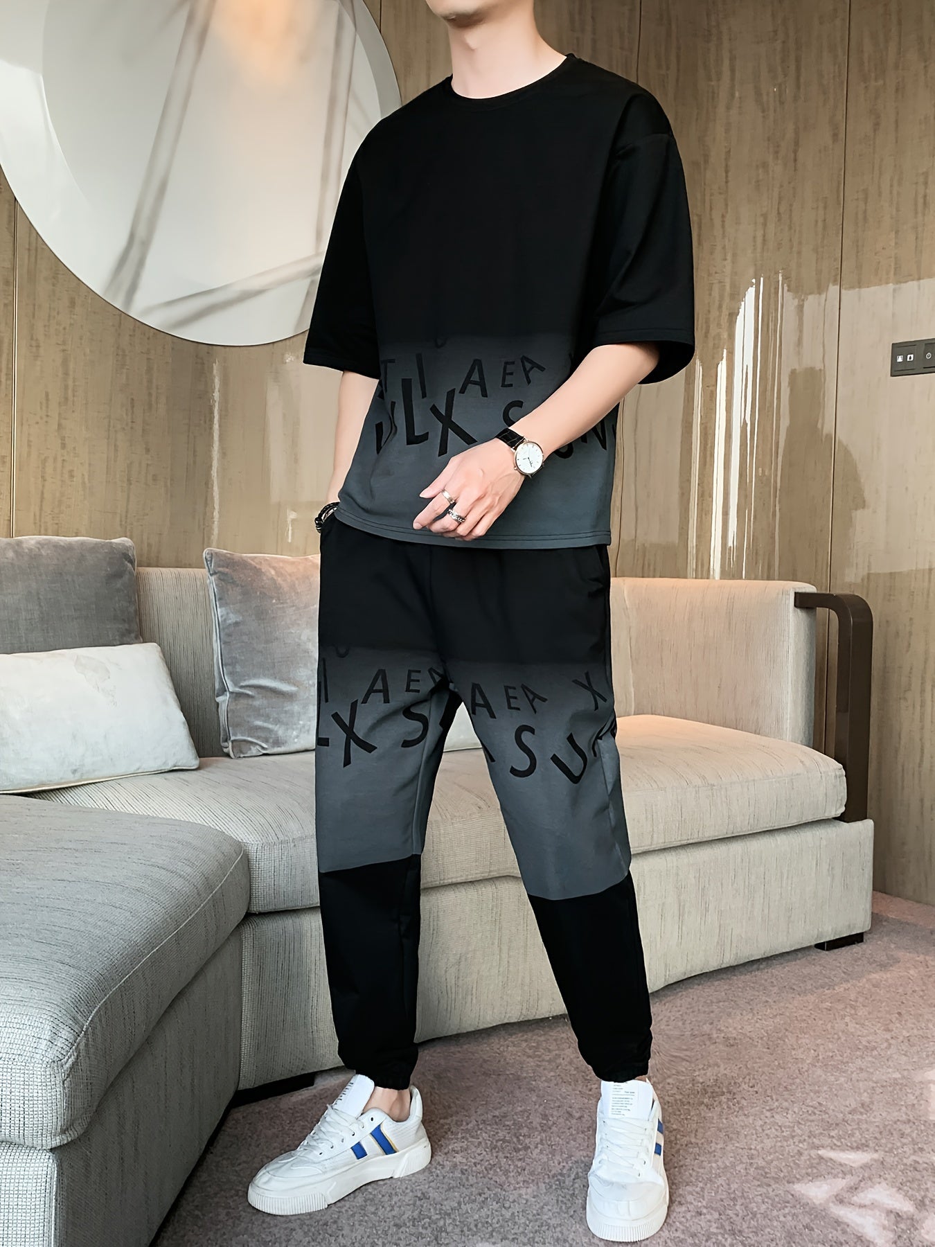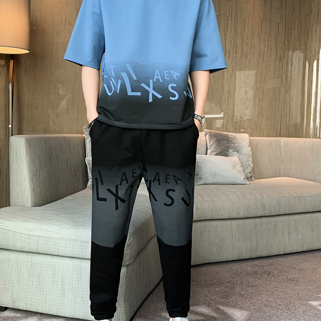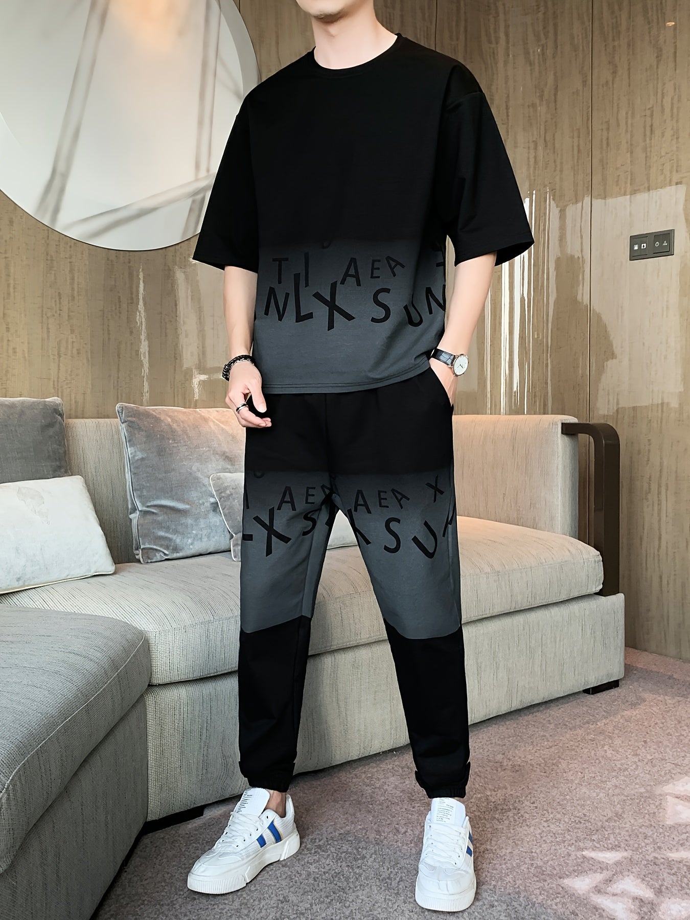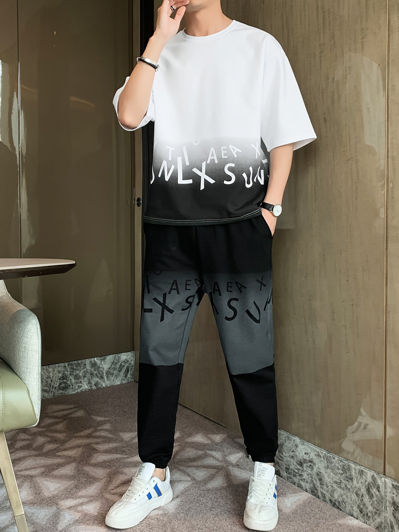 Men's Summer Casual Cotton Blend Outfit Set - Gradient Color Short Sleeve T-Shirt & Stylish Drawstring Shorts, Machine Washable