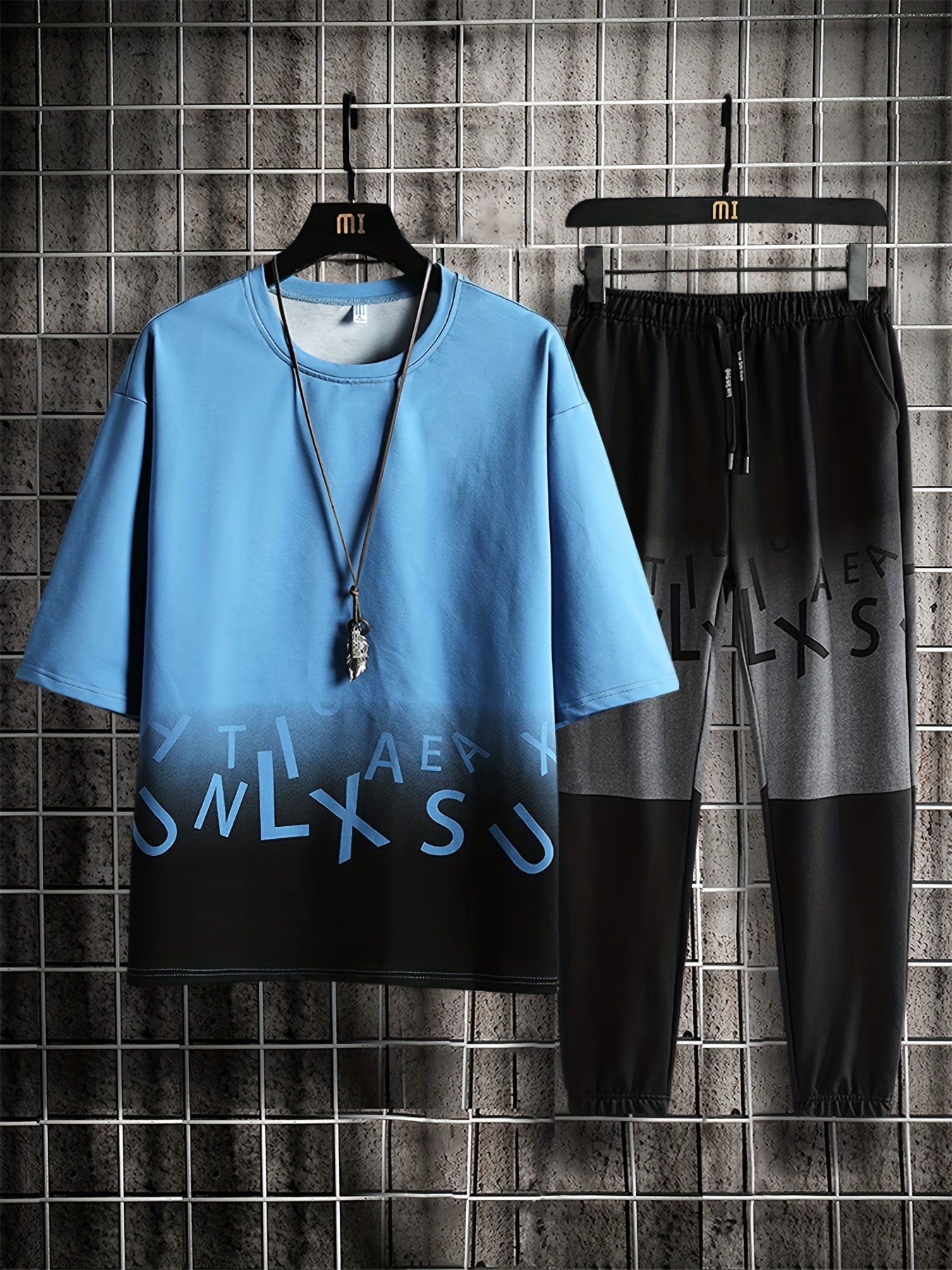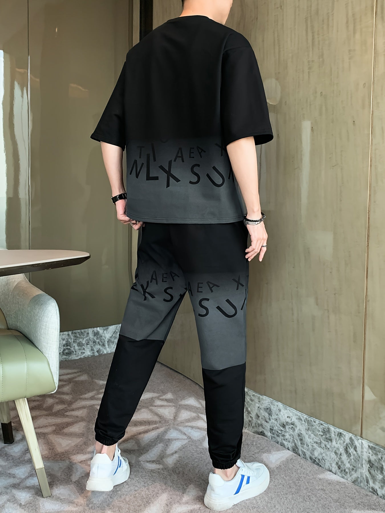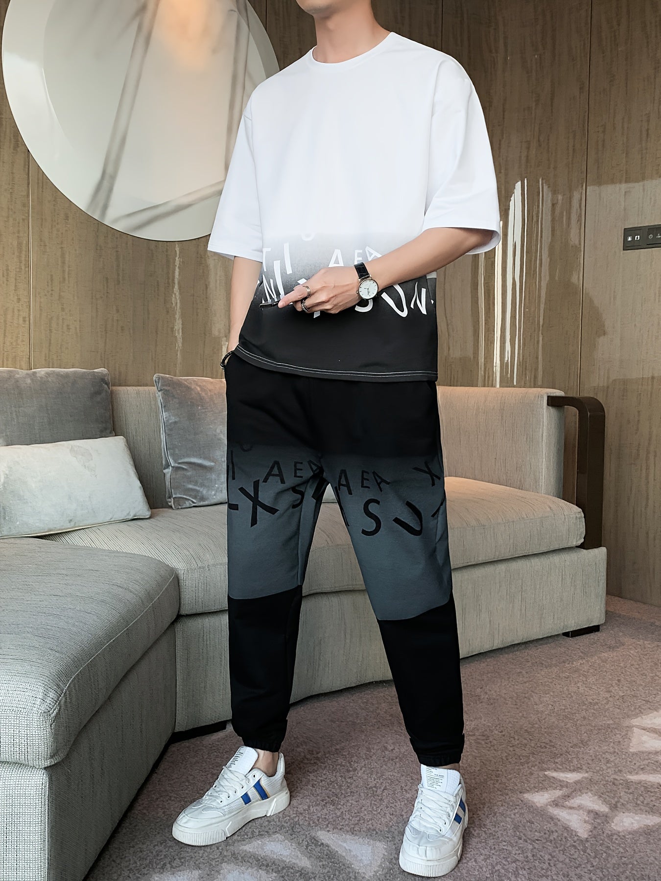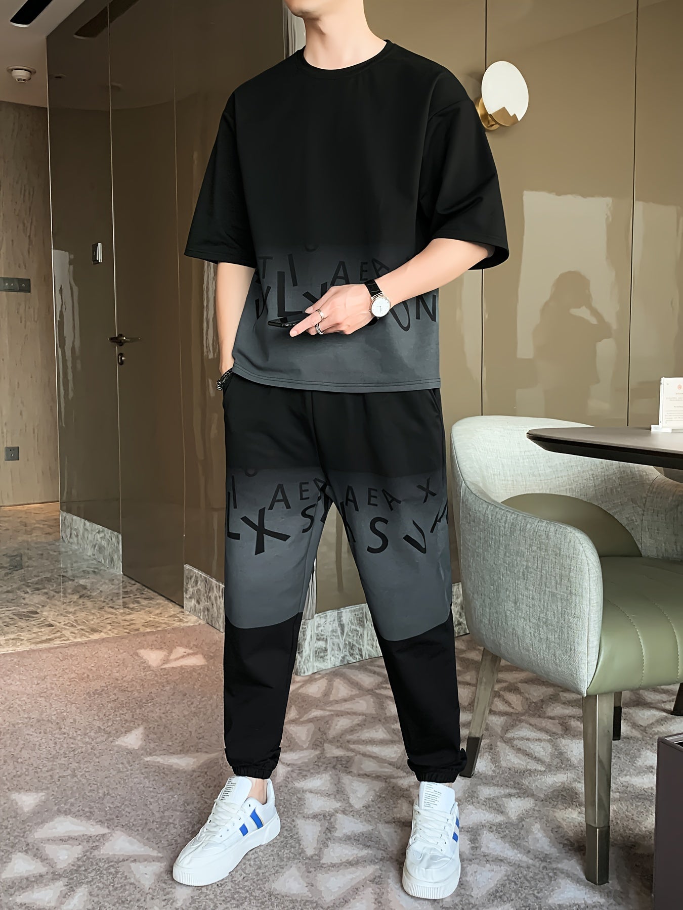 Men's Summer Casual Cotton Blend Outfit Set - Gradient Color Short Sleeve T-Shirt & Stylish Drawstring Shorts, Machine Washable