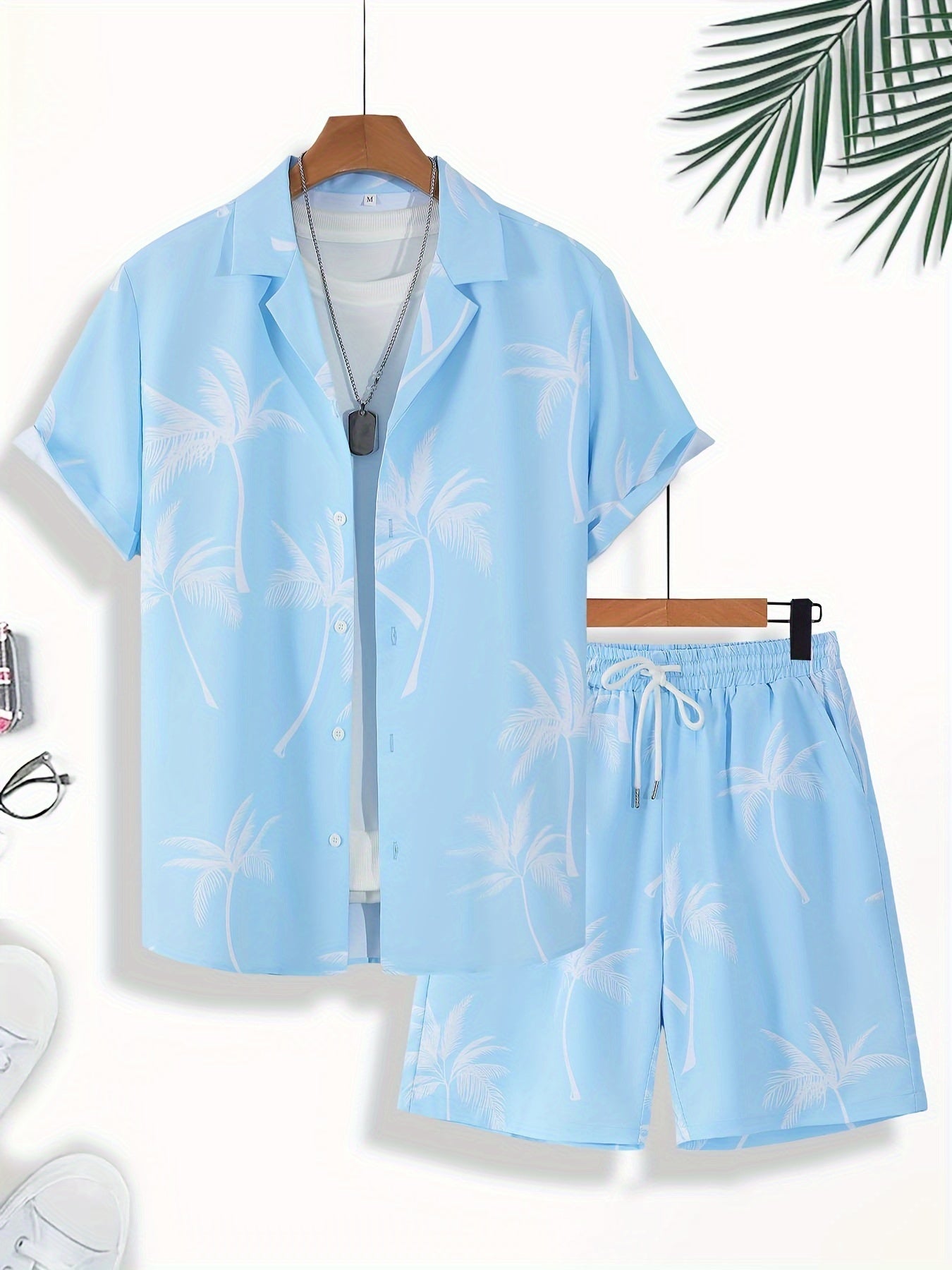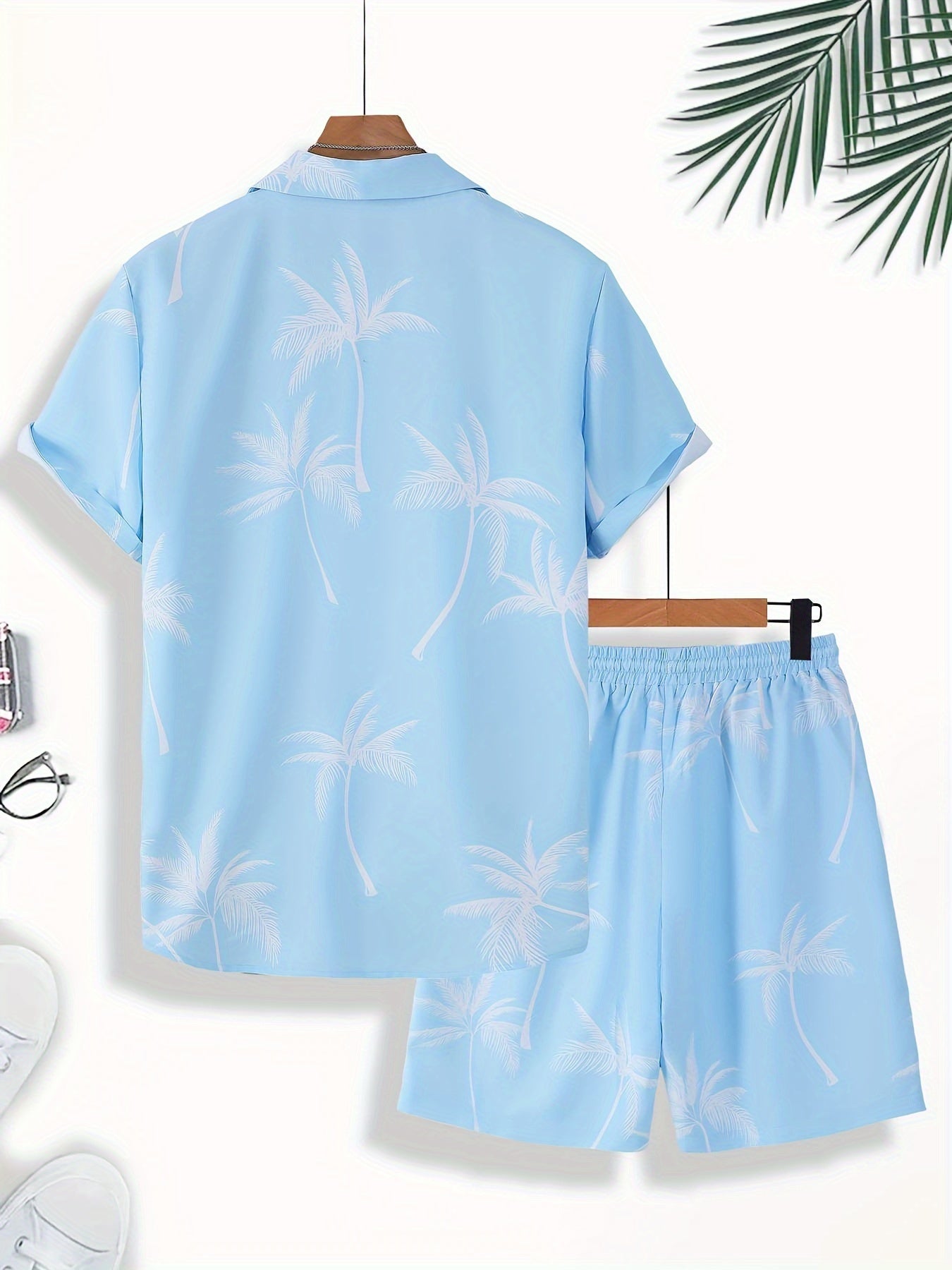 Men'S Summer Tropical Palm Tree Print Pajama Set, Polyester 100% Short Sleeve Shirt & Drawstring Waist Shorts, Vacation Style Lapel Collar, Non-Stretch Woven Fabric, Regular Fit - 120gsm