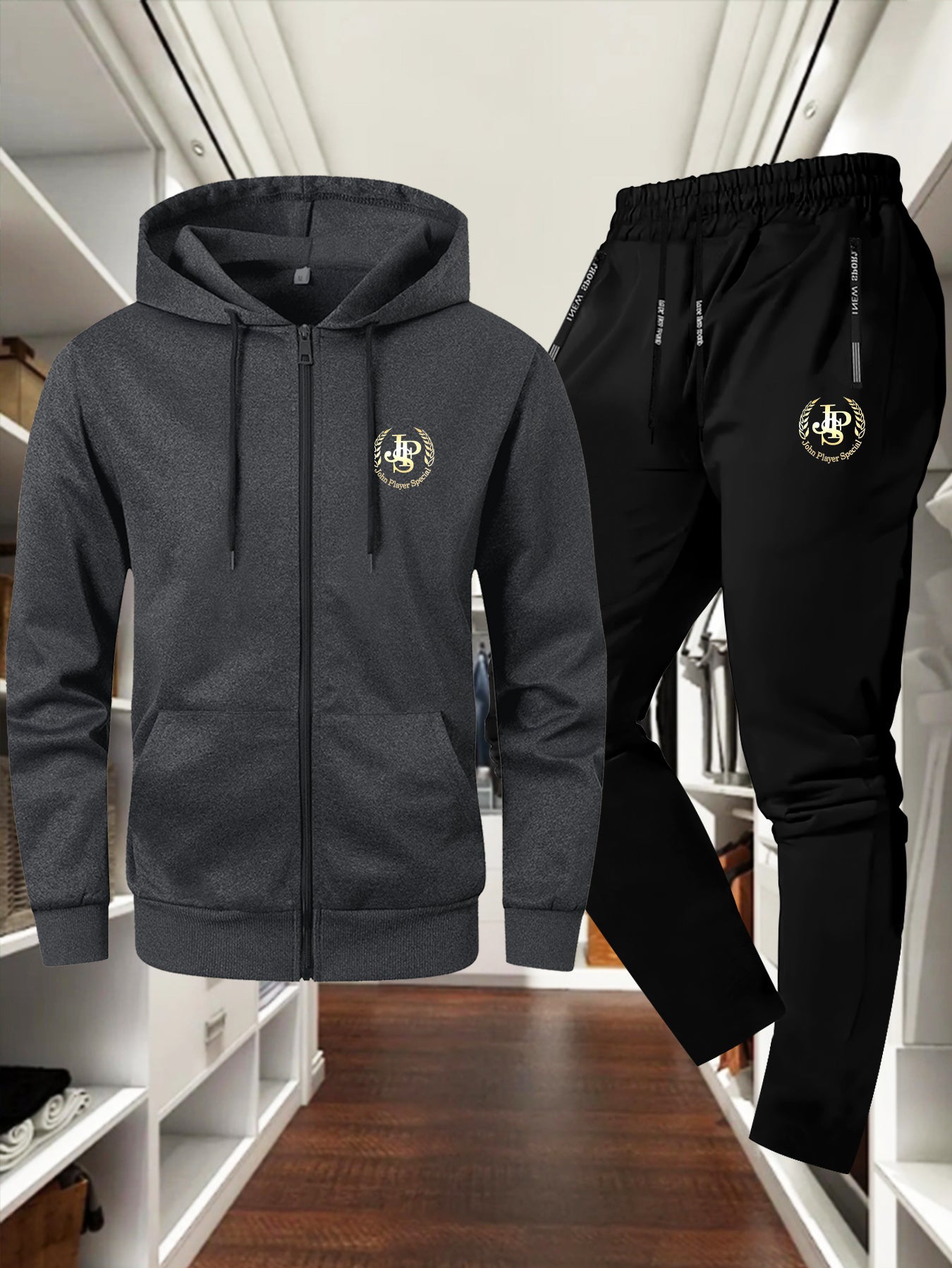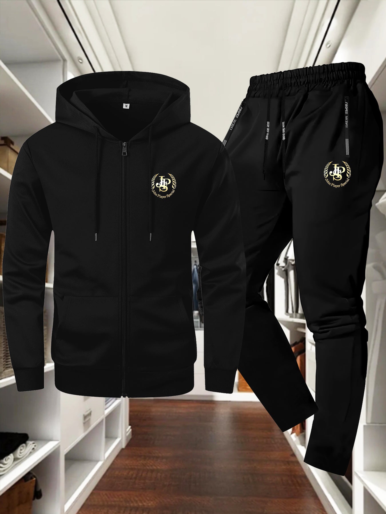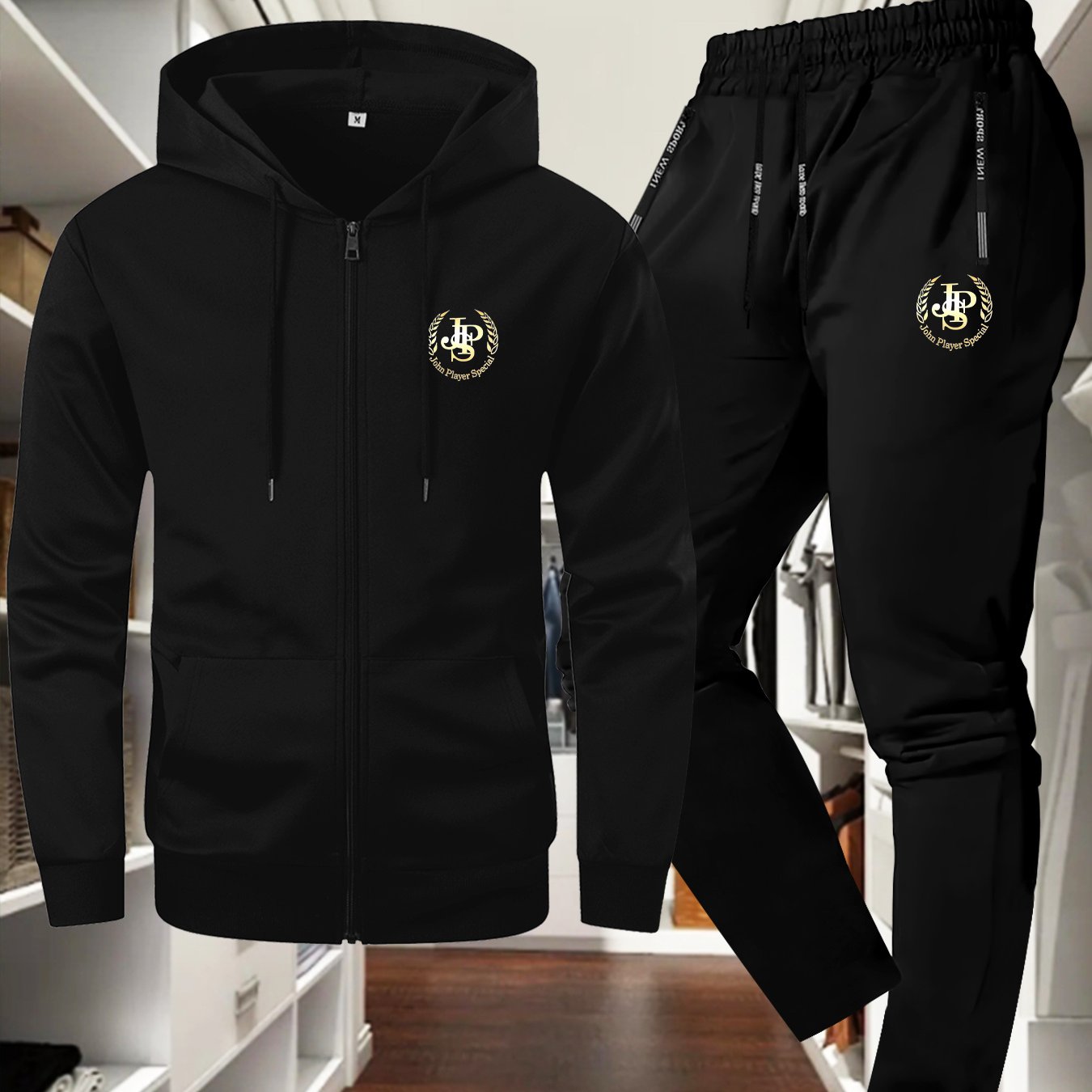 Men'S Trendy Autumn/Winter Jacket and Pants Set, JSP Print, Casual Young Sports Suit, Slim Fit, Long Sleeve, Zip-Up Hoodie with Pockets, Solid Color, Polyester, Casual Wear|JSP Print Jacket|Zippered Jacket, Autumn Clothin