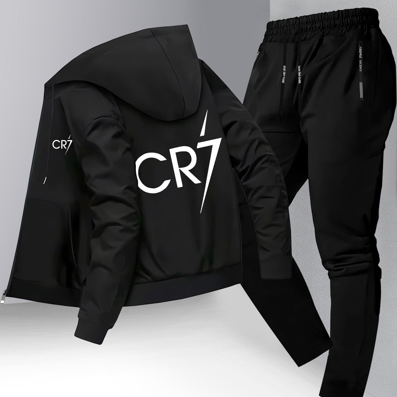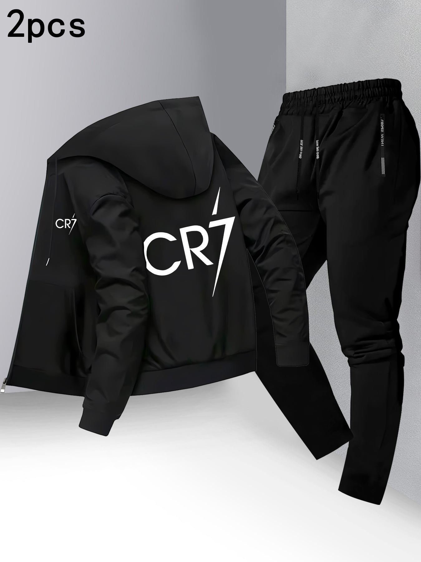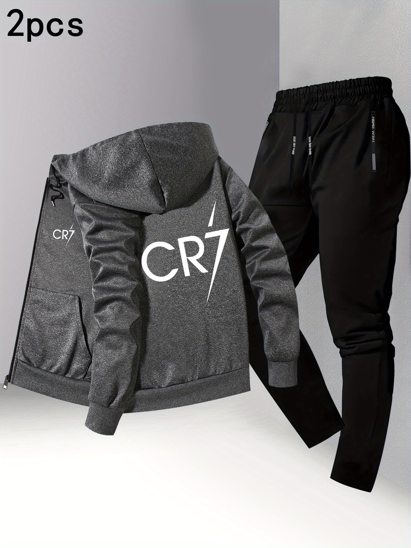 Men'S Trendy CR7 Print Hooded Jacket and Pants Set, Casual Business Suit, Youth Casual Sports Baseball Uniform with Stand Collar