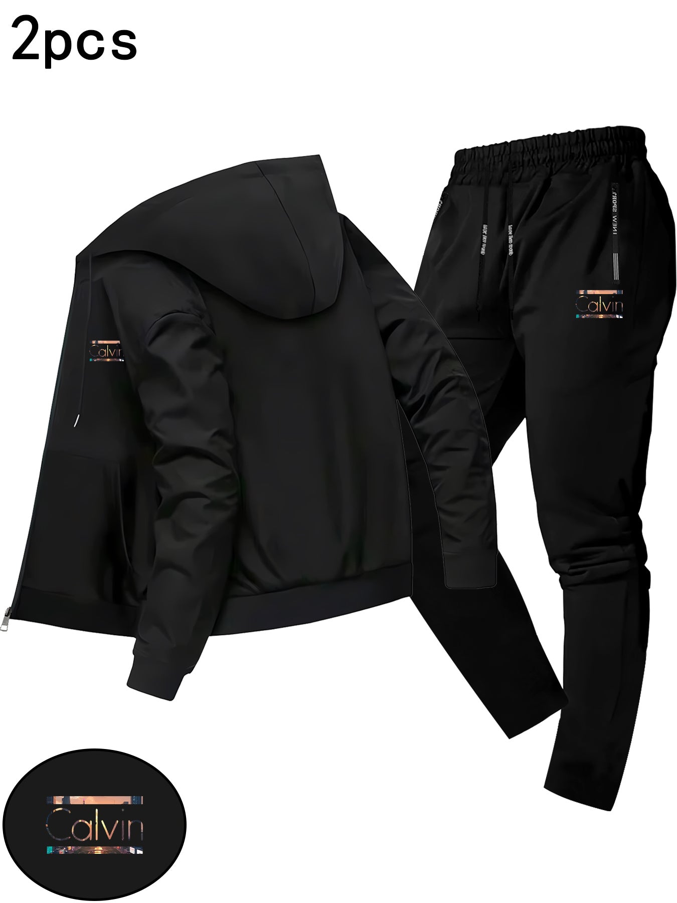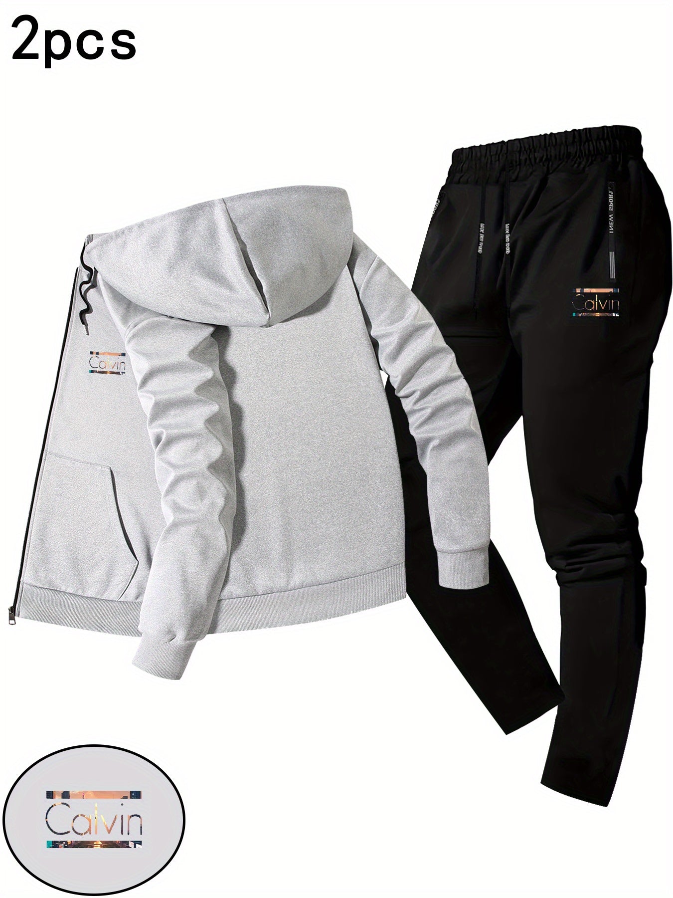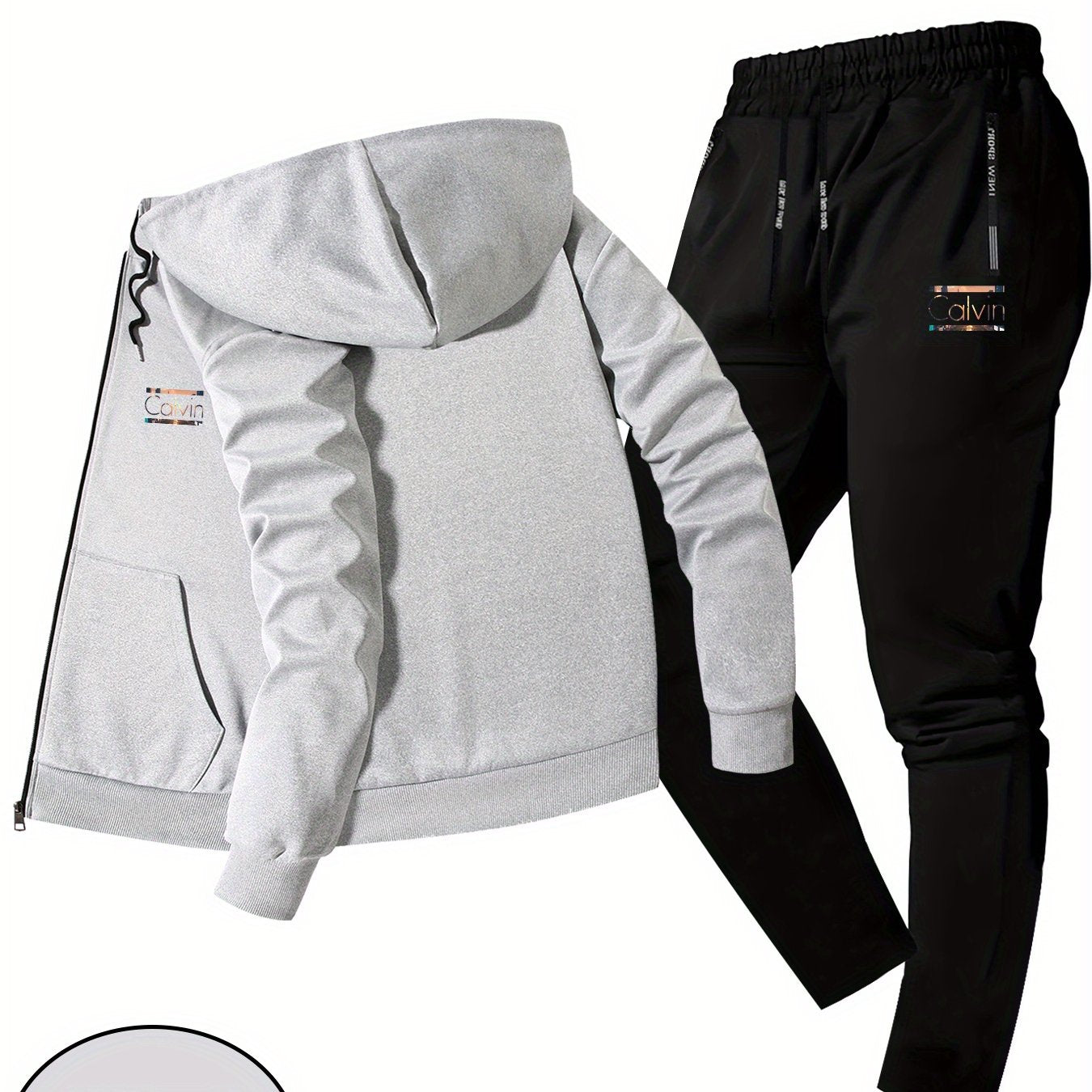 Men'S Trendy Fall/Winter Hooded Jacket Two-Piece Set Calvin Print, Casual Youth Casual Sports Jacket Set
