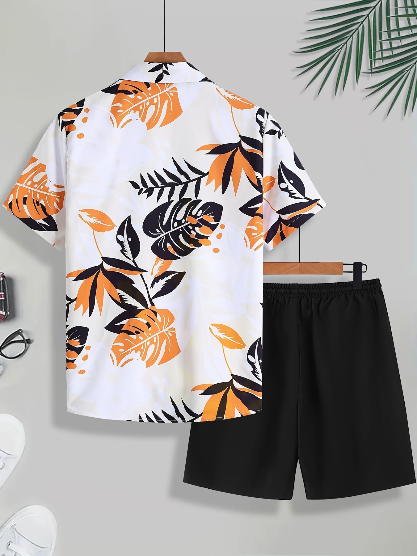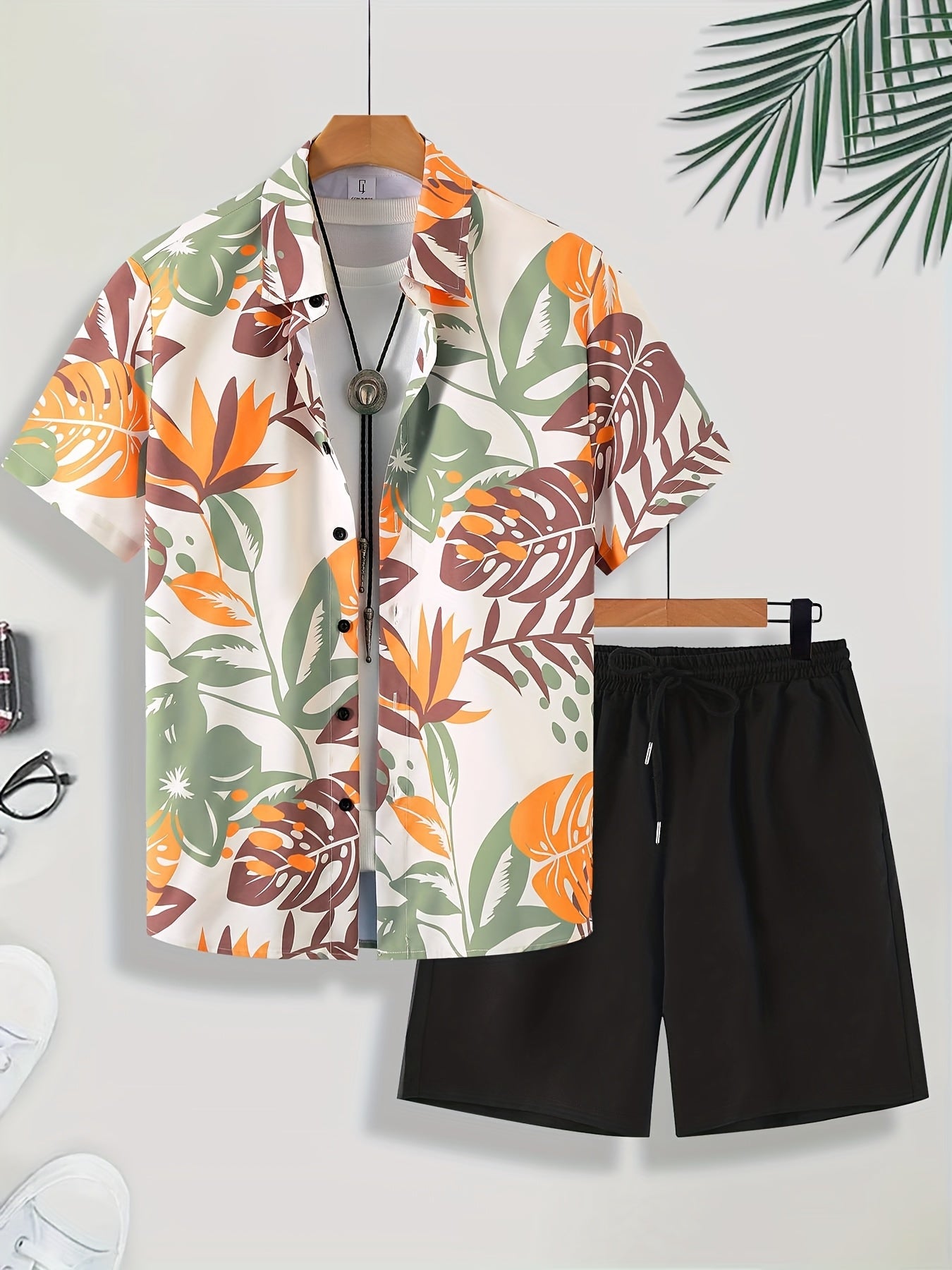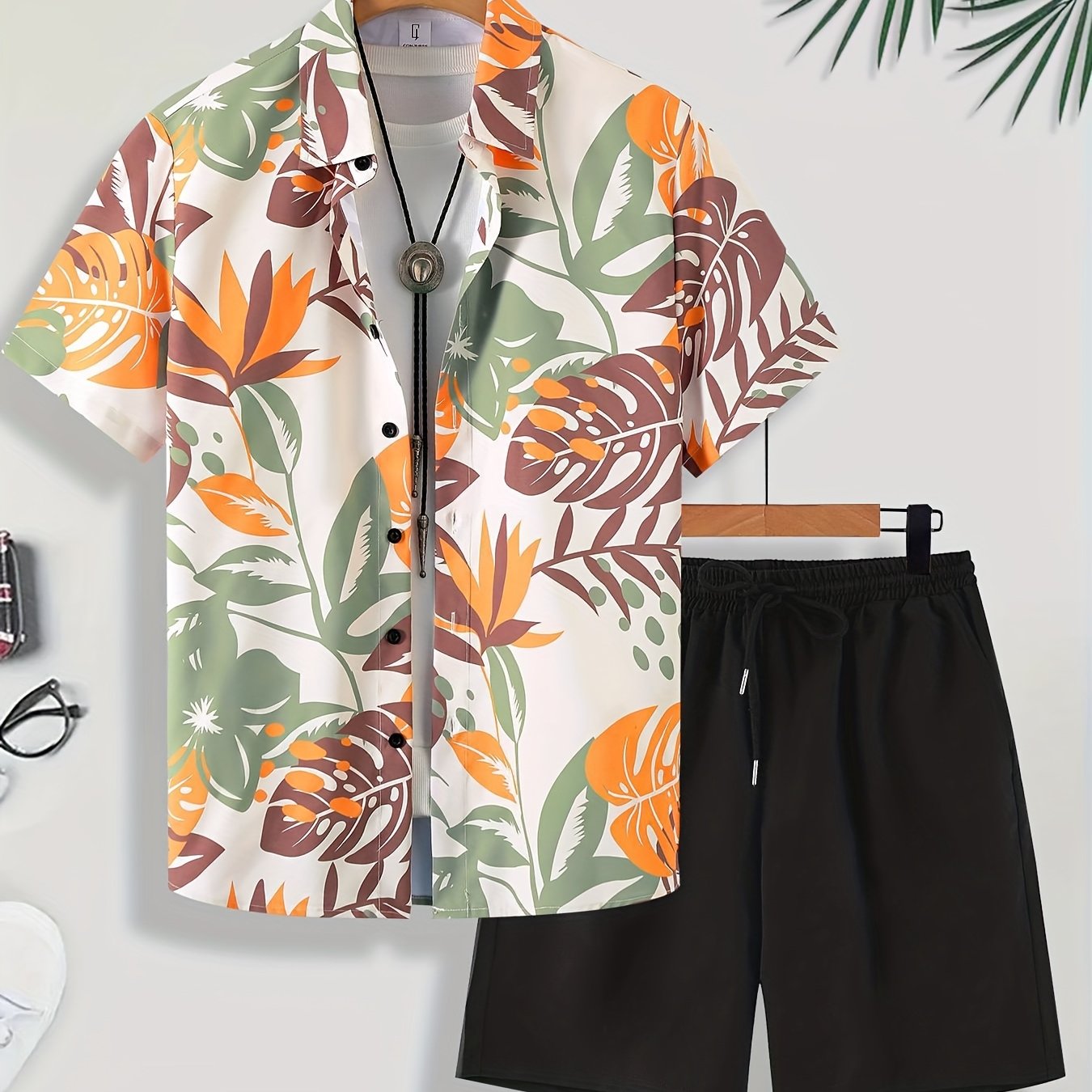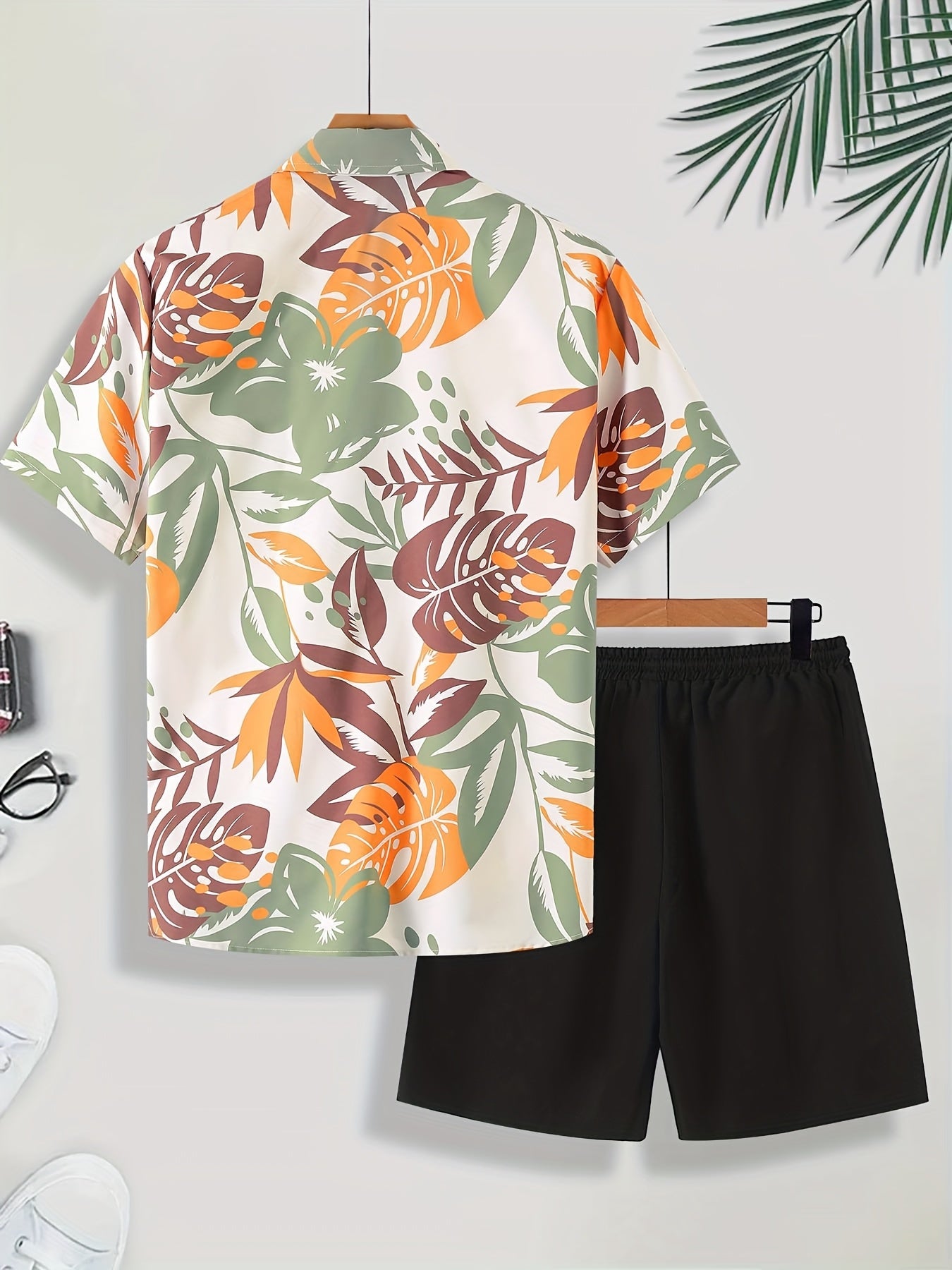 Men'S Tropical Palm Leaf Print Short Sleeve Shirt & Solid Black Shorts Set - Casual Summer Outfit with Drawstring Waist, Non-Stretch Fabric, Perfect for Beach or Vacation, Beach Attire | Tropical Print Shirt | Nonstretch Fabr