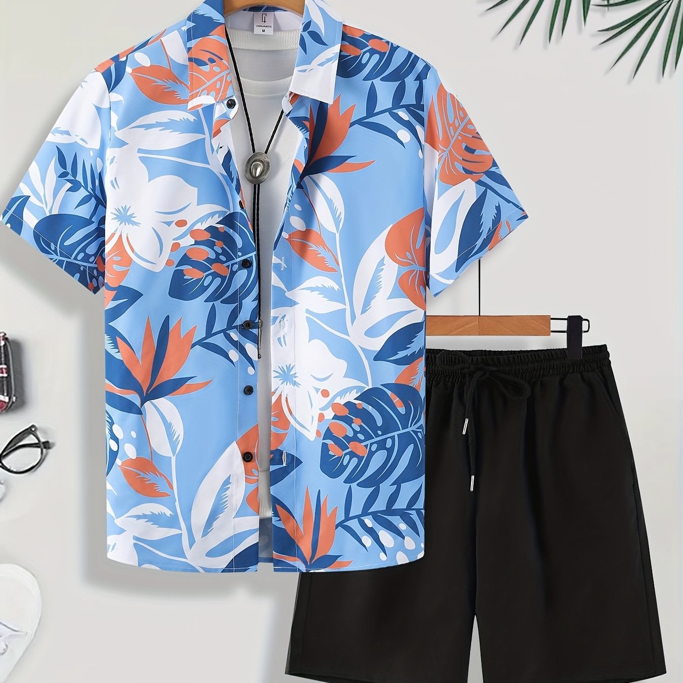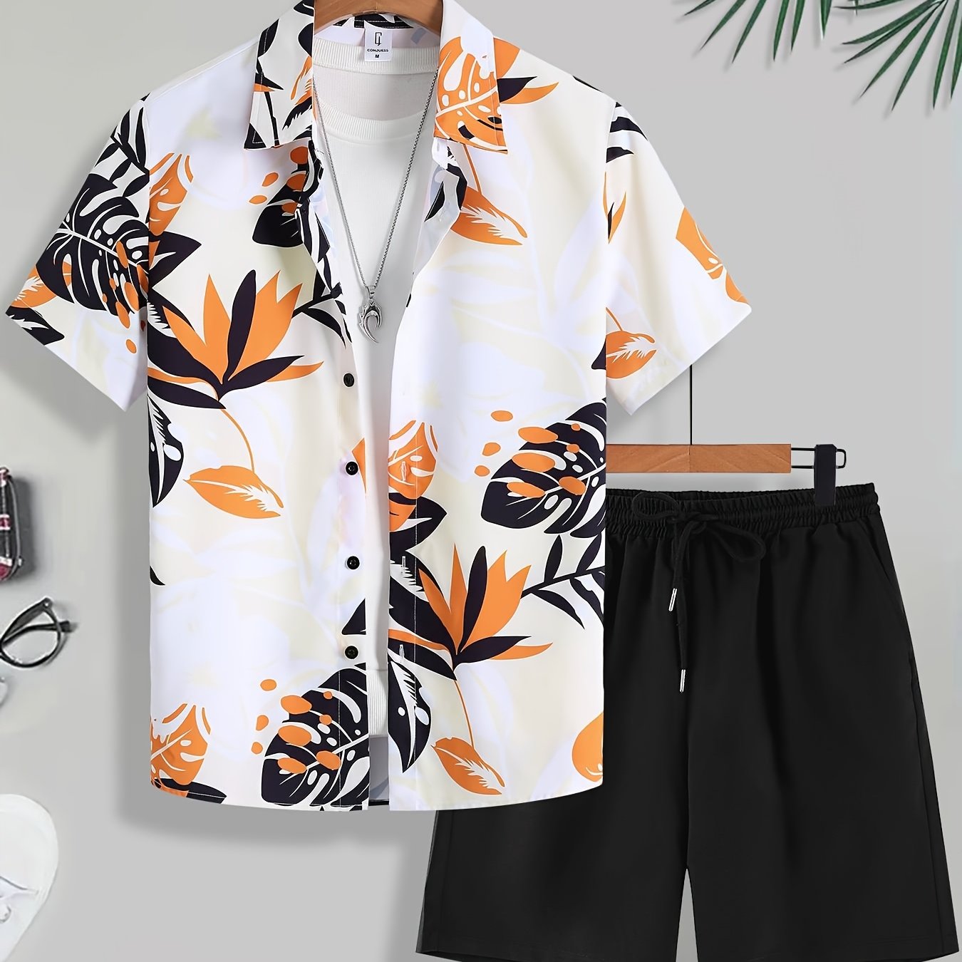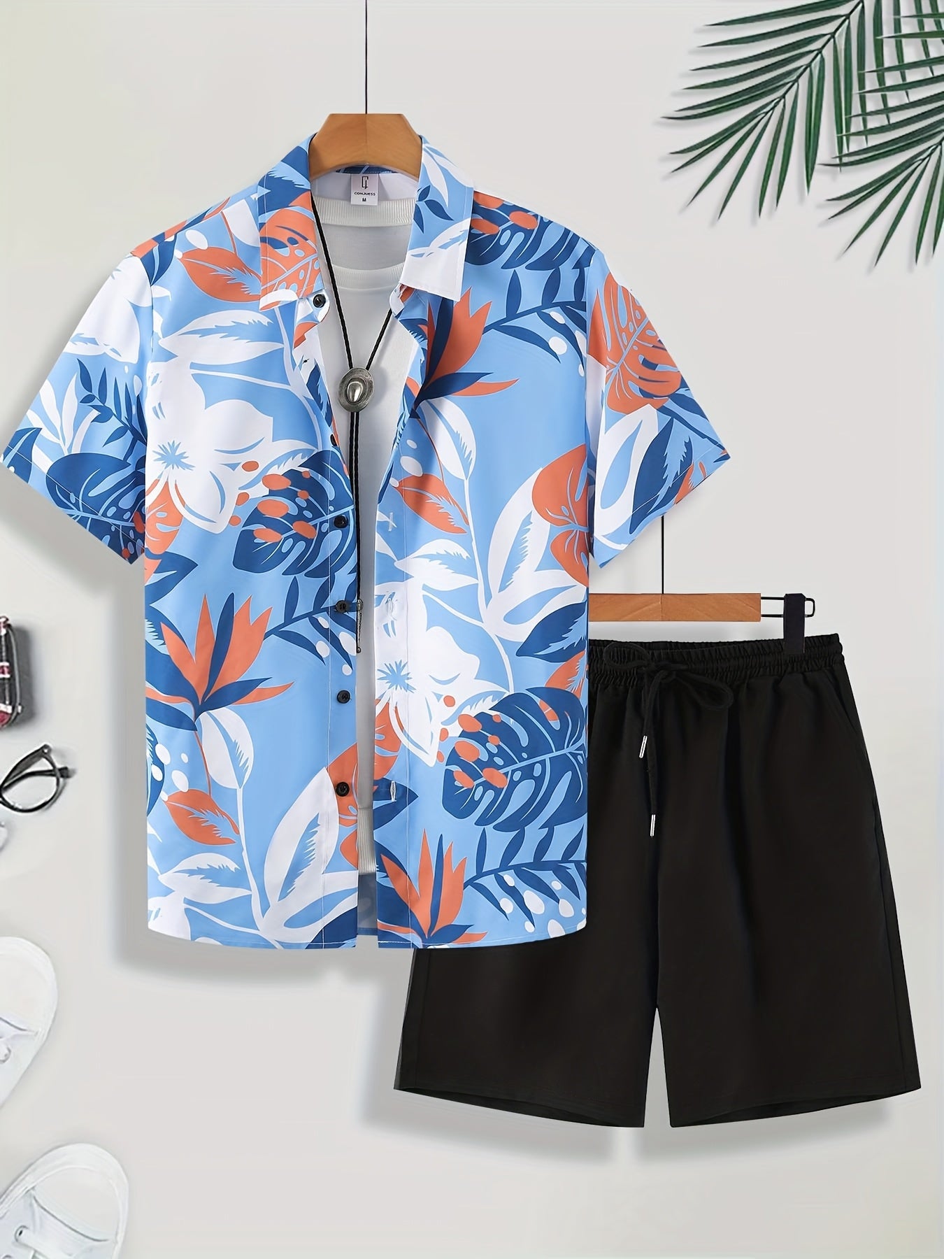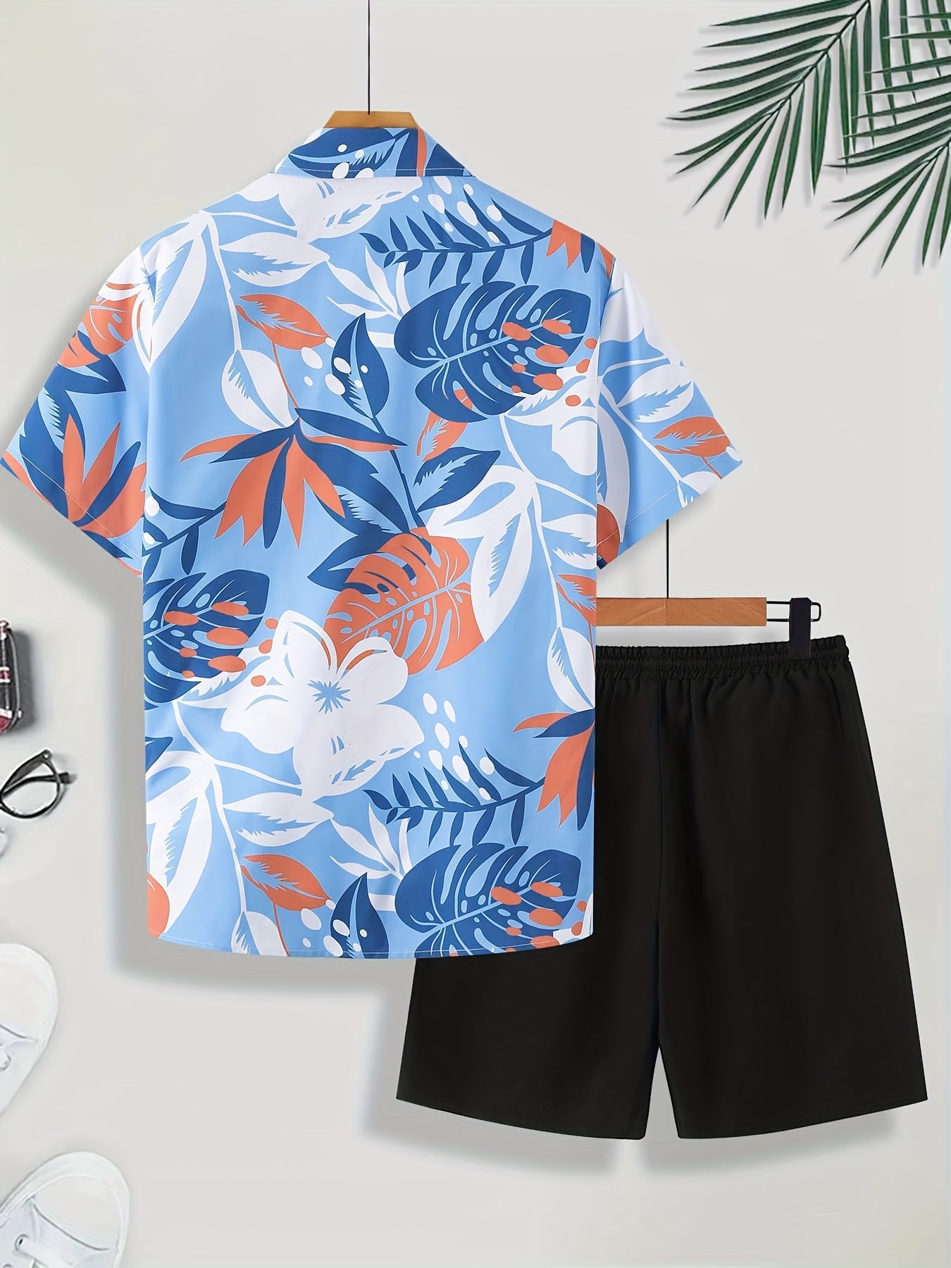 Men'S Tropical Palm Leaf Print Short Sleeve Shirt & Solid Black Shorts Set - Casual Summer Outfit with Drawstring Waist, Non-Stretch Fabric, Perfect for Beach or Vacation, Beach Attire | Tropical Print Shirt | Nonstretch Fabr
