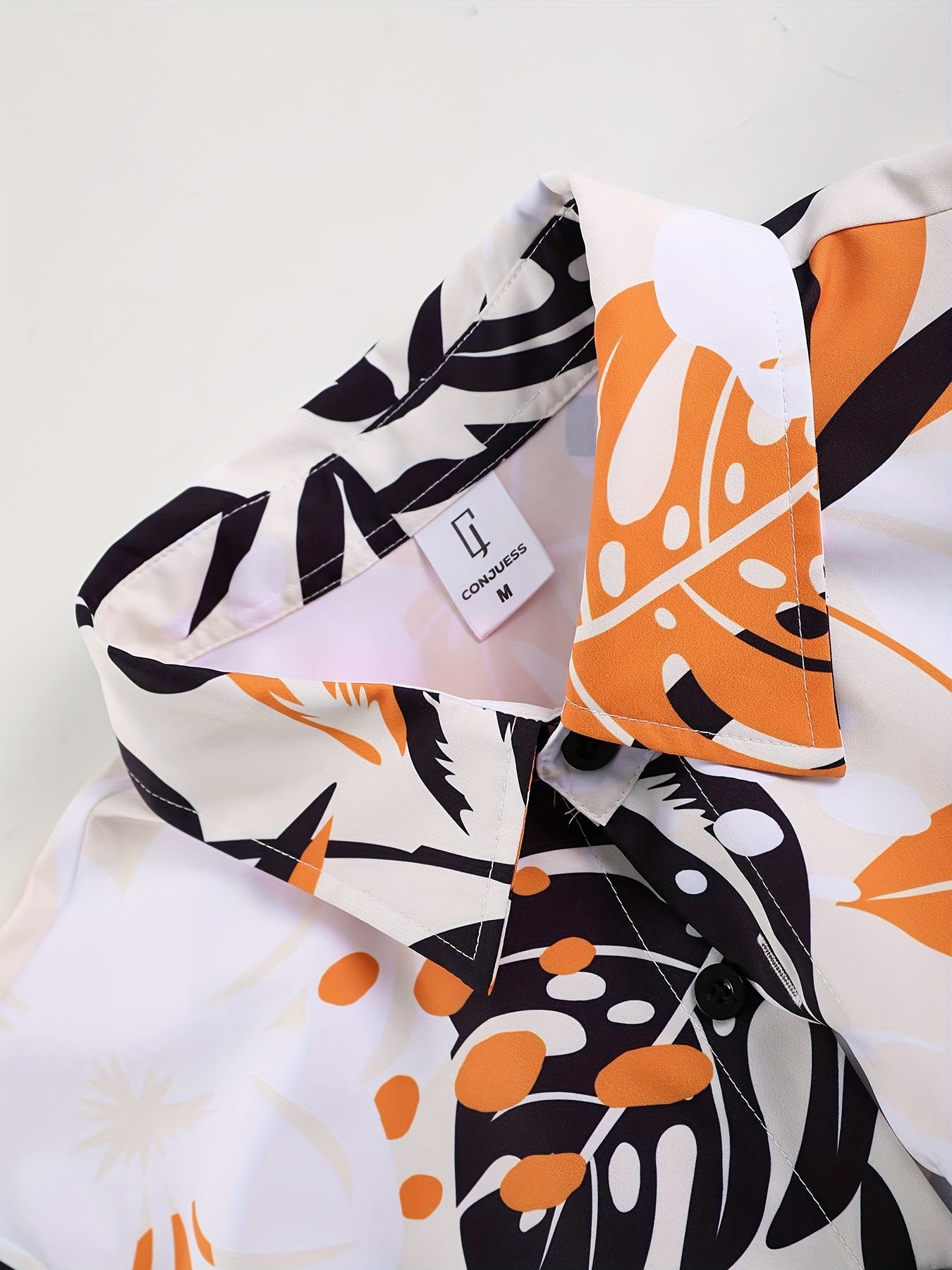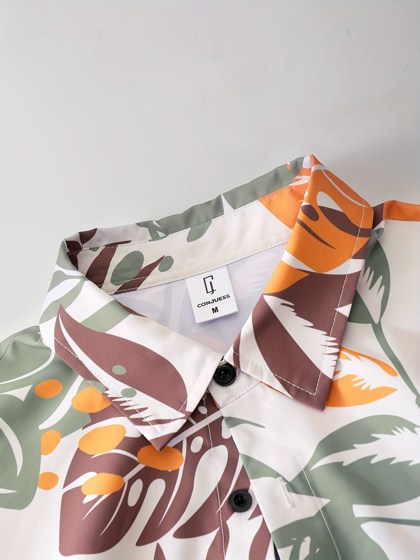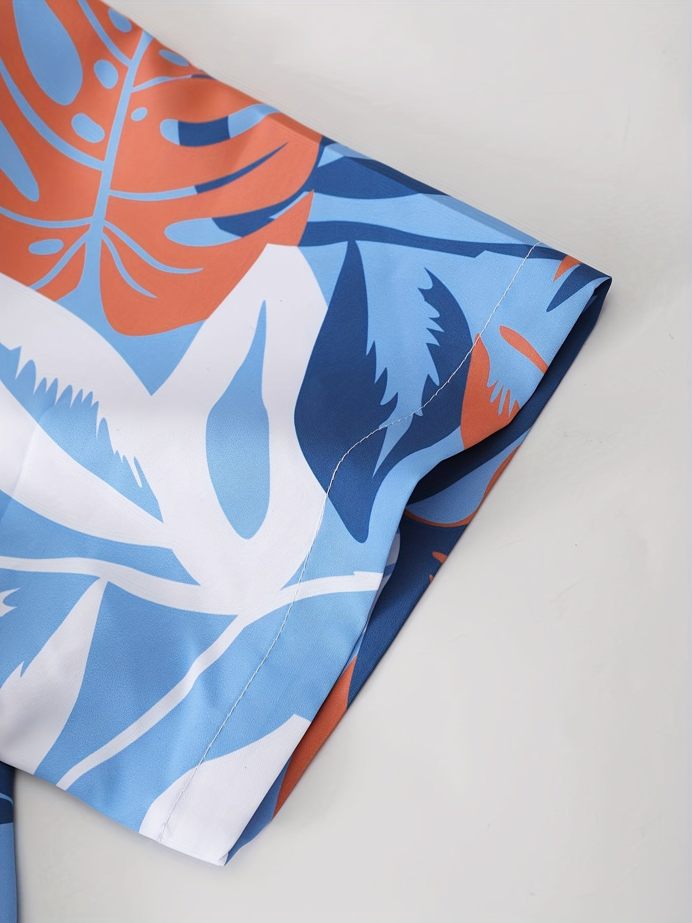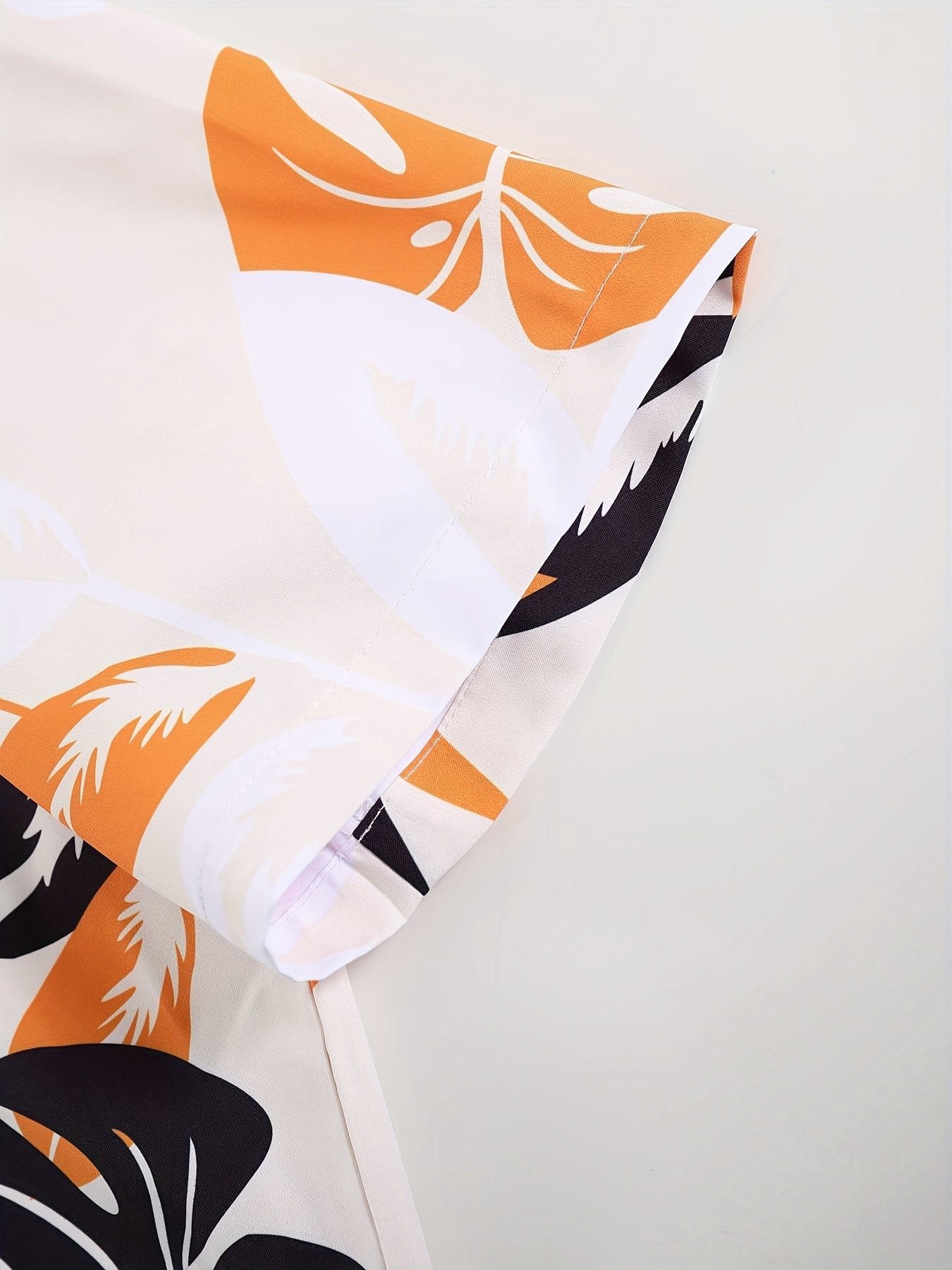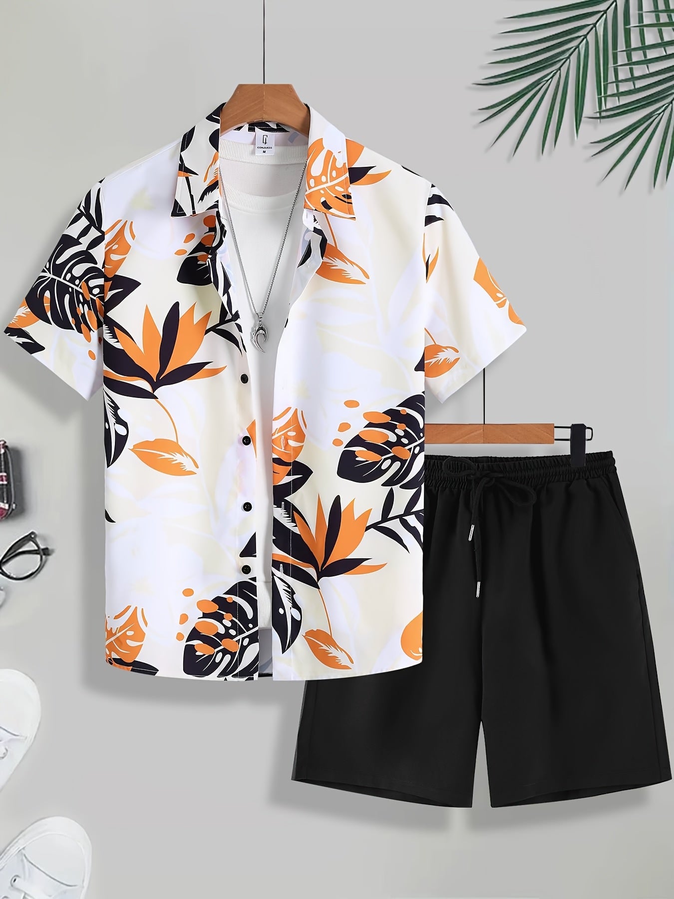 Men'S Tropical Palm Leaf Print Short Sleeve Shirt & Solid Black Shorts Set - Casual Summer Outfit with Drawstring Waist, Non-Stretch Fabric, Perfect for Beach or Vacation, Beach Attire | Tropical Print Shirt | Nonstretch Fabr