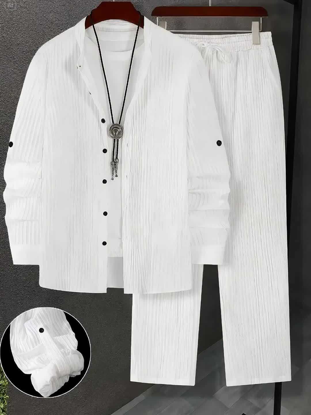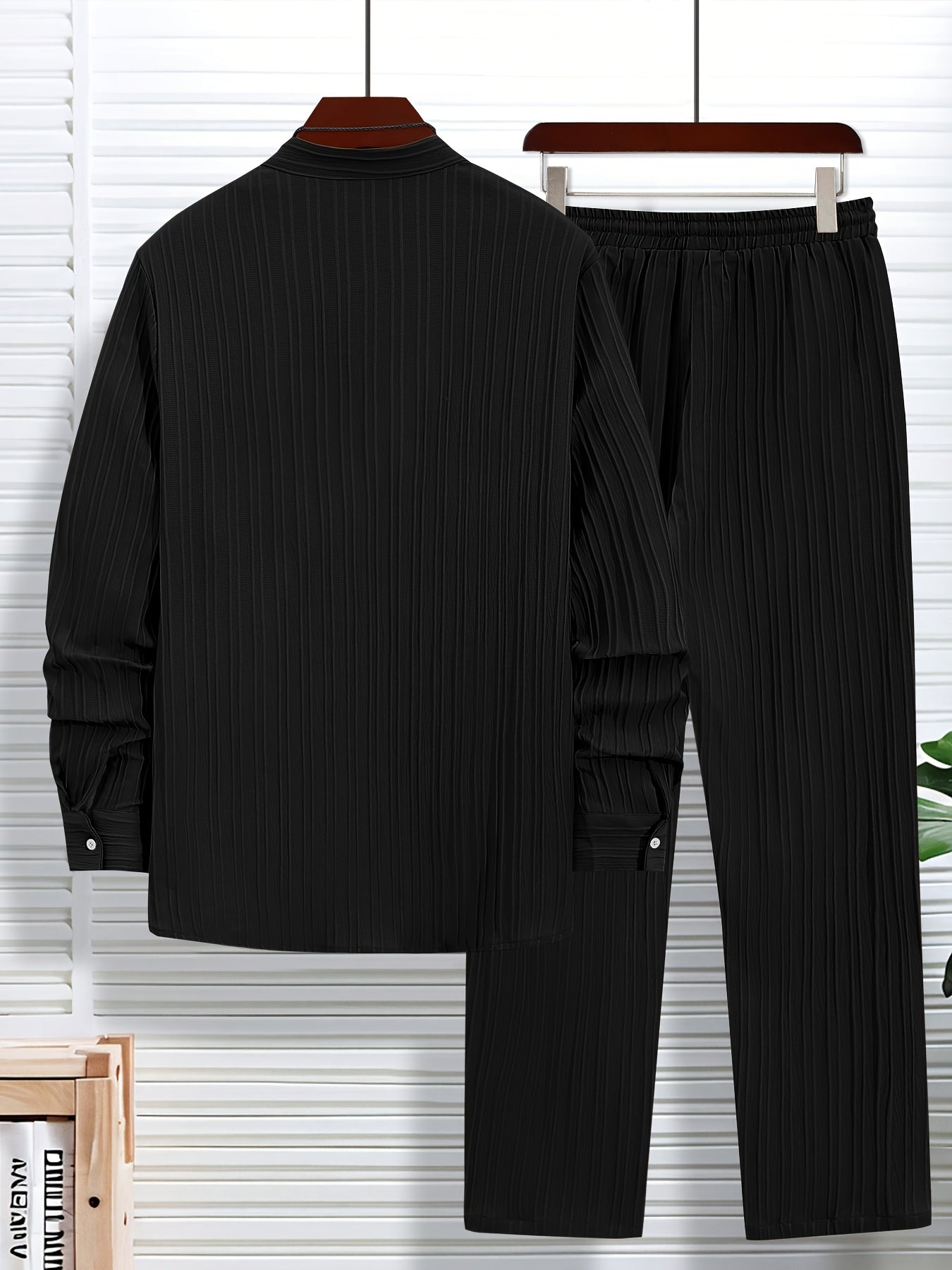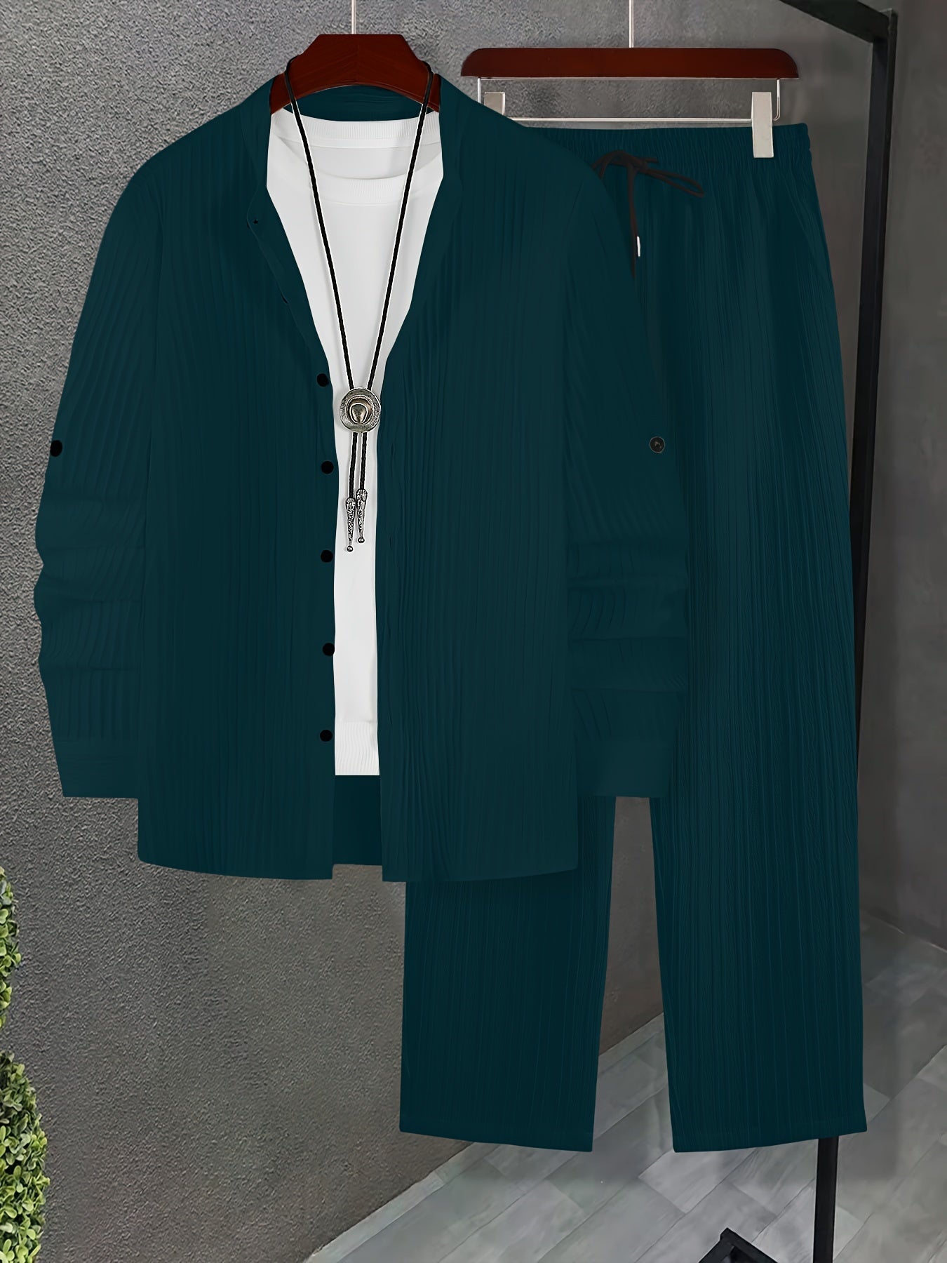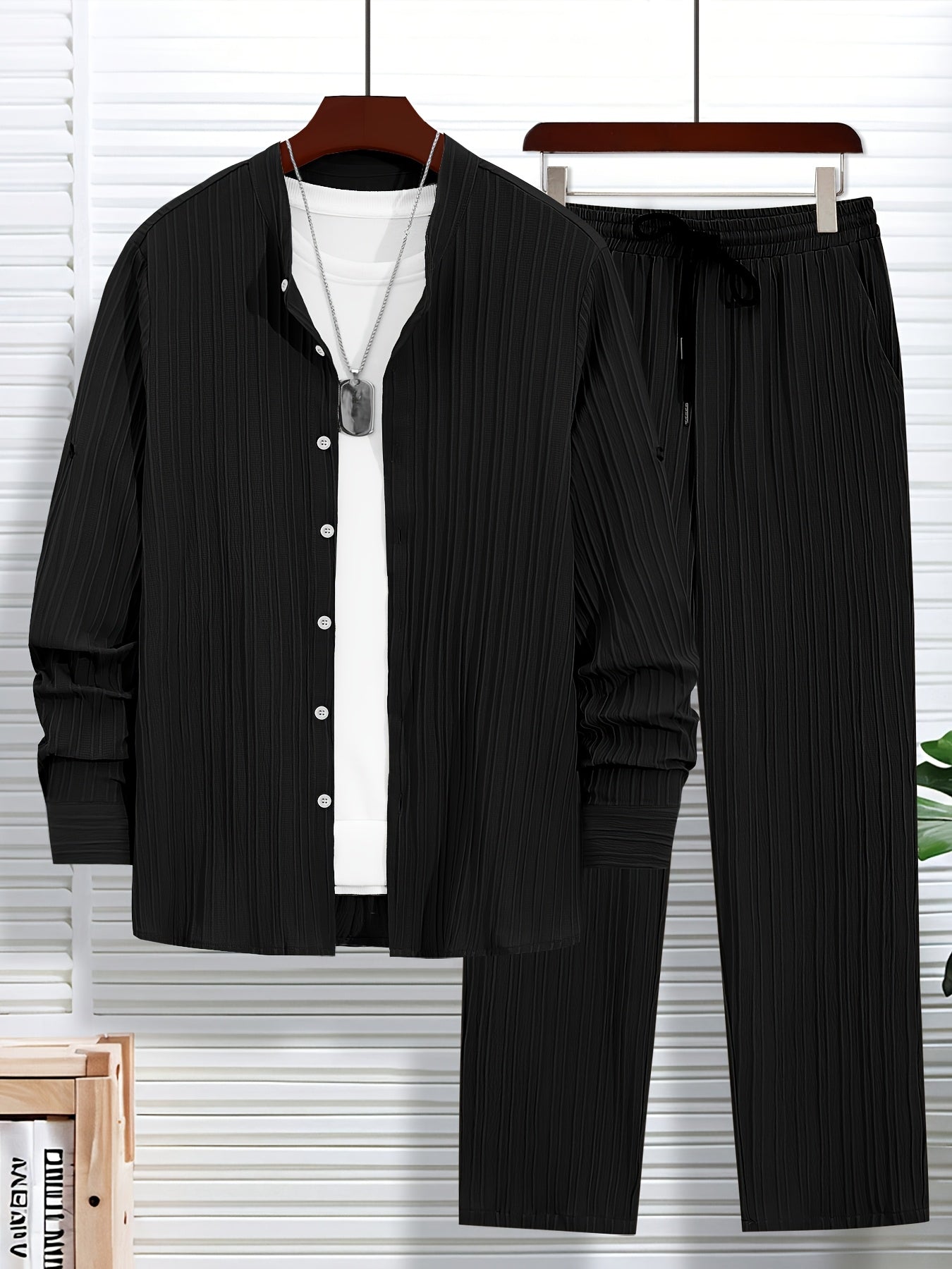 Men'S Two-Piece Set Featuring Textured Fabric, Versatile Long-Sleeve Shirt with Ear Loops, And Loose Drawstring Casual Pants.