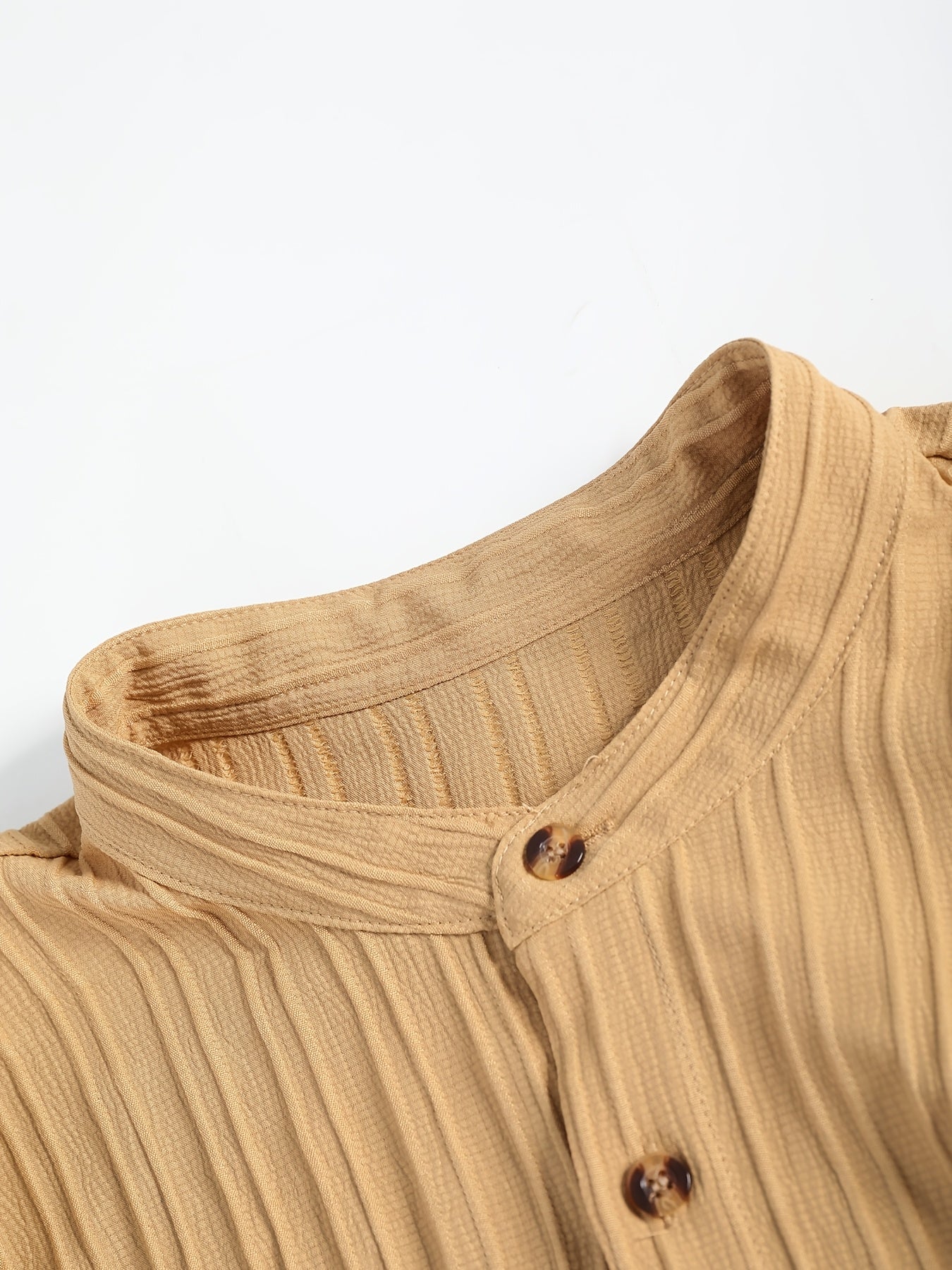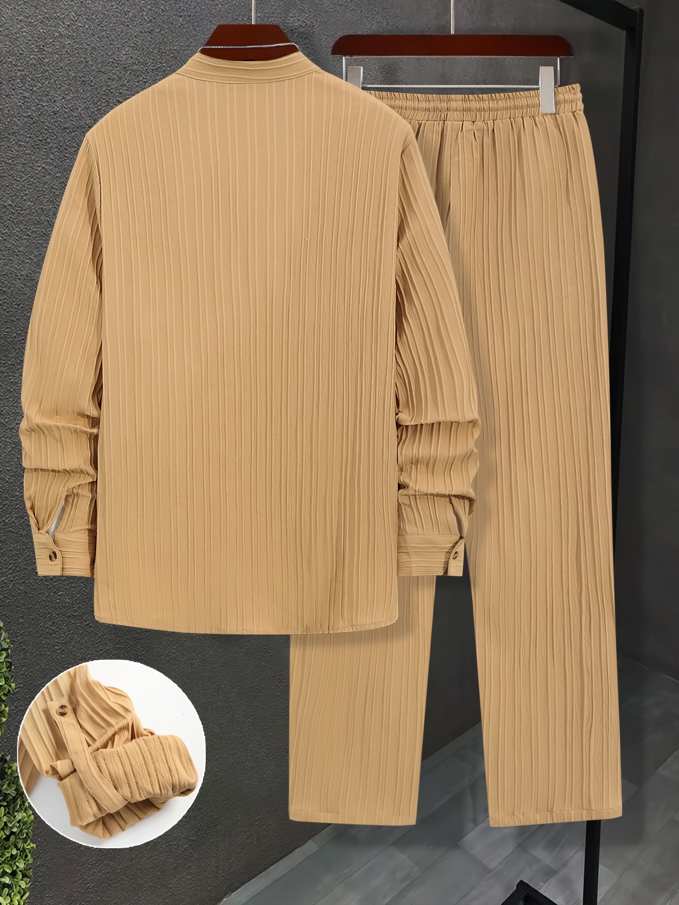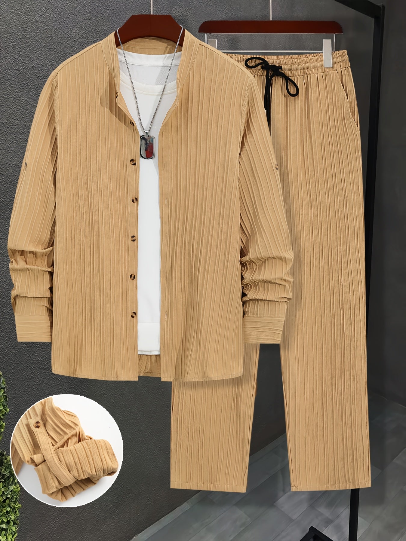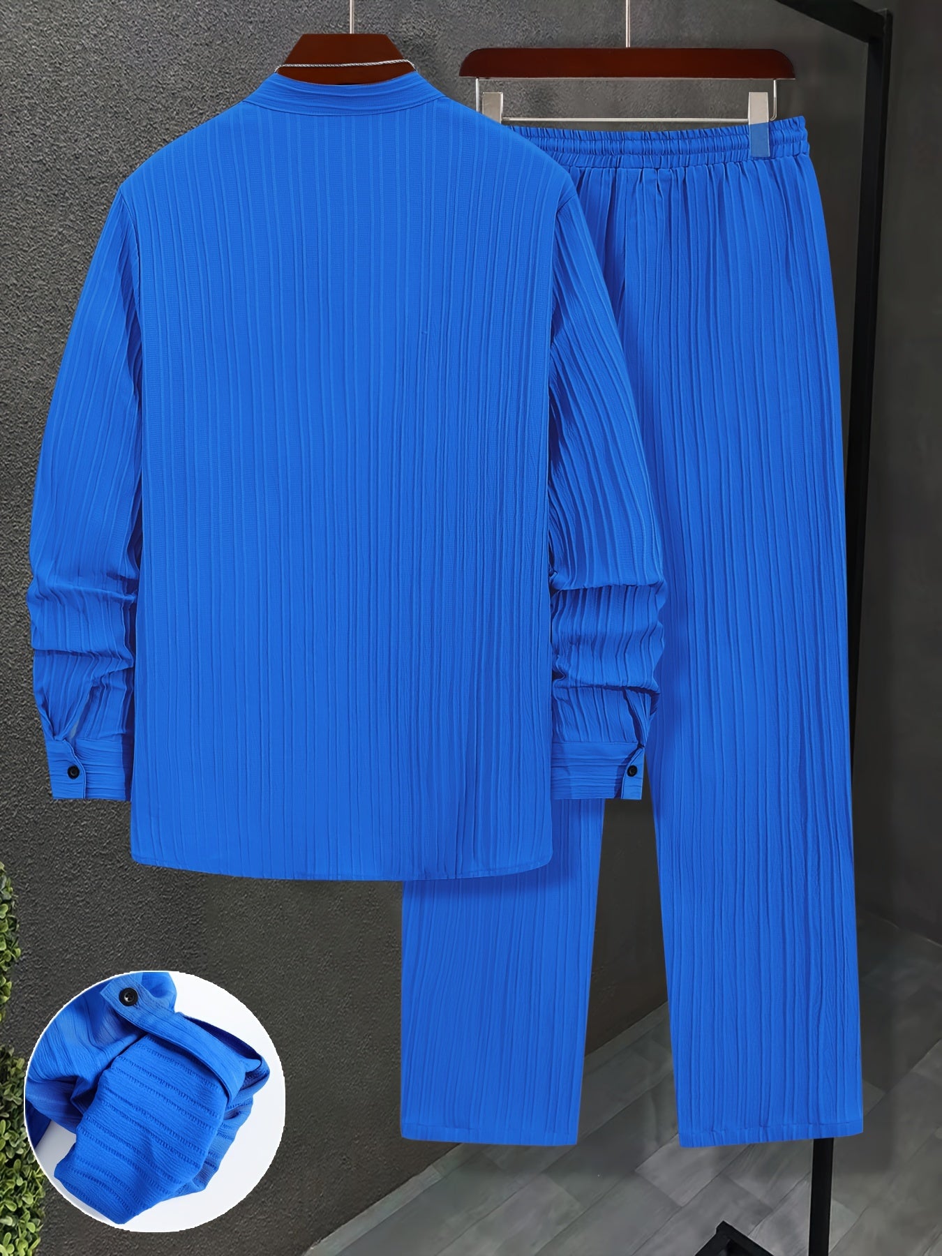 Men'S Two-Piece Set Featuring Textured Fabric, Versatile Long-Sleeve Shirt with Ear Loops, And Loose Drawstring Casual Pants.