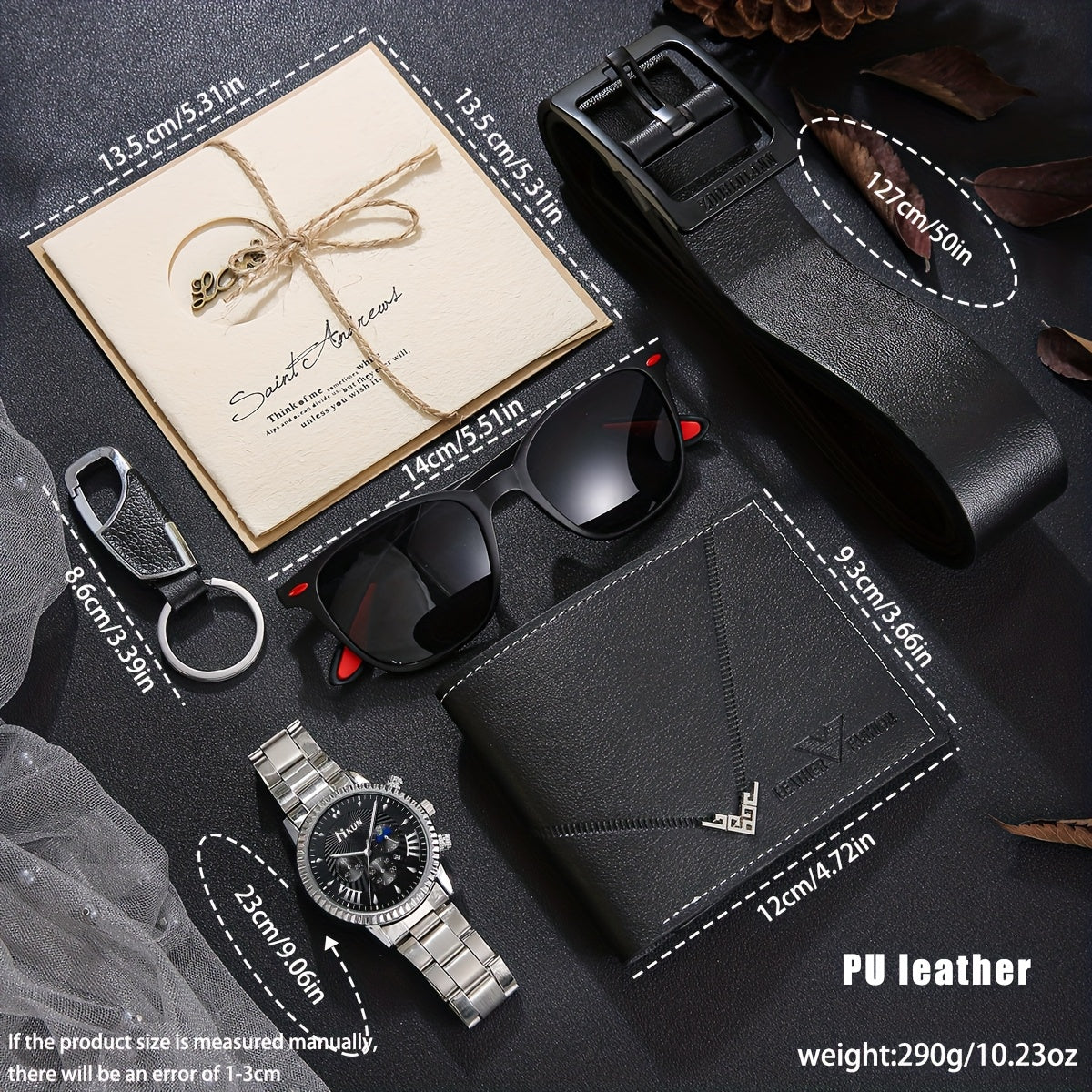 Men's Watch Six-piece Set, Alloy Wristwatch with Belt, Wallet, Glasses, Keychain and Greeting Card, Unique Temperament Makes You More Popular