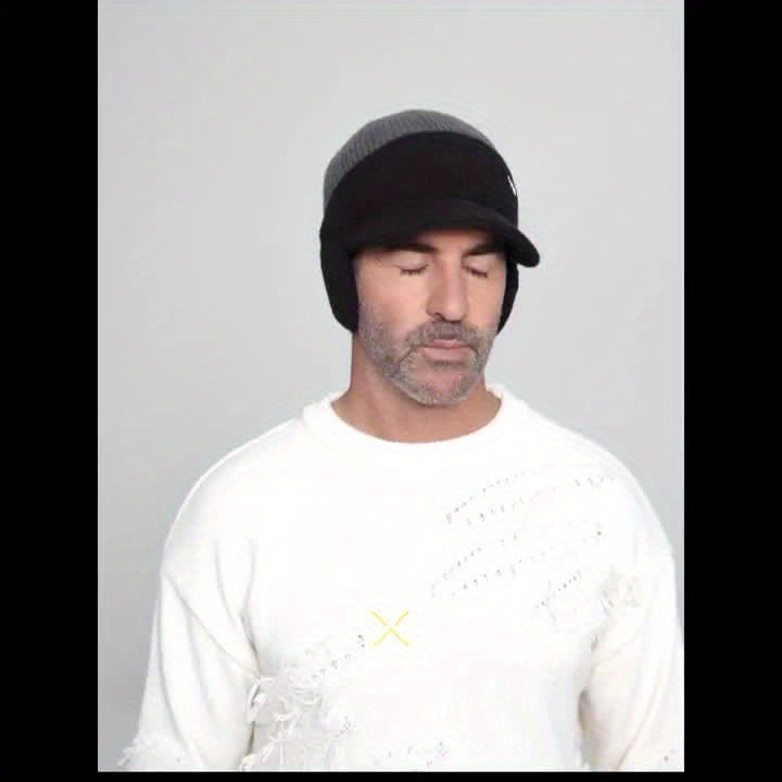 Men'S Winter Ear-Protecting Knitted Cap with Fleece, Warm Duckbill Hat for Outdoor Youth Cycling in a Color-Block Design.