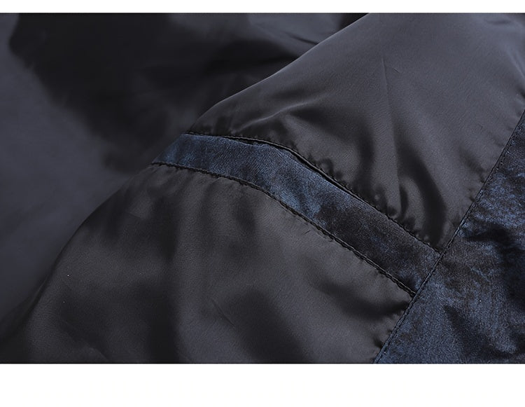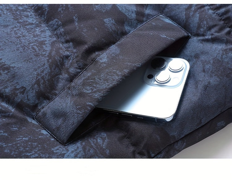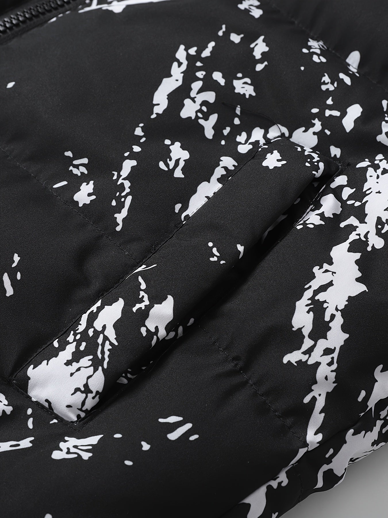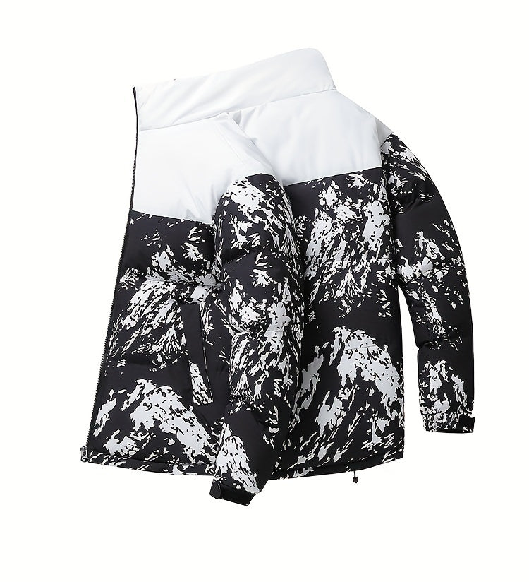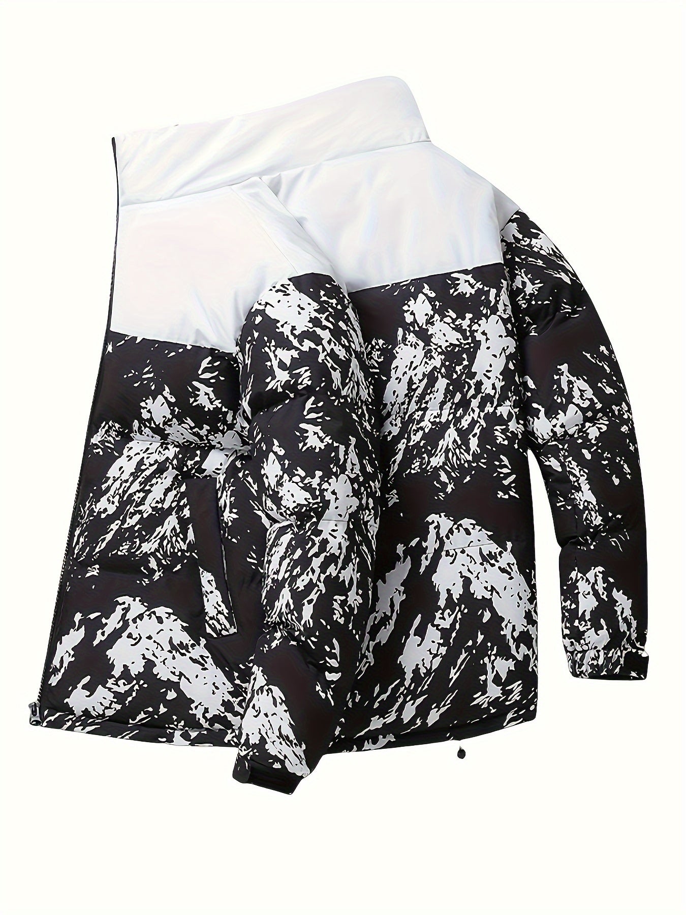 Men's Winter Jacket Windproof Coat with Stand Collar & Camo Marbled Pattern (Black/White/Grey) - Thickened Padded, Full-Zip Closure, for Skiing,, Outdoor Activities - Cold Weather Survival