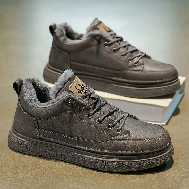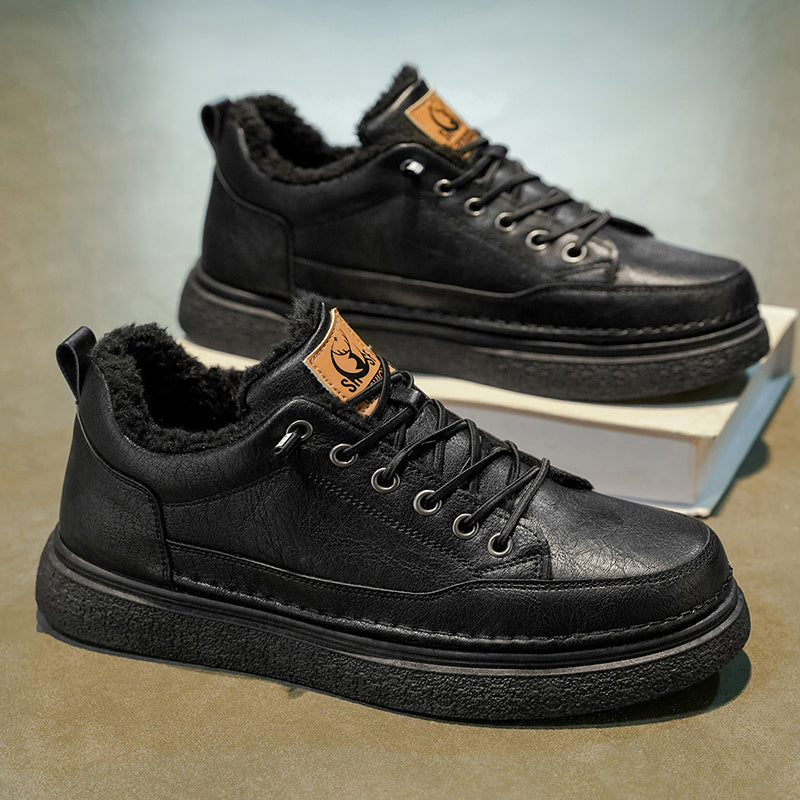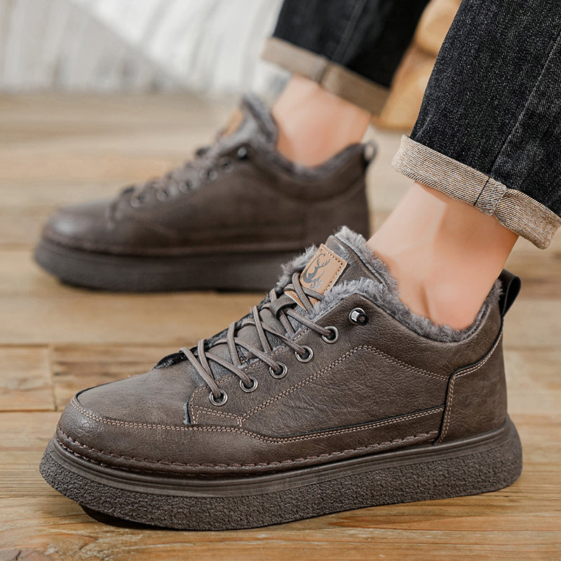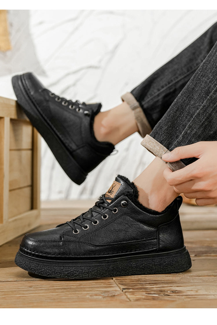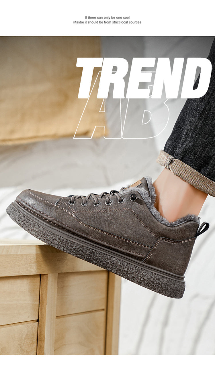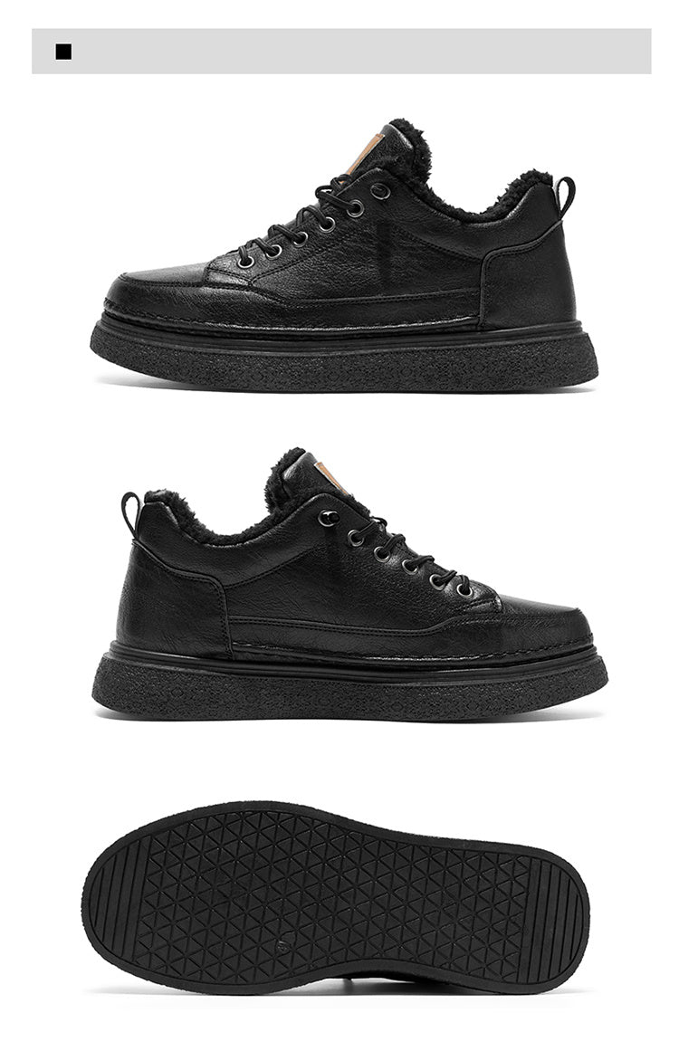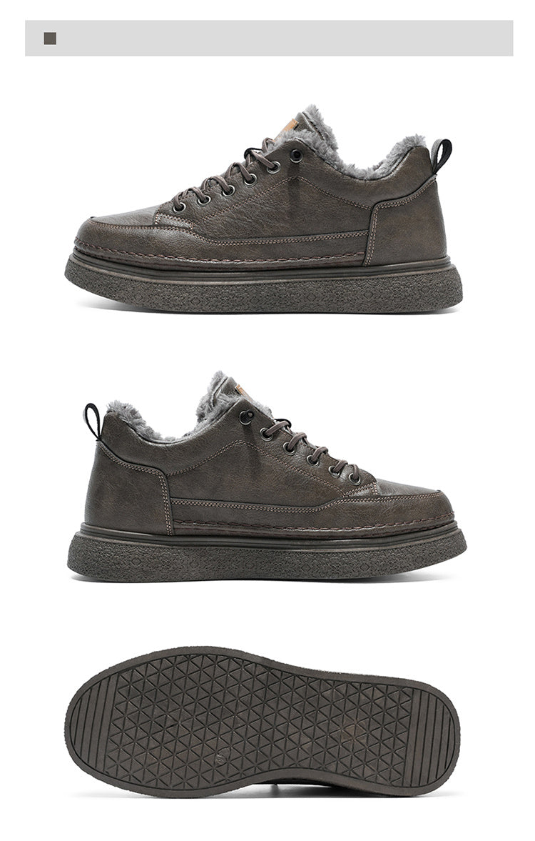 Men's Winter Warm PU -Like Hiking Sneakers with Plush -Like, EVA Cushioned Sole & Rubber Traction Tread - Low-Top Lace-Up Outdoor Shoes for Ice, Snow, Casual Wear (Black/Brown) - Cold Weather