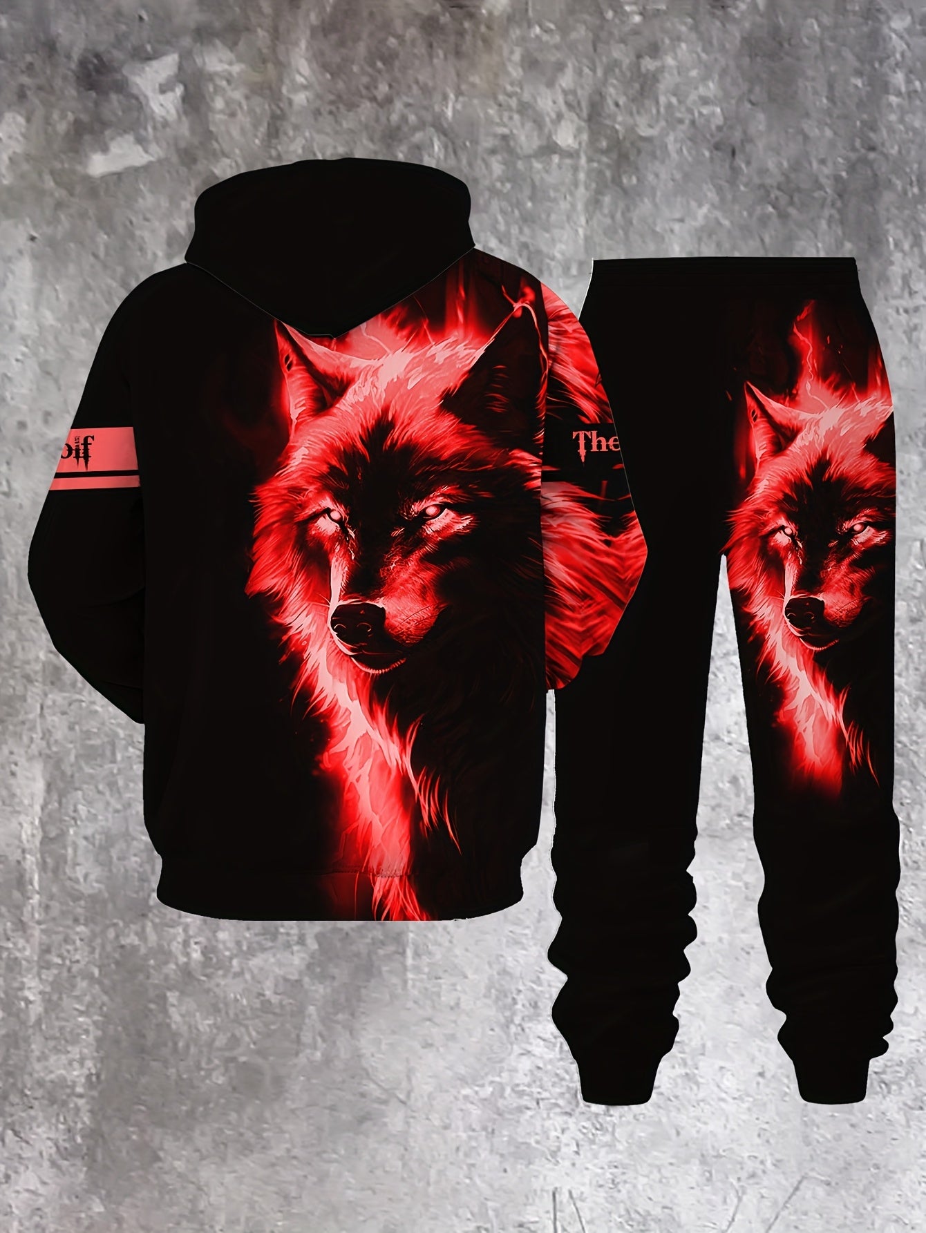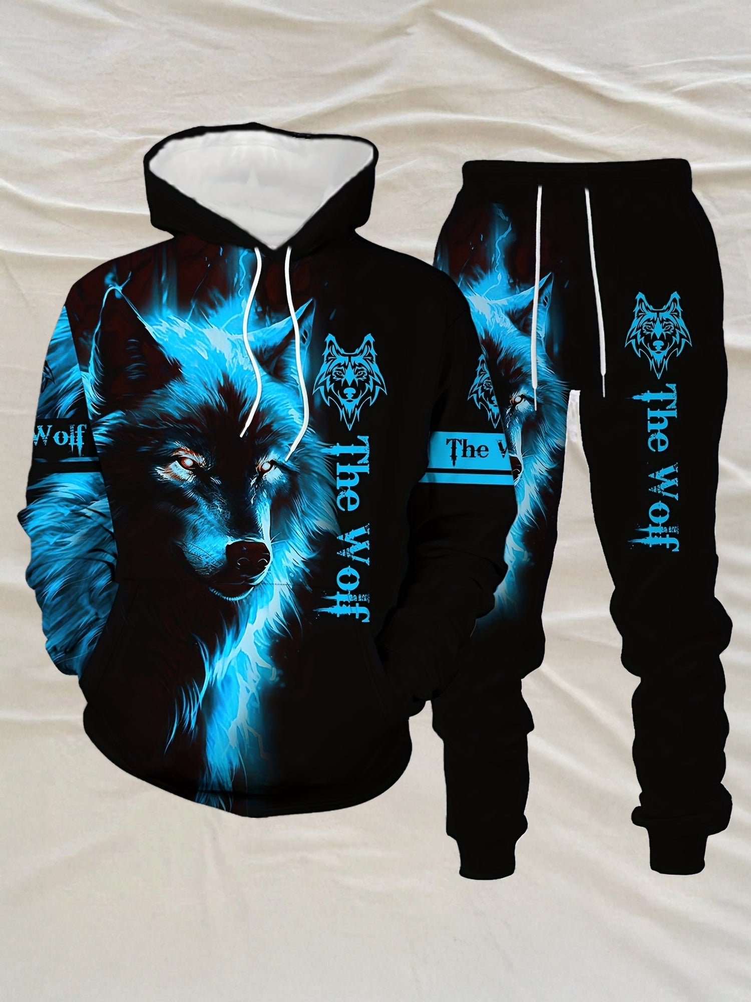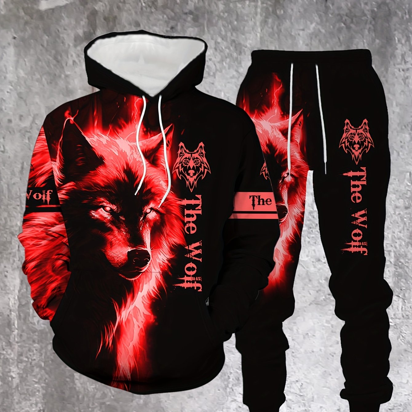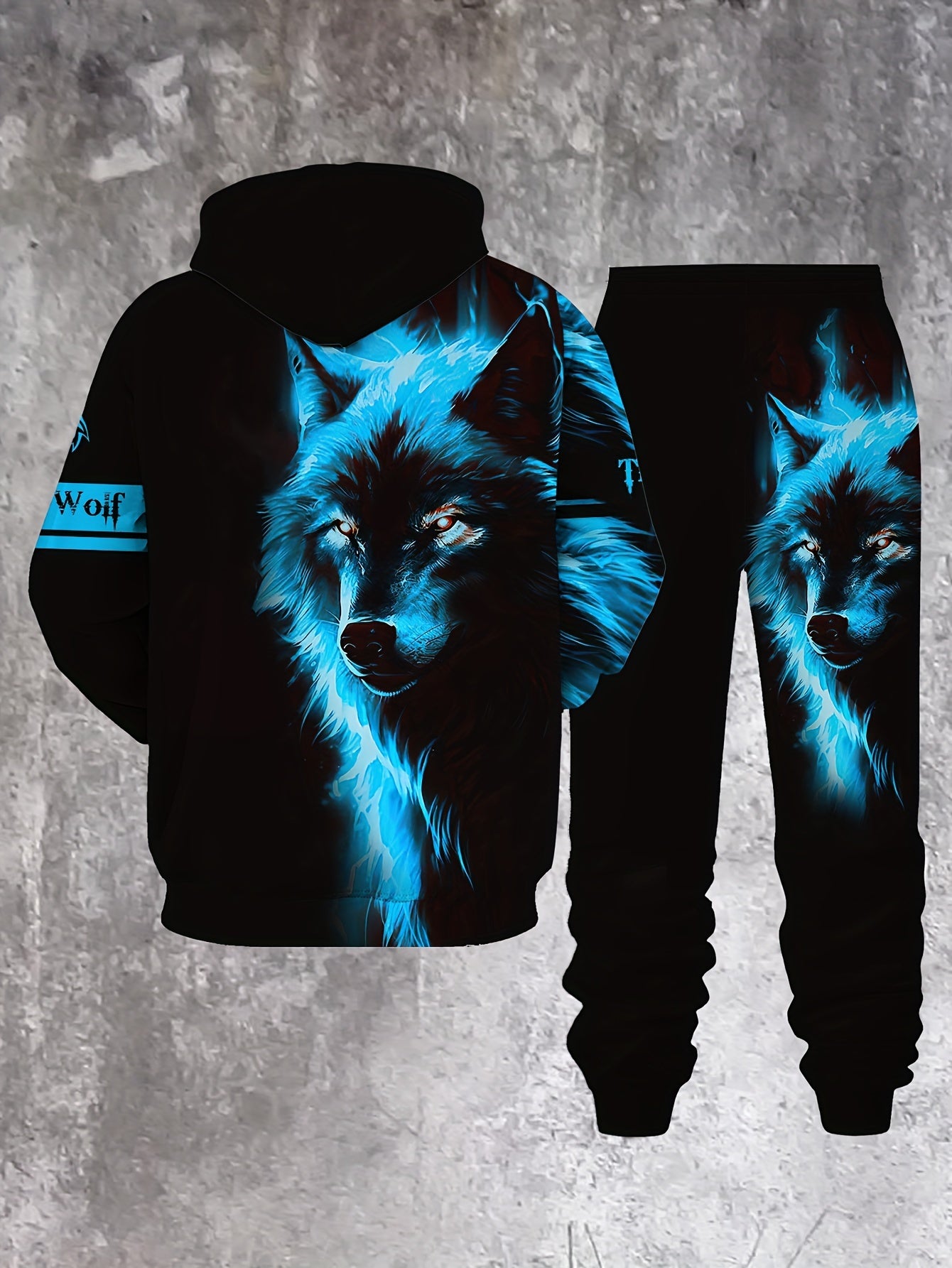 Men'S Wolf Print Hooded Sweatshirt and Joggers Set, Casual Polyester Knit Fabric, Slight Stretch, Regular Fit, Comfortable Long Sleeve Pullover for Spring/Fall, Weekend Casual Wear