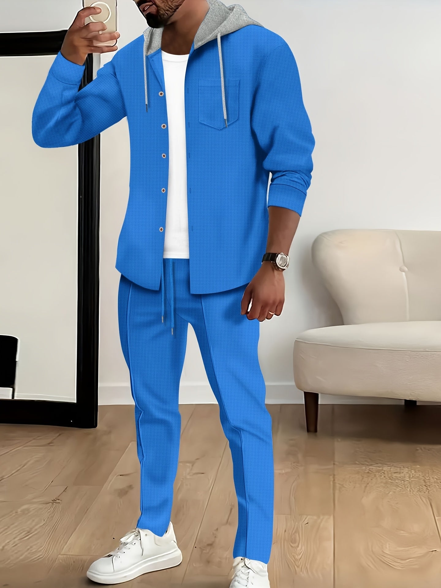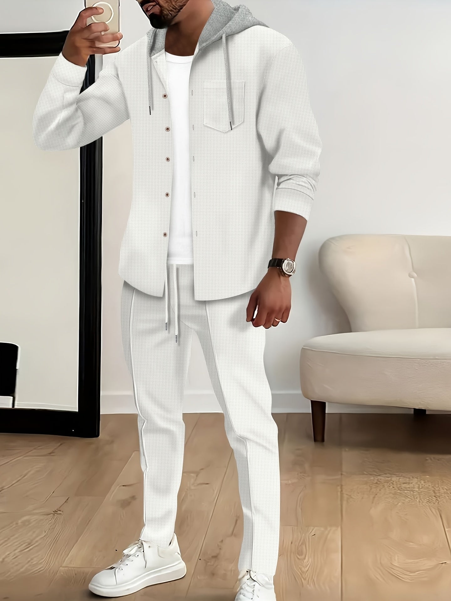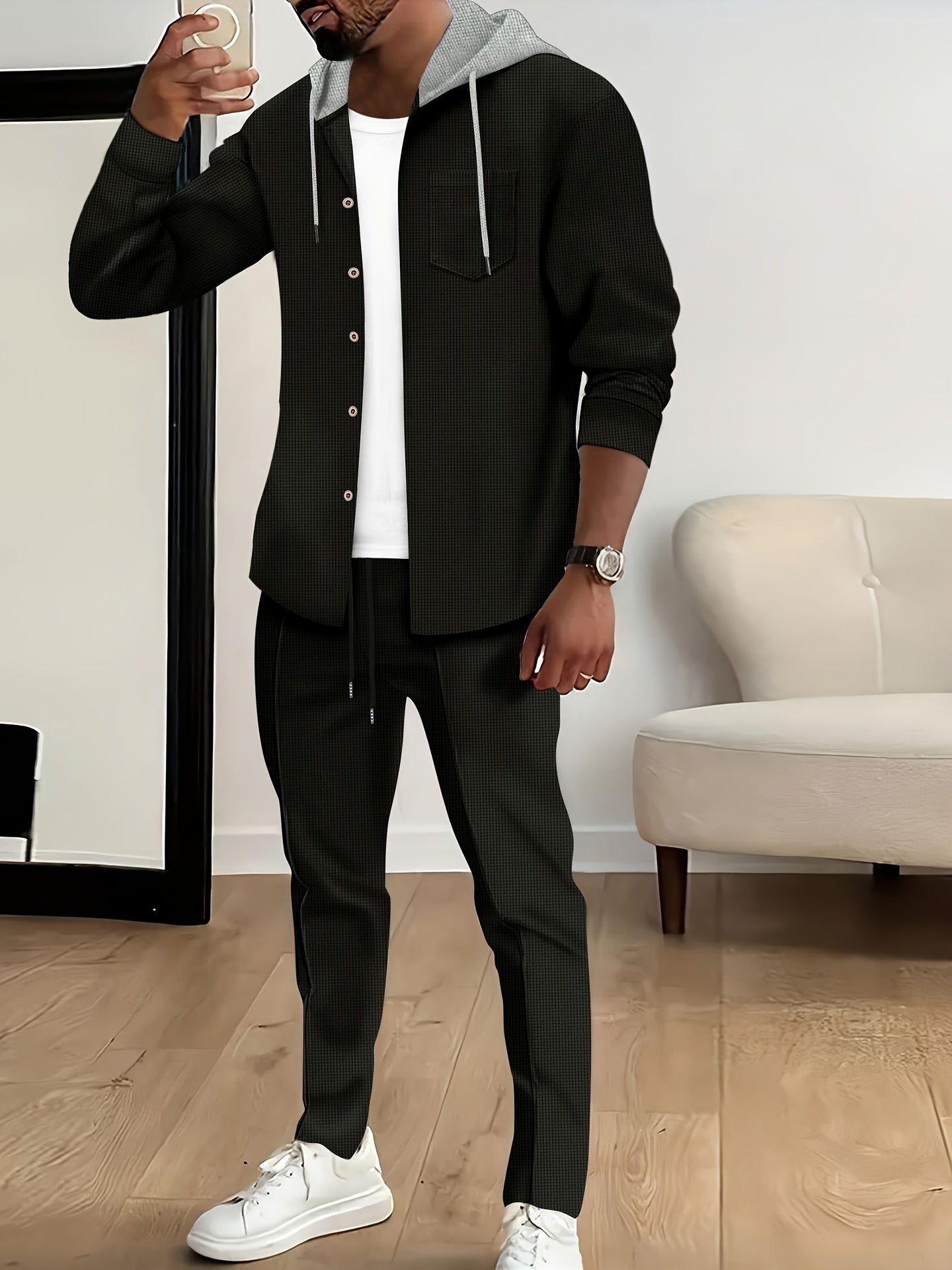 New Long Sleeve Buttoned Hooded Jacket and Rope Pants Set for Spring and Autumn, Waffle Solid Classic Men's Sports 2pcs Sports Suit - Sports Suit for Outdoor Sports Enthusiasts, Breathable and Comfortable