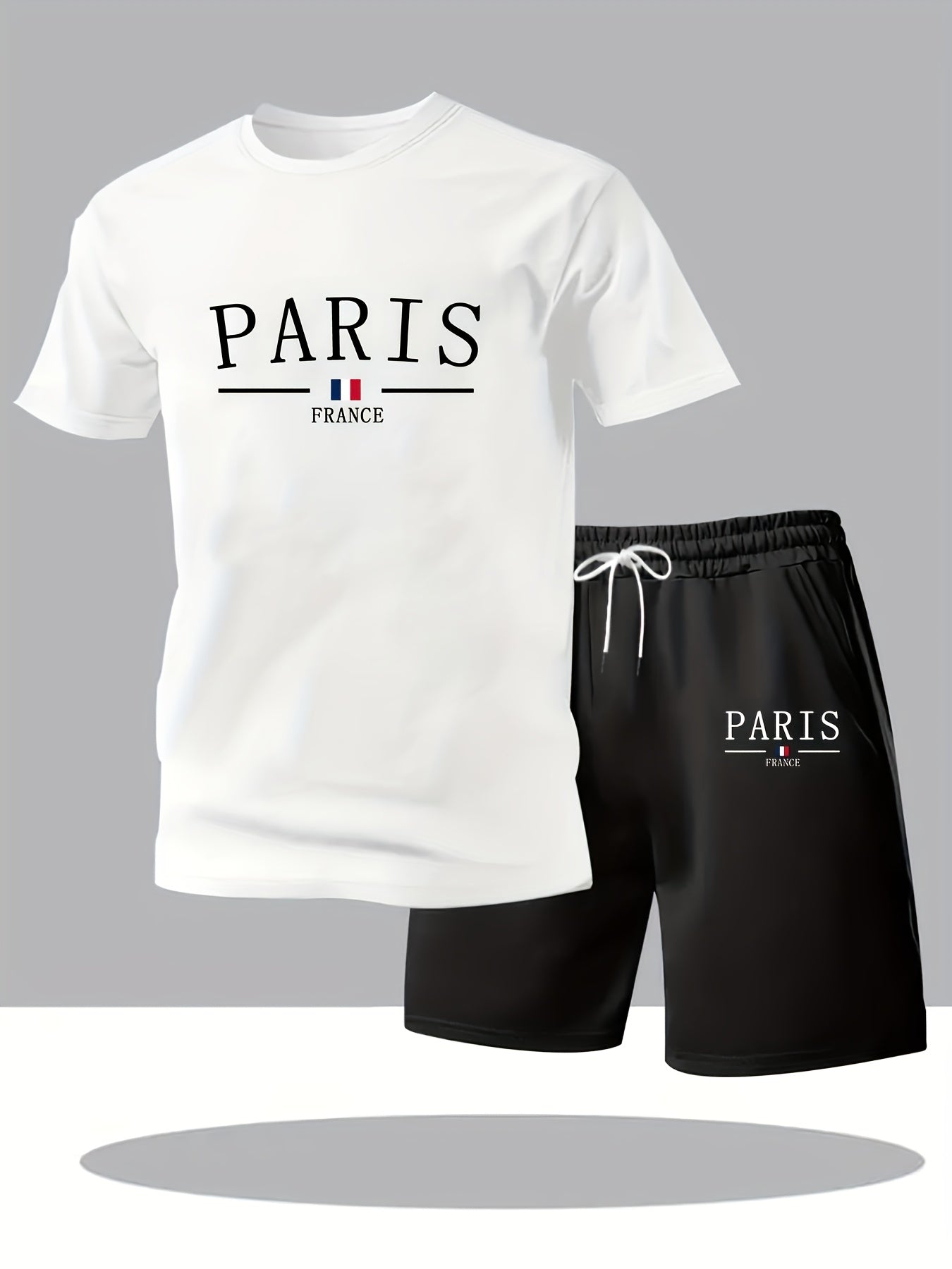Paris Gradient Letter Print Men's Two-Piece Set: Crew Neck Short Sleeve T-Shirt and Drawstring Shorts Summer Casual Sportswear