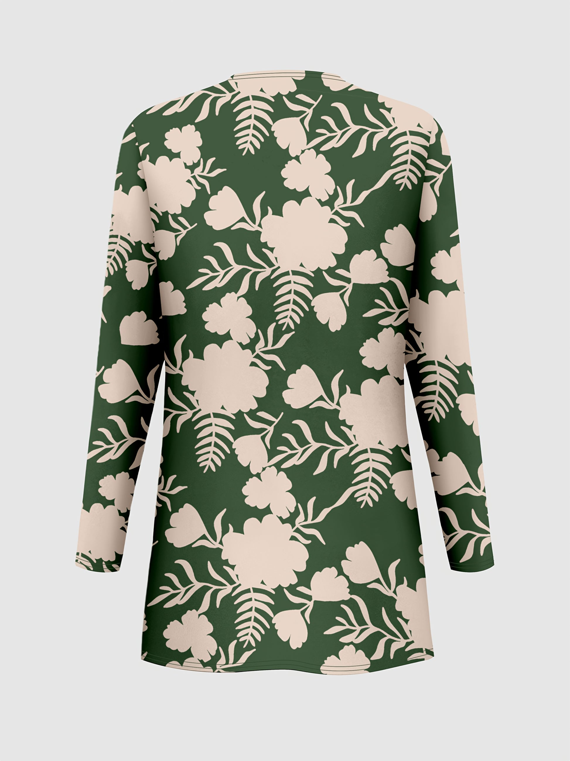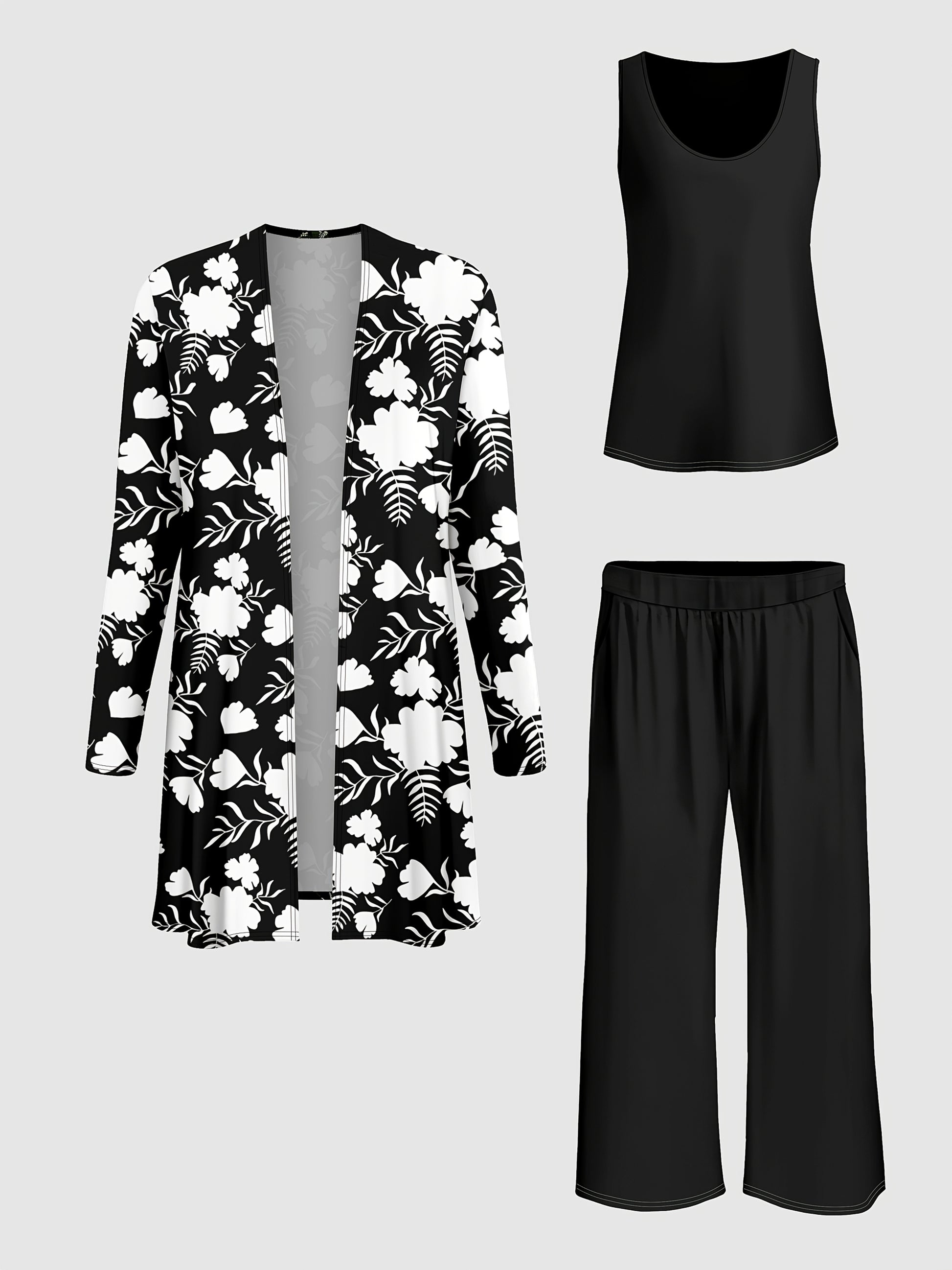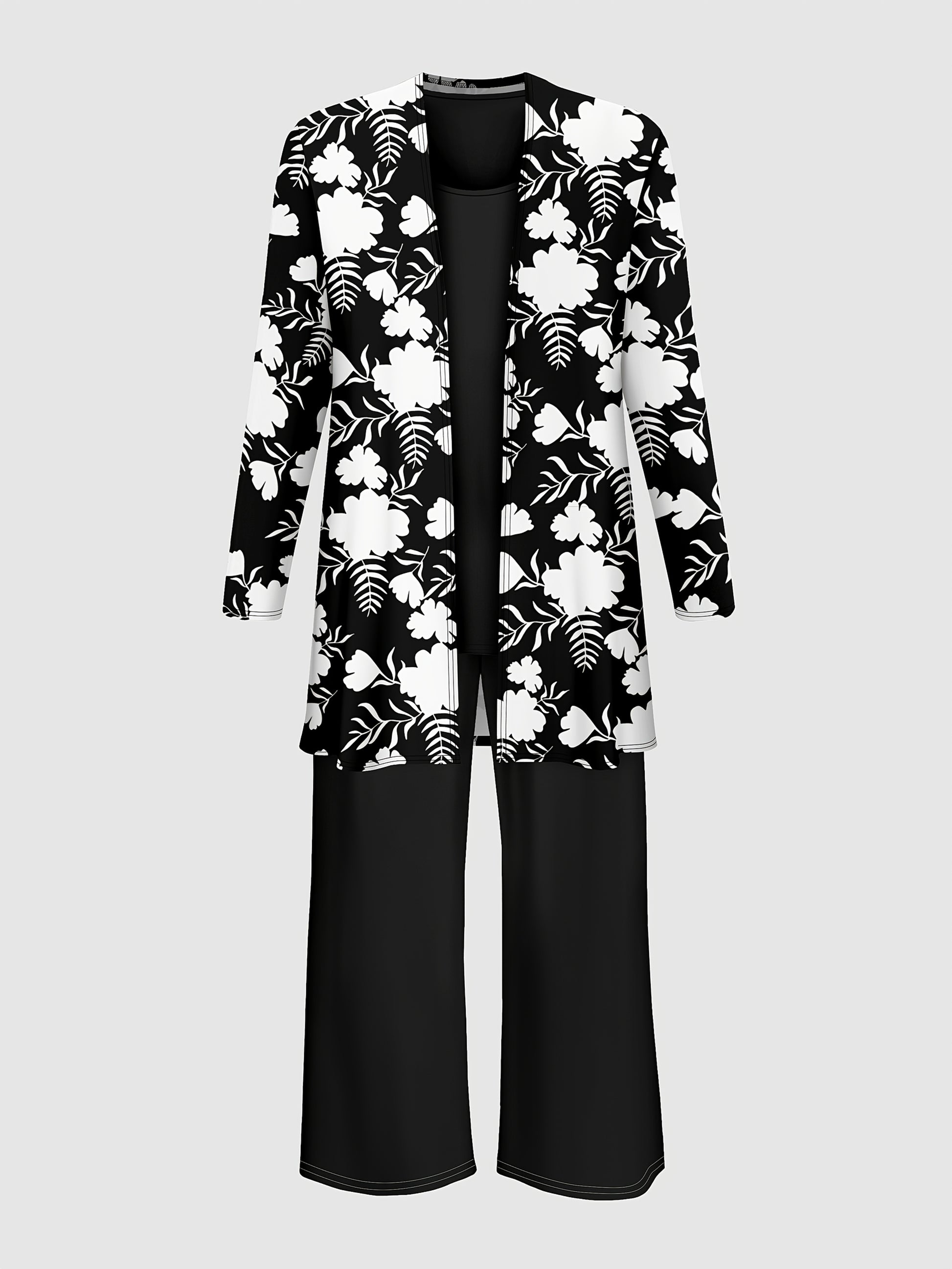 Plus Size, A three-piece set of Women's plus-size elegant floral print top and solid-color vest pants