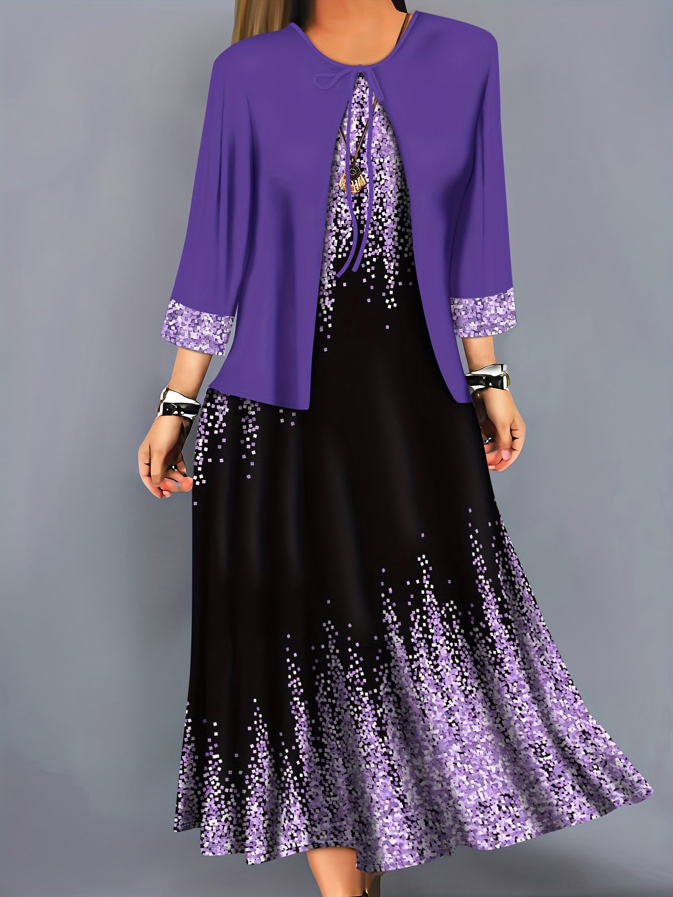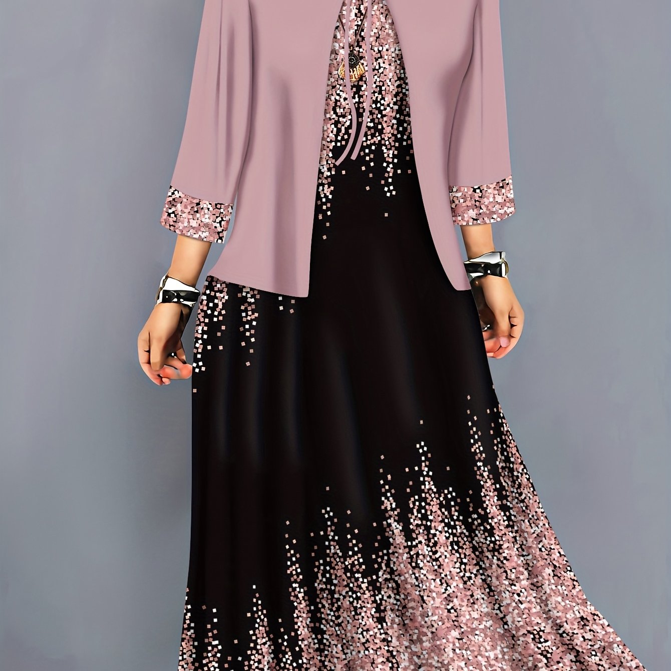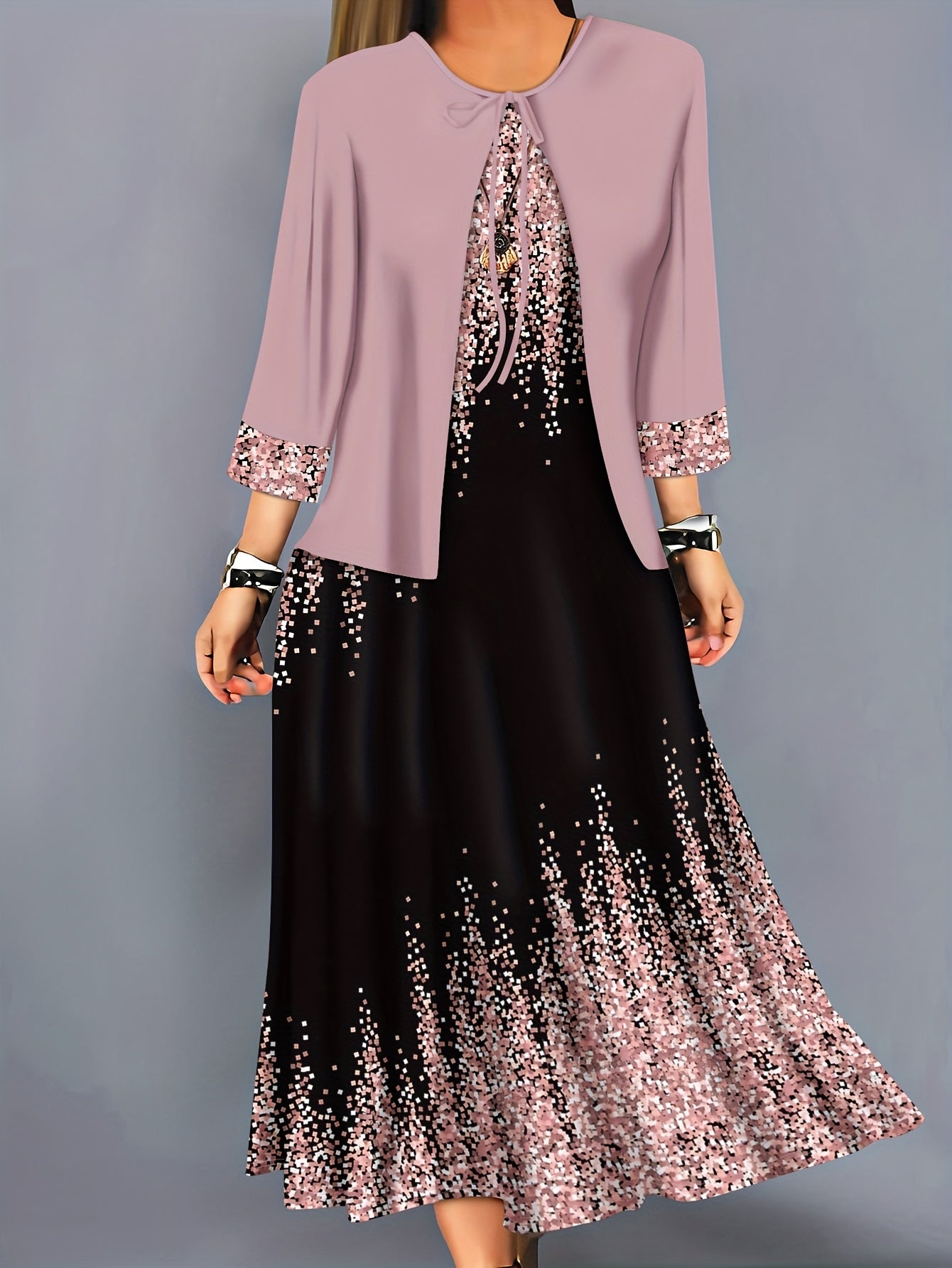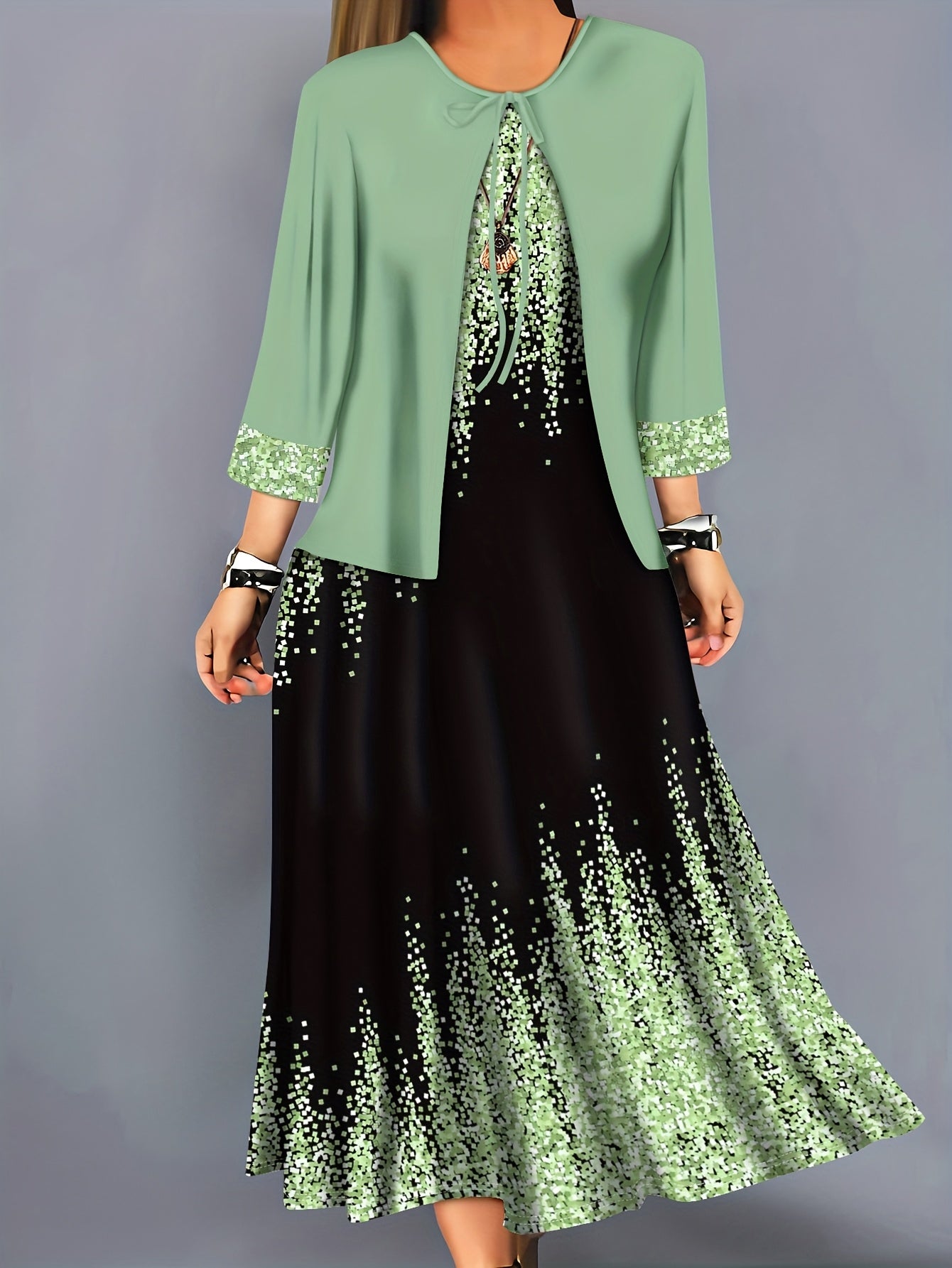 Plus Size, Spring-Summer Elegant Plus Size Floral Print Fashion Vacation Wrap Vest Long Dress Women's Set Without Accessories
