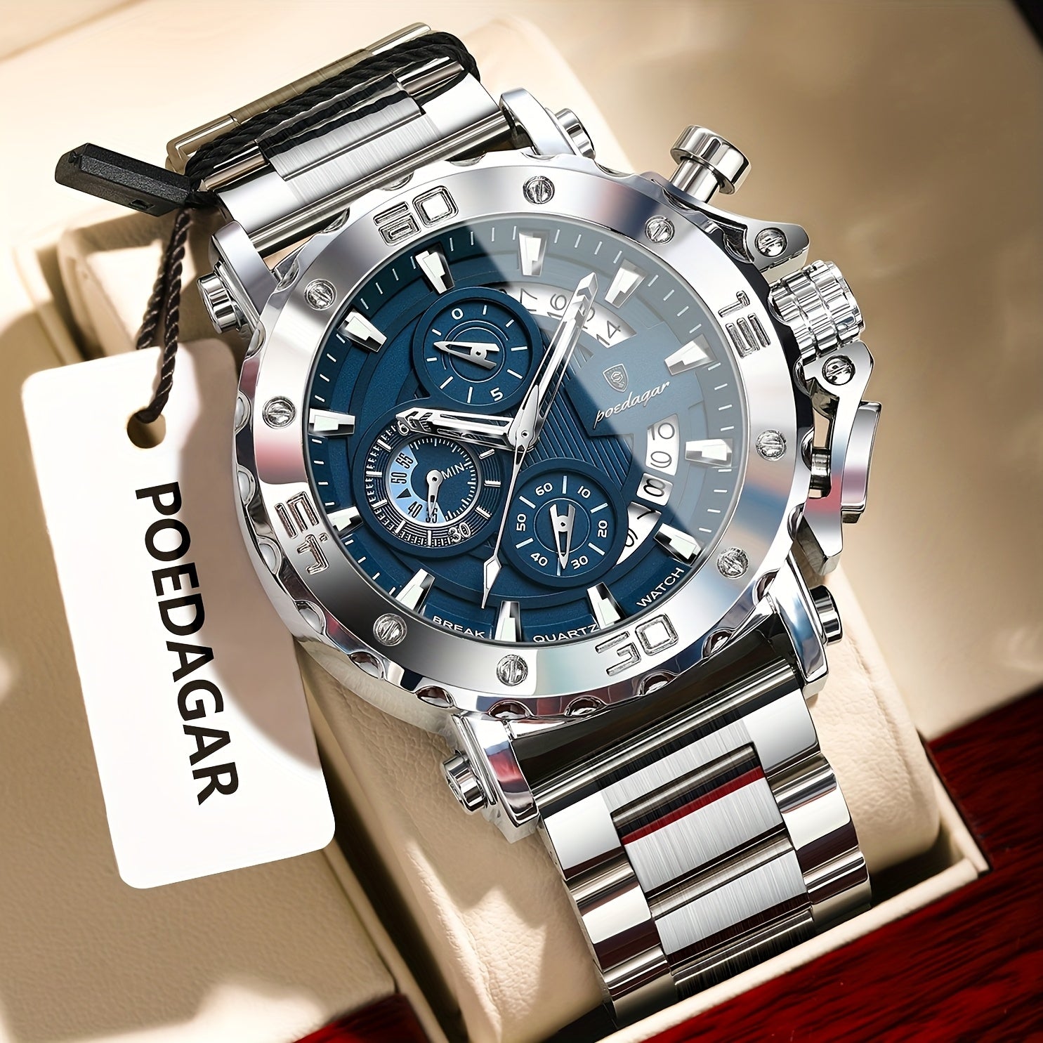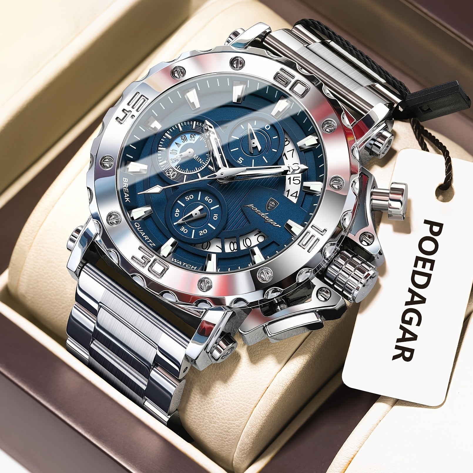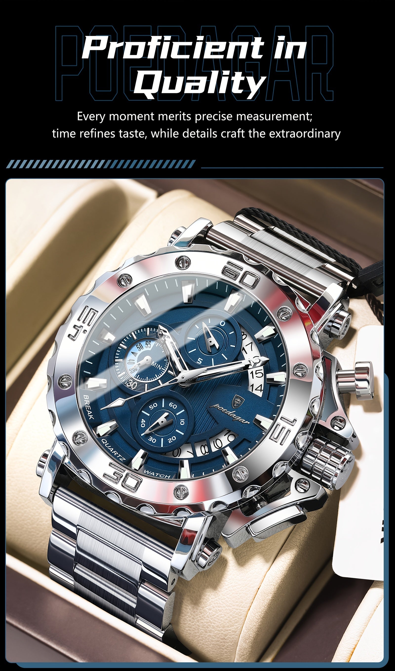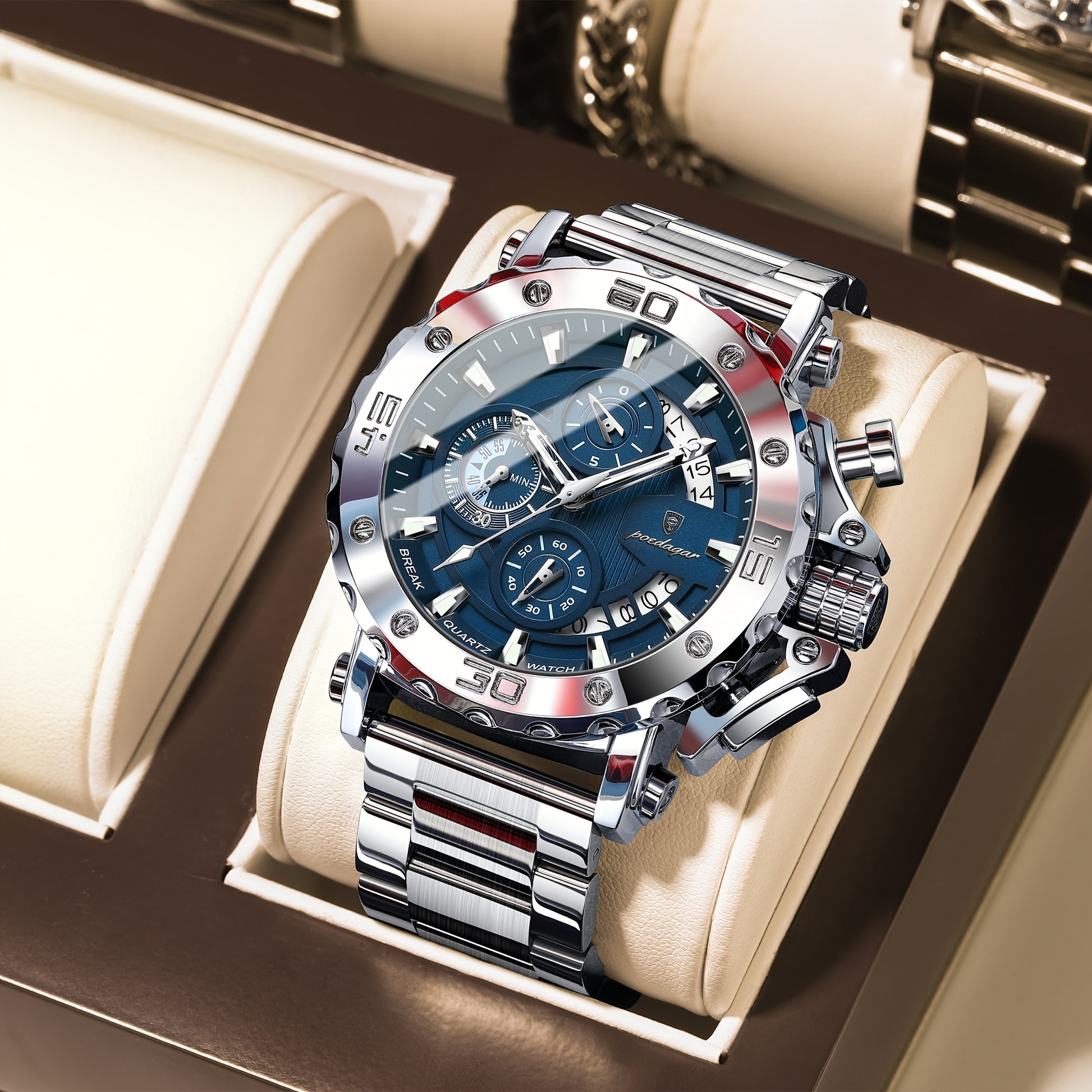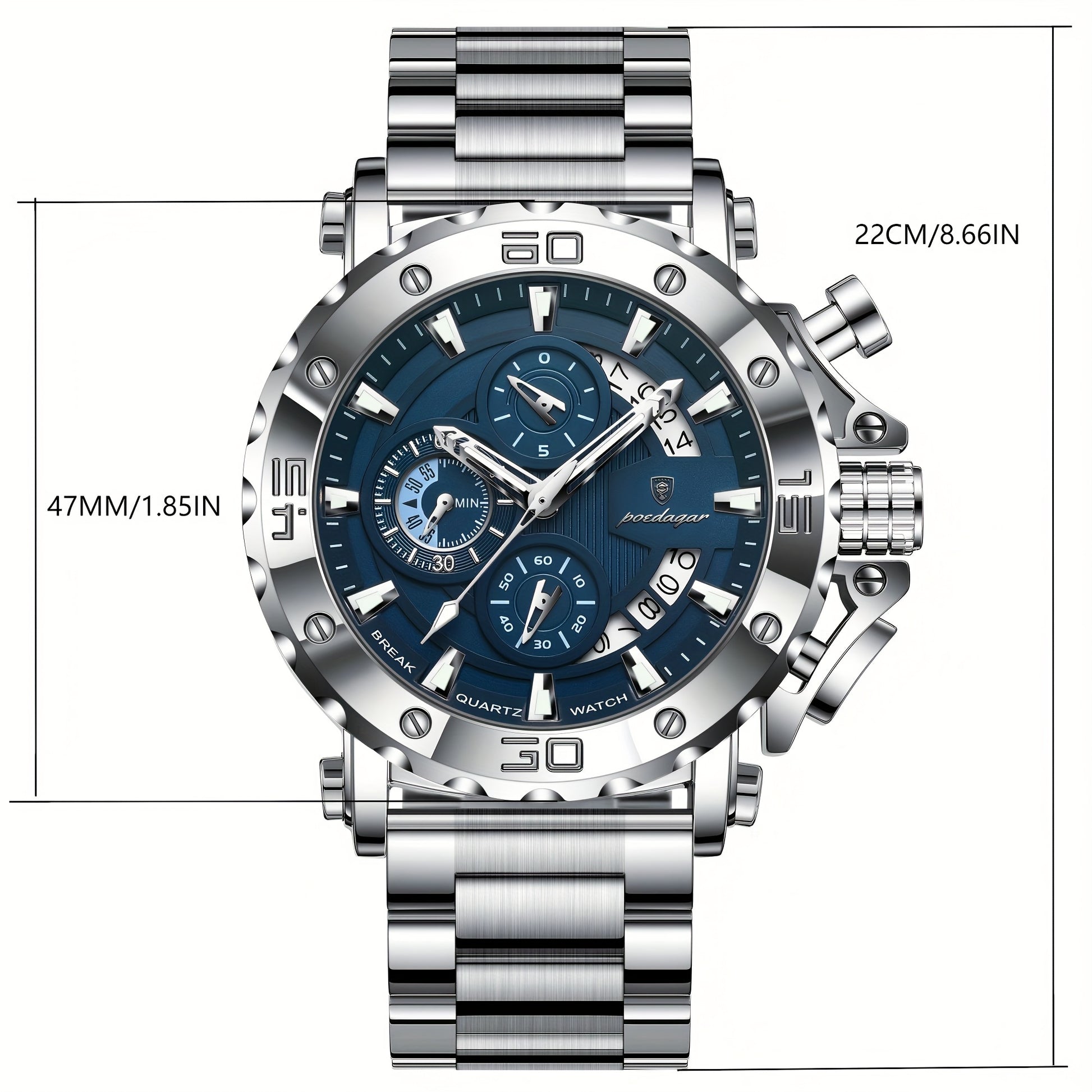 POEDAGAR Men'S Luxury Stainless Steel Business Watch with Date Display, 3ATM Blue Dial, Rotating Bezel, Alloy Case, Quartz Movement - Elegant Formal Accessory, Formal Accessory|Luxurious Watch|Quartz Movement Watch
