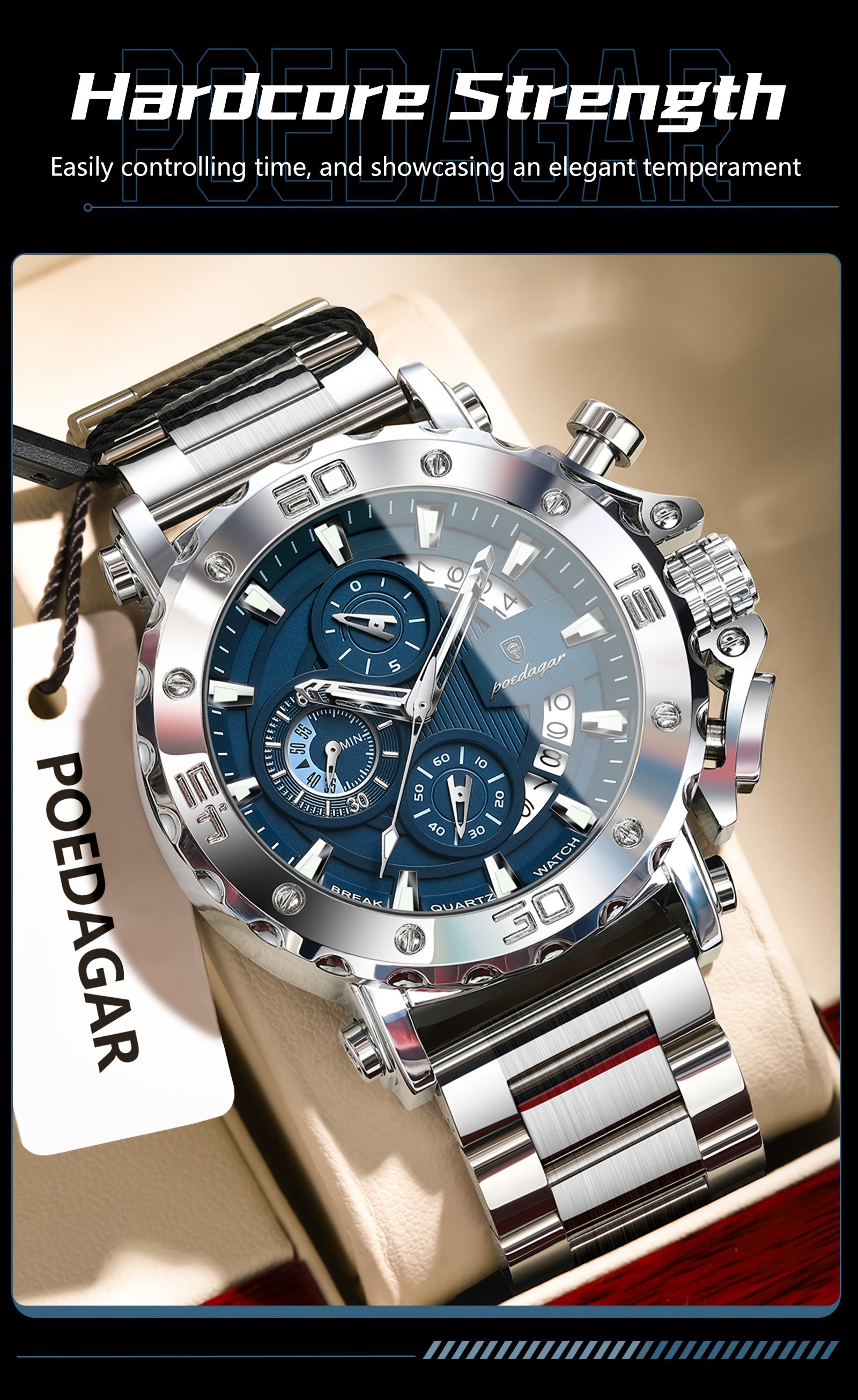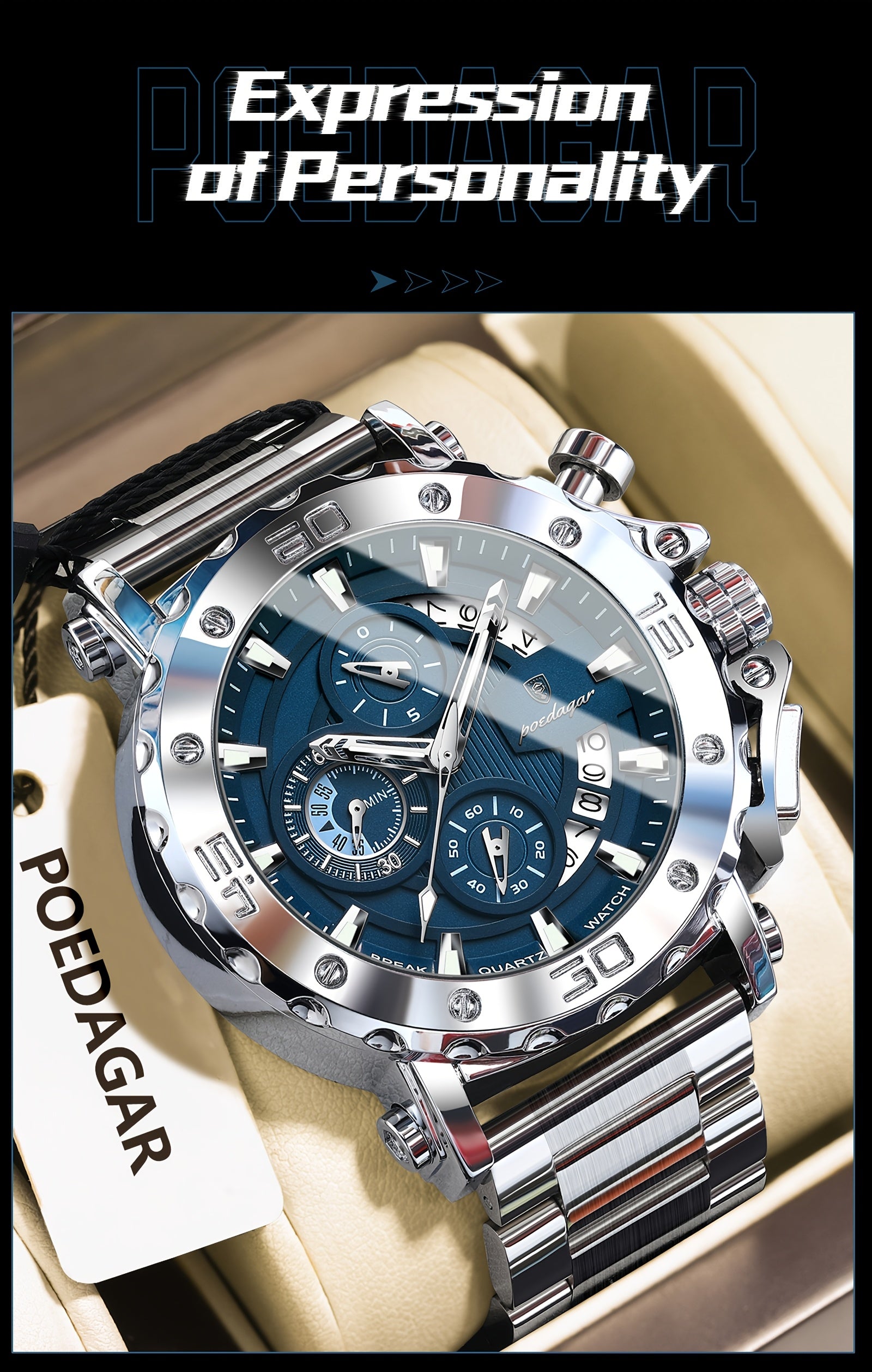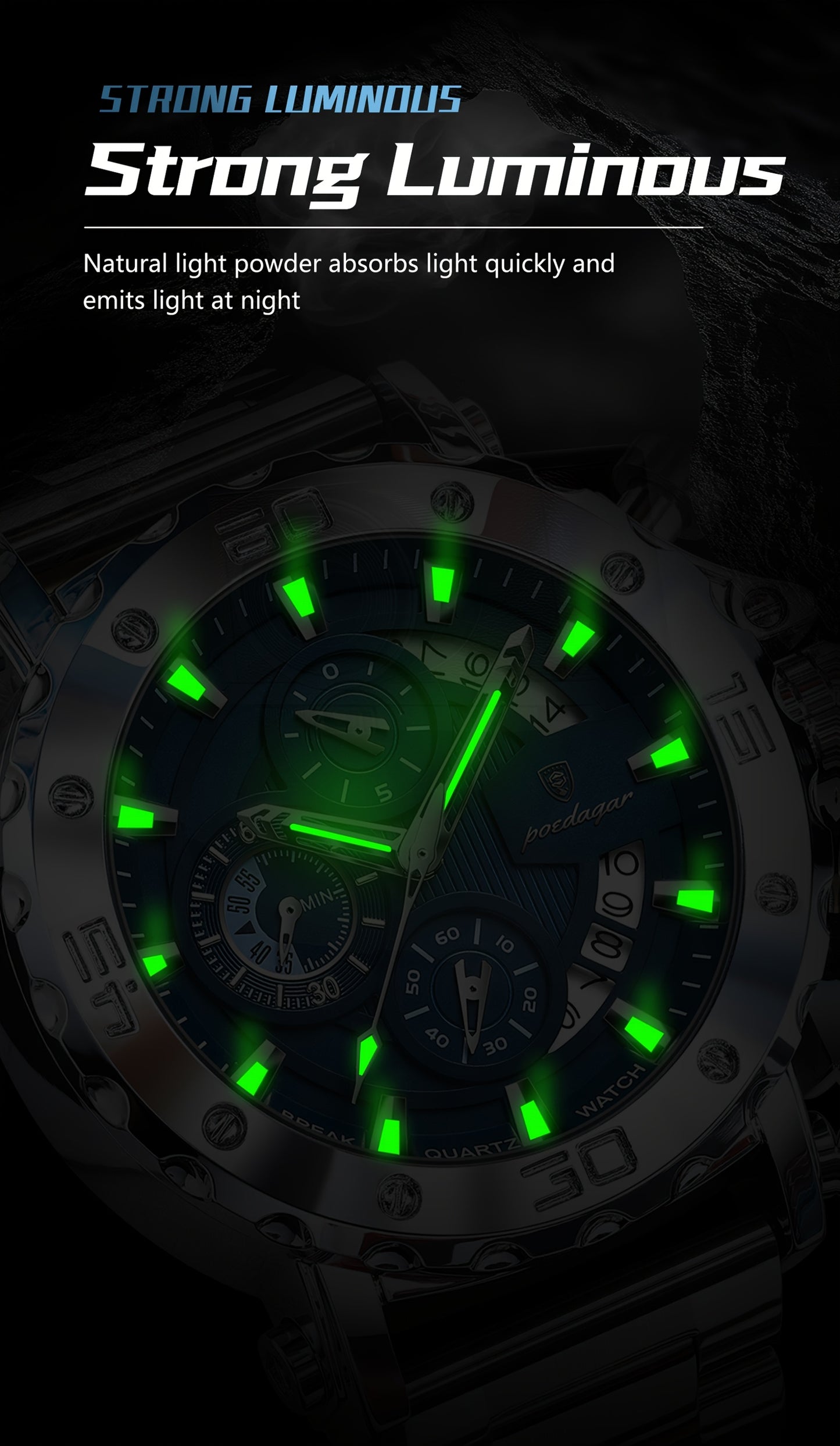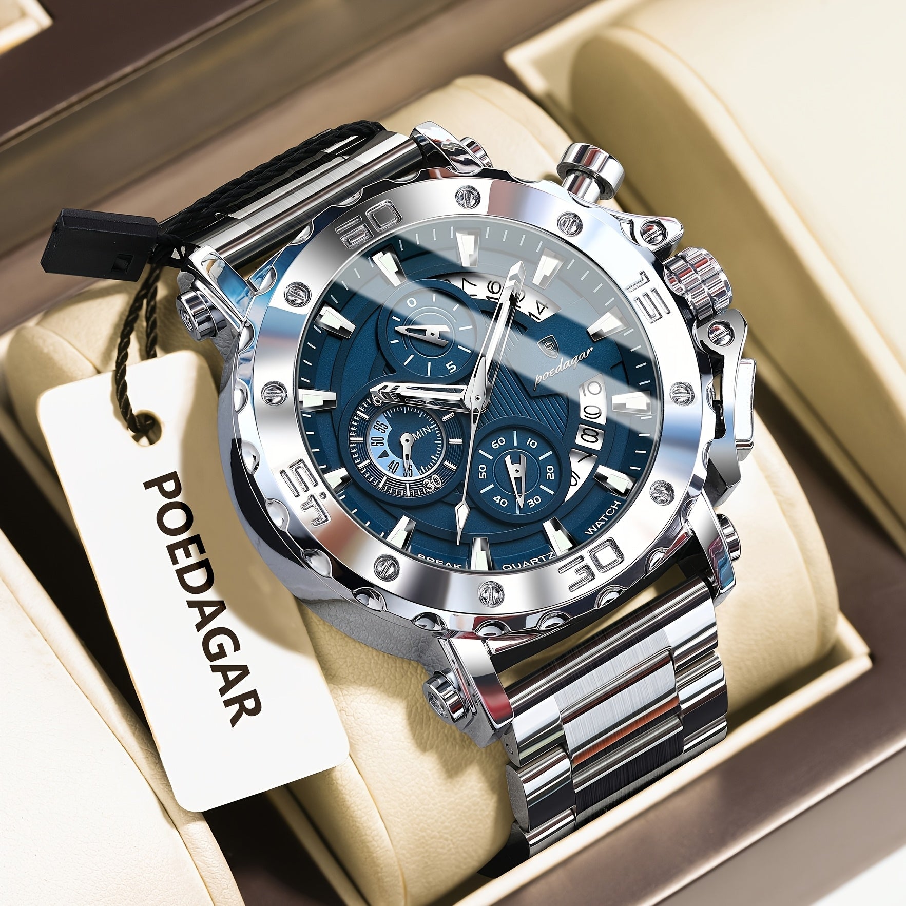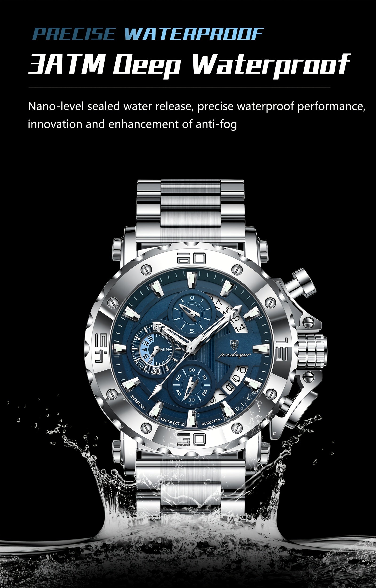 POEDAGAR Men'S Luxury Stainless Steel Business Watch with Date Display, 3ATM Blue Dial, Rotating Bezel, Alloy Case, Quartz Movement - Elegant Formal Accessory, Formal Accessory|Luxurious Watch|Quartz Movement Watch