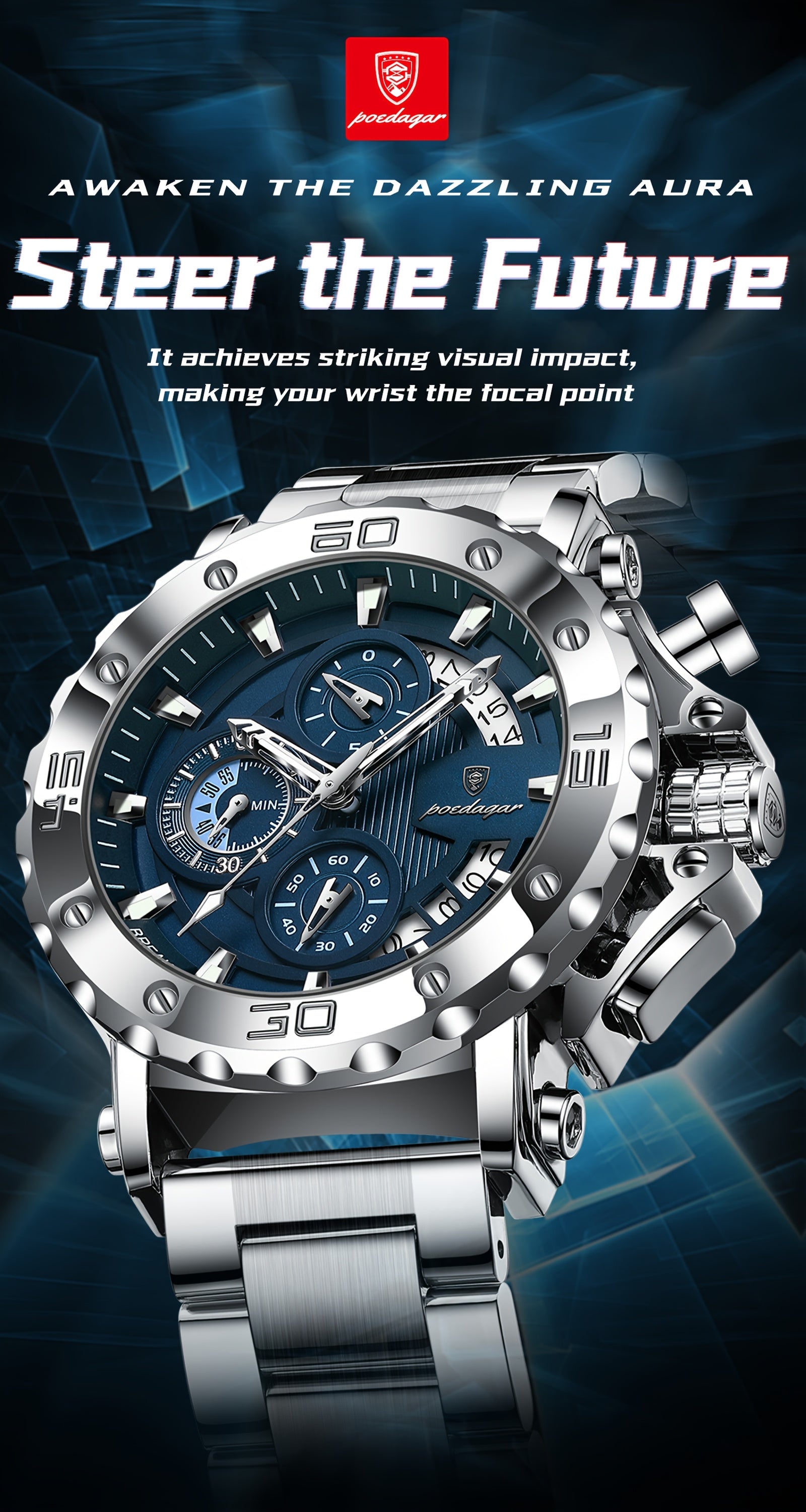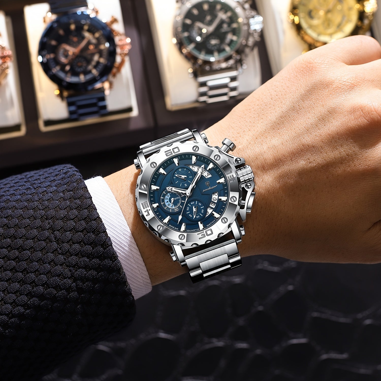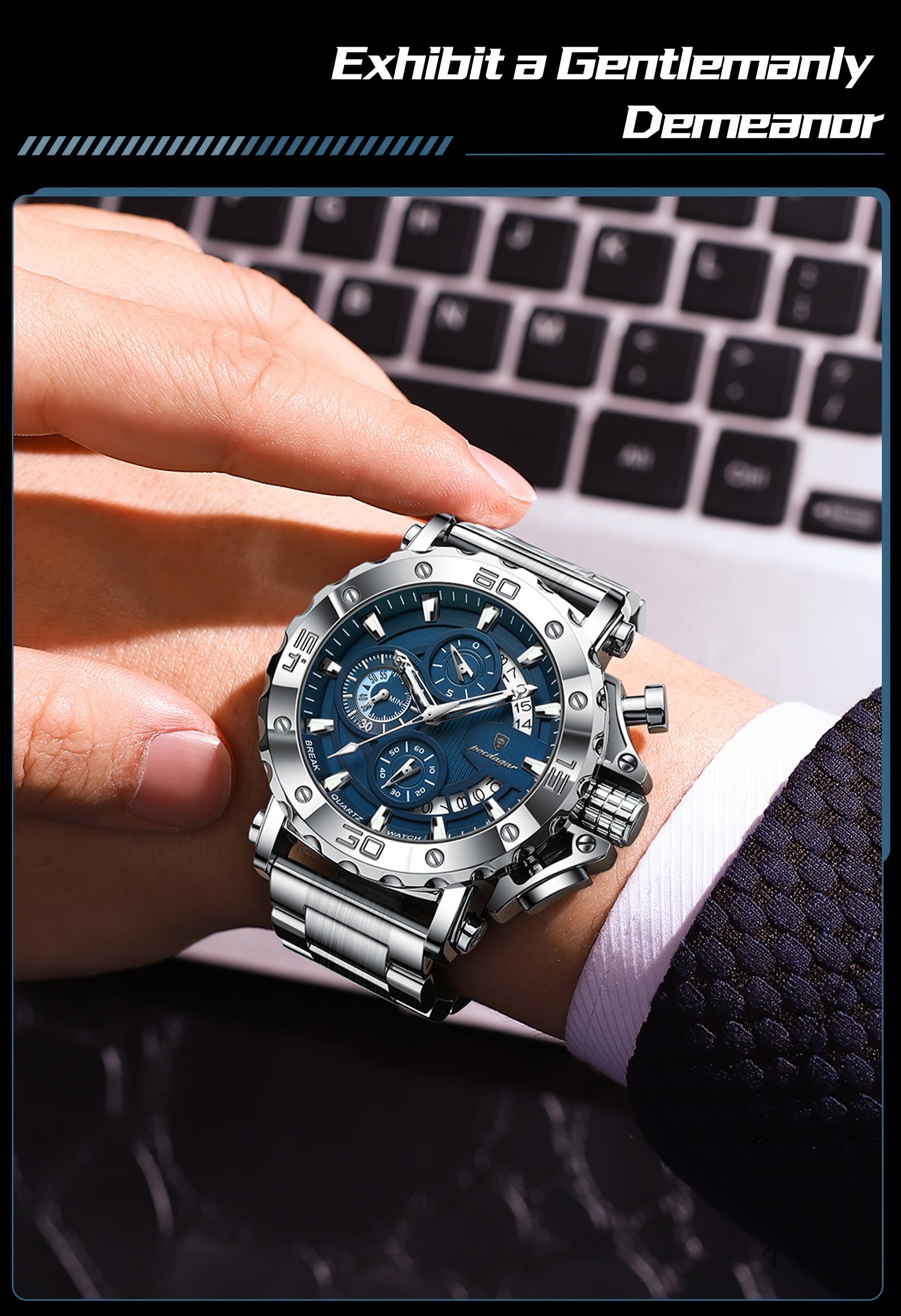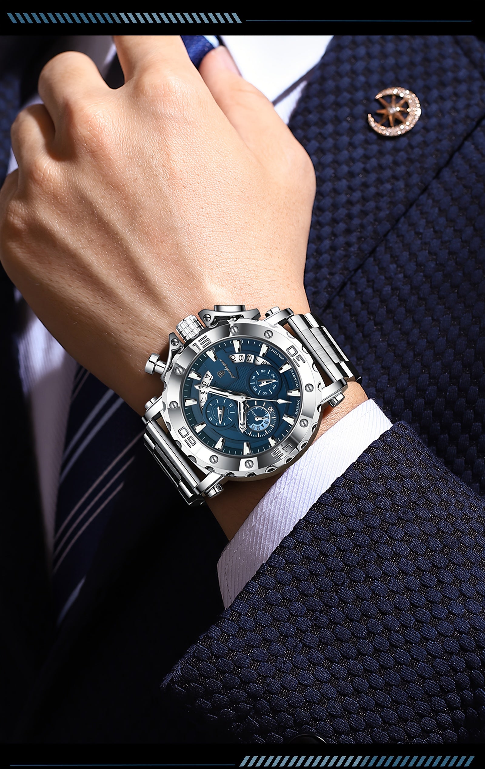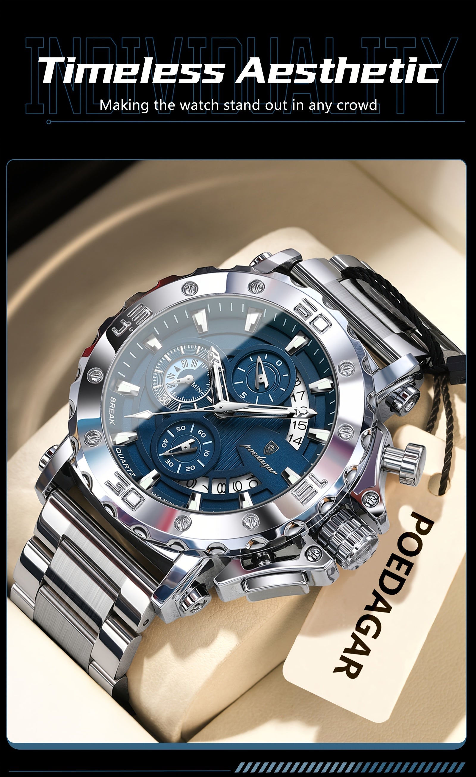 POEDAGAR Men'S Luxury Stainless Steel Business Watch with Date Display, 3ATM Blue Dial, Rotating Bezel, Alloy Case, Quartz Movement - Elegant Formal Accessory, Formal Accessory|Luxurious Watch|Quartz Movement Watch