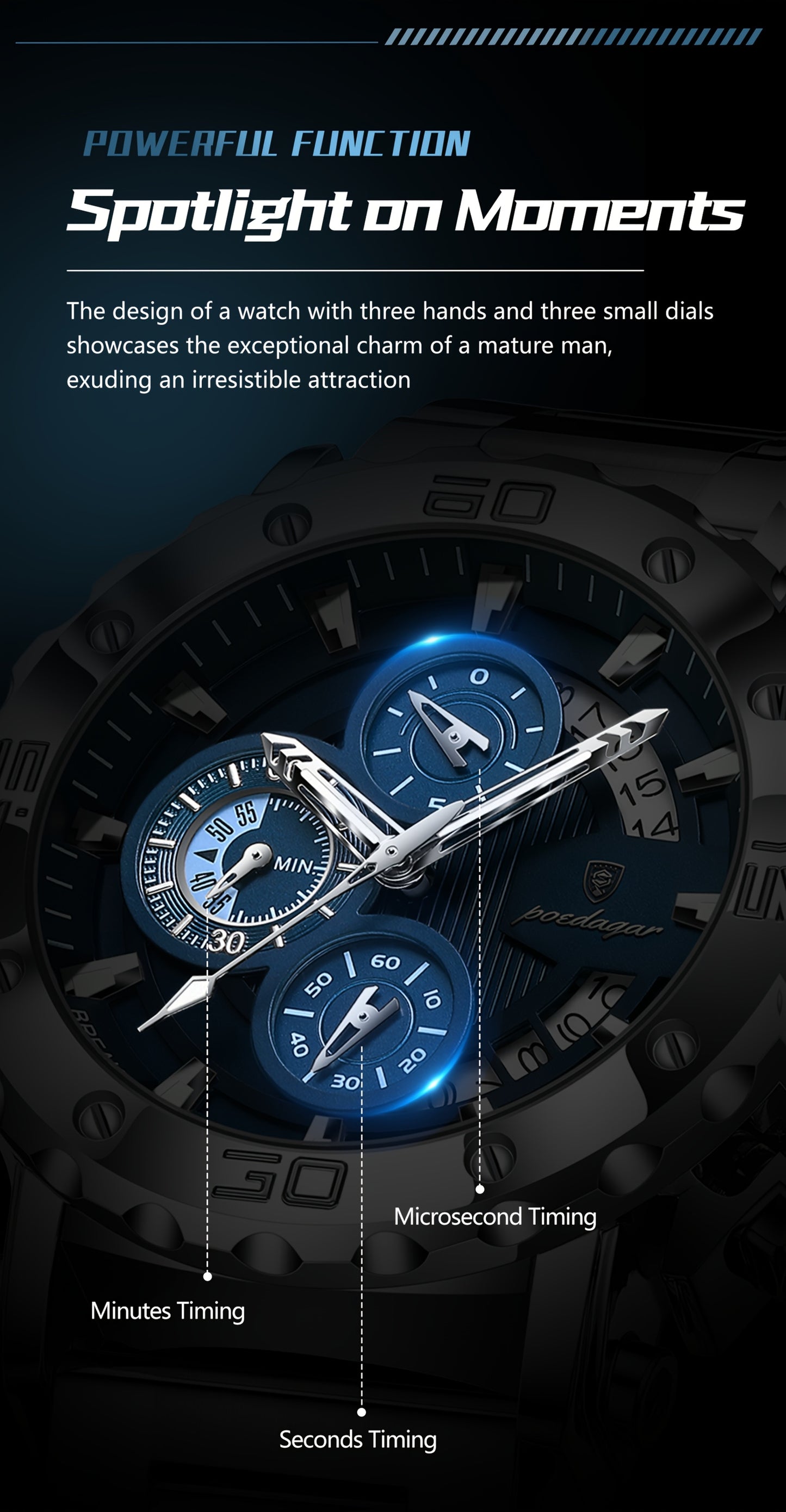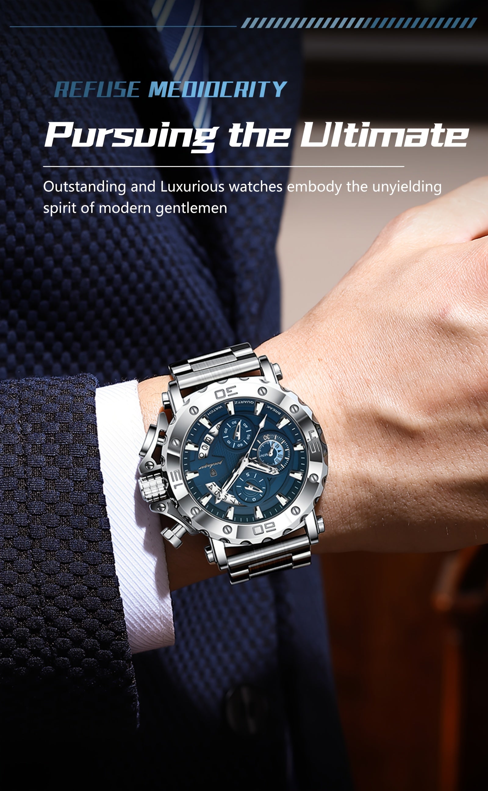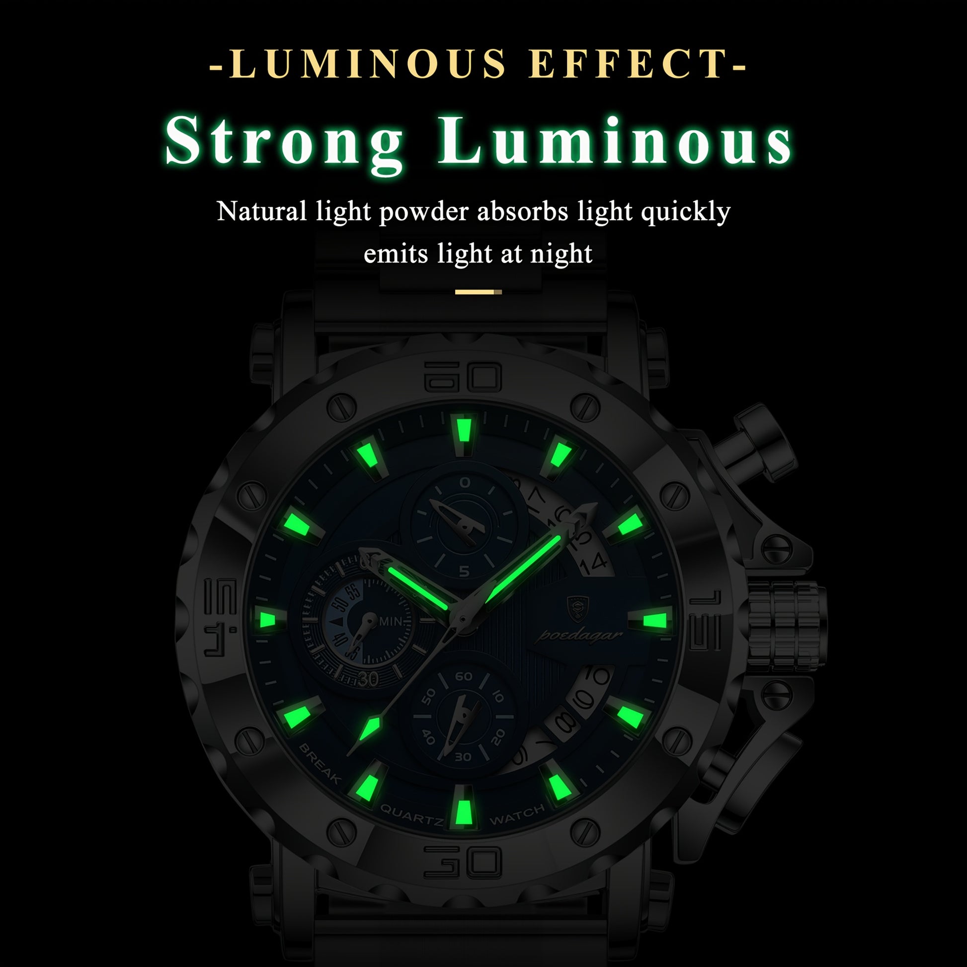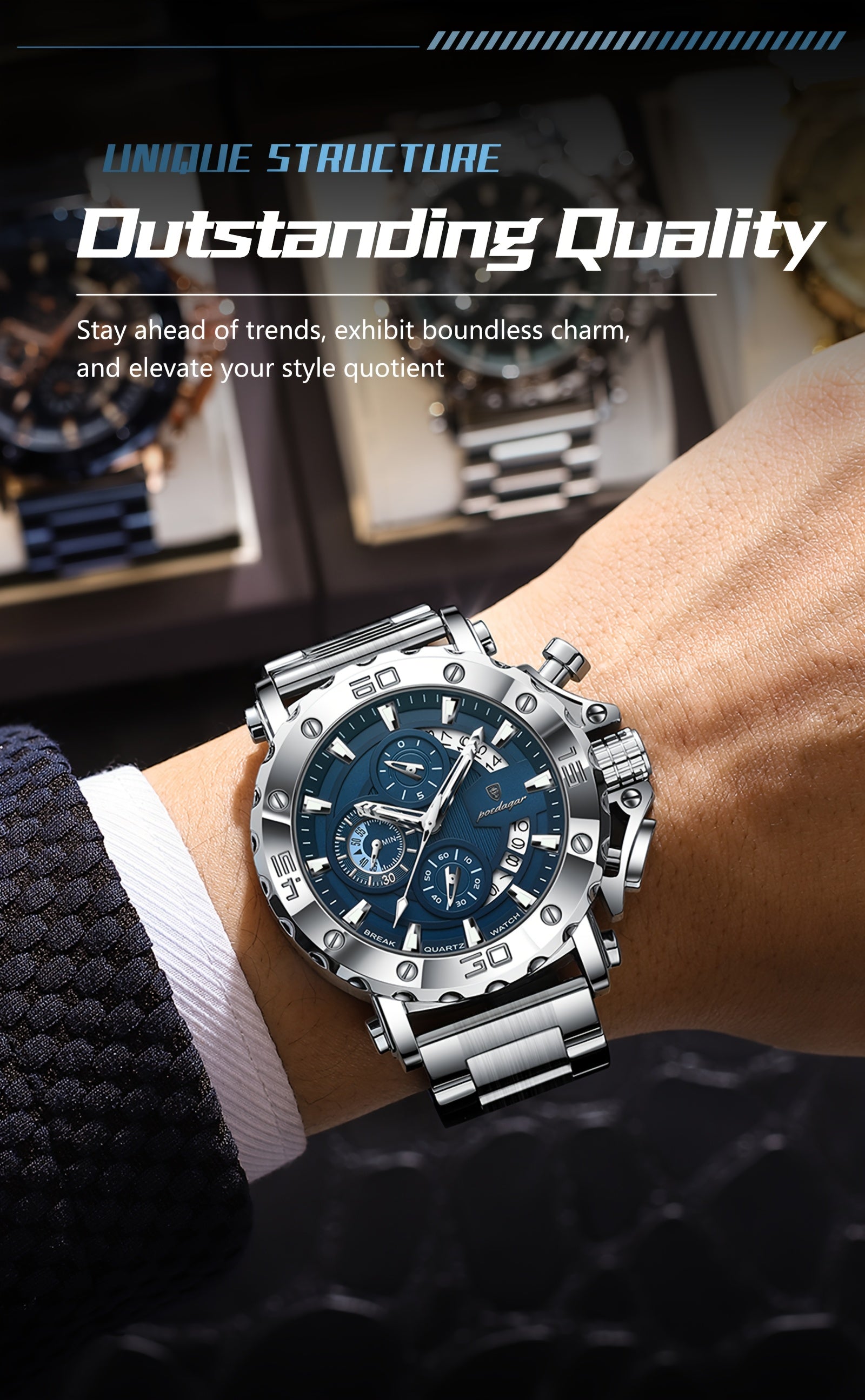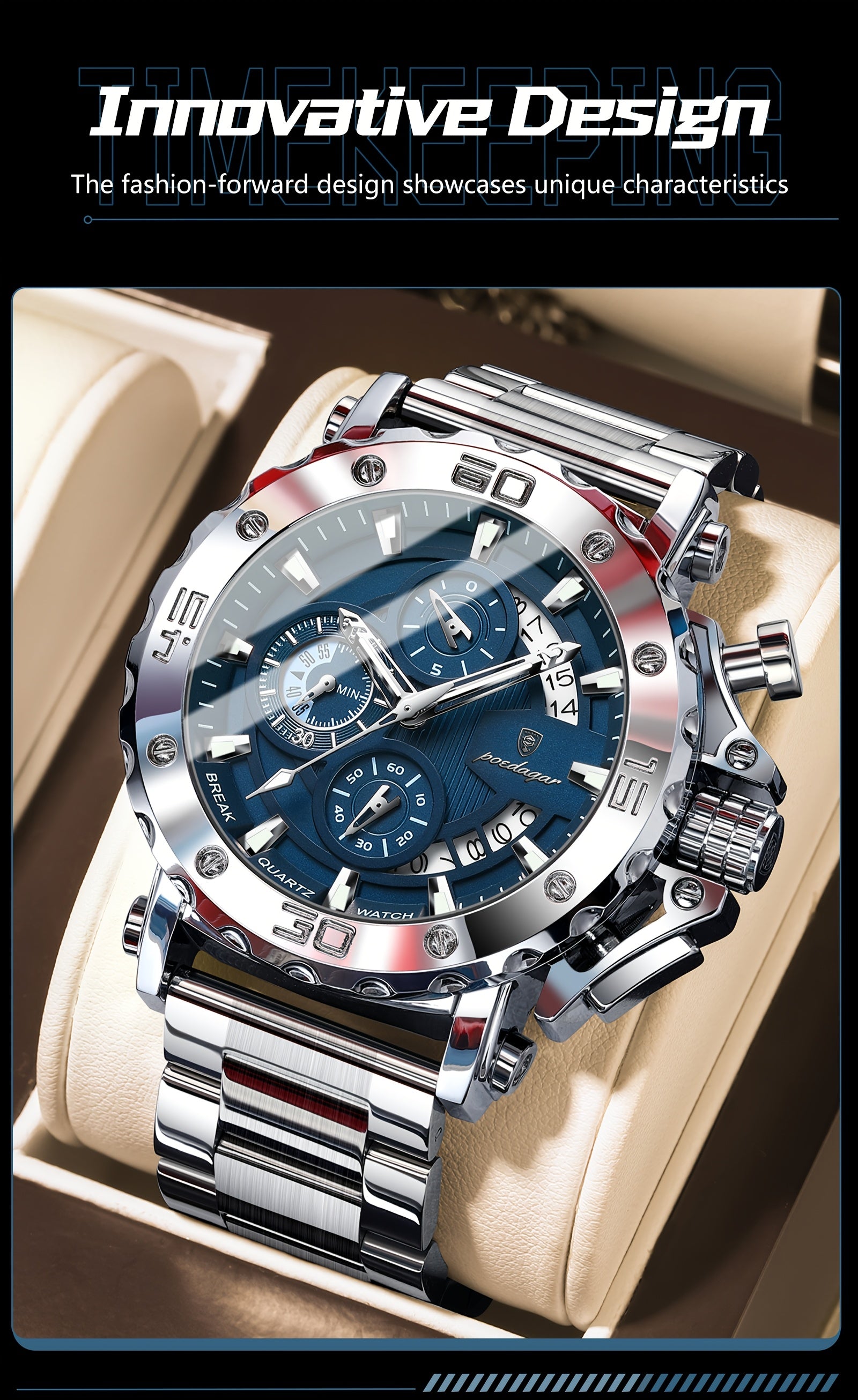 POEDAGAR Men'S Luxury Stainless Steel Business Watch with Date Display, 3ATM Blue Dial, Rotating Bezel, Alloy Case, Quartz Movement - Elegant Formal Accessory, Formal Accessory|Luxurious Watch|Quartz Movement Watch