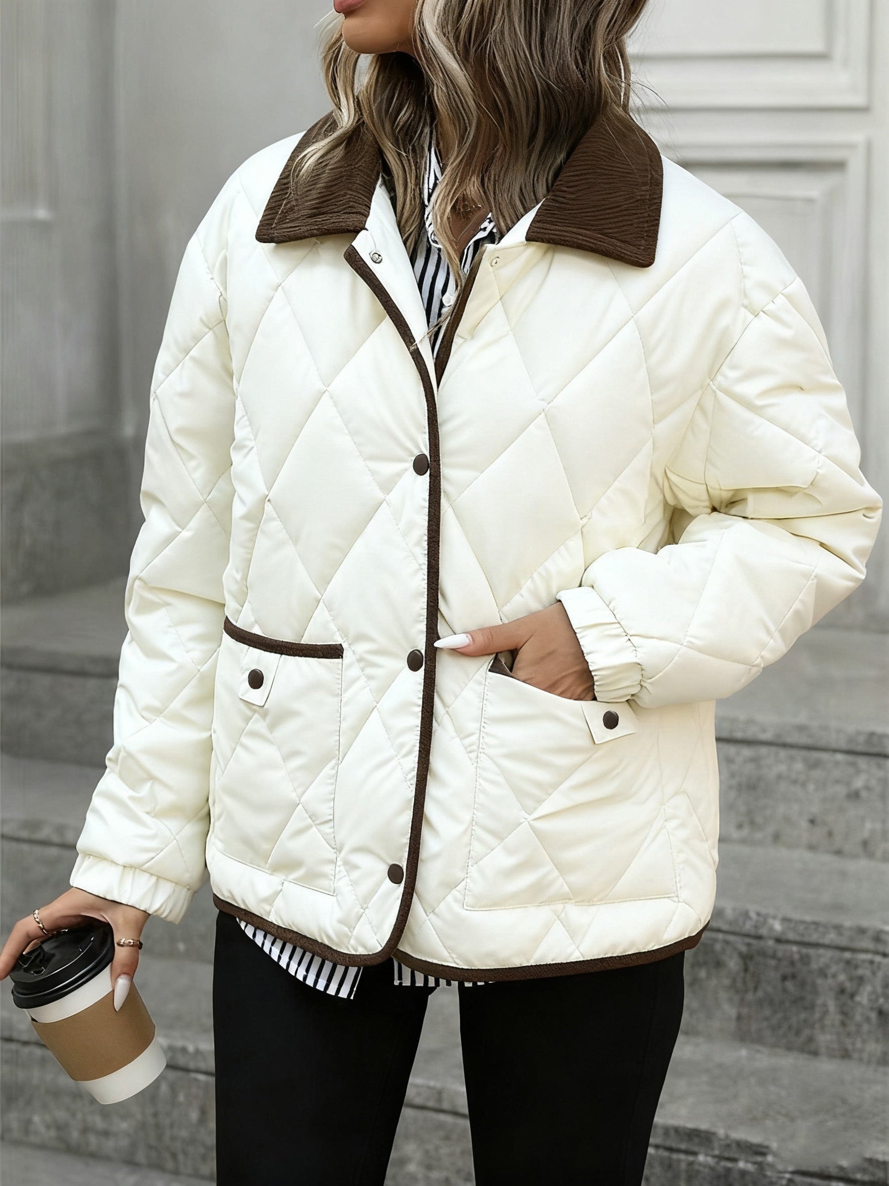 Rhombus Pattern Fashion Women's Top, Collar Spliced Single-Breasted Short Coat, Winter 2024 New Arrival, Contrast Trim, Petite-Friendly Jacket, Fashionable Warm Casual Outerwear, High-Reviewed