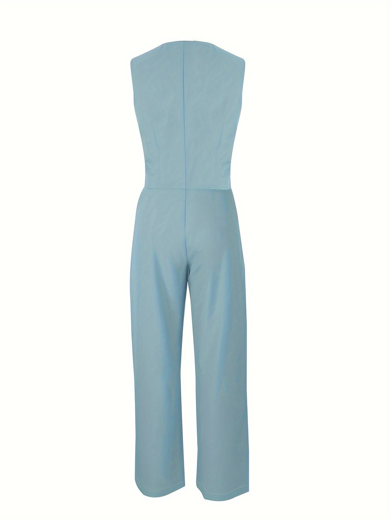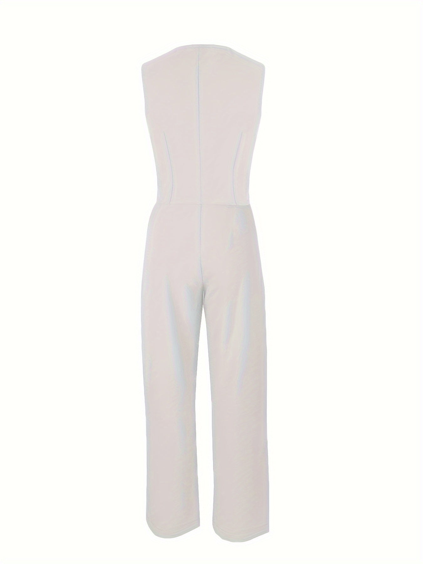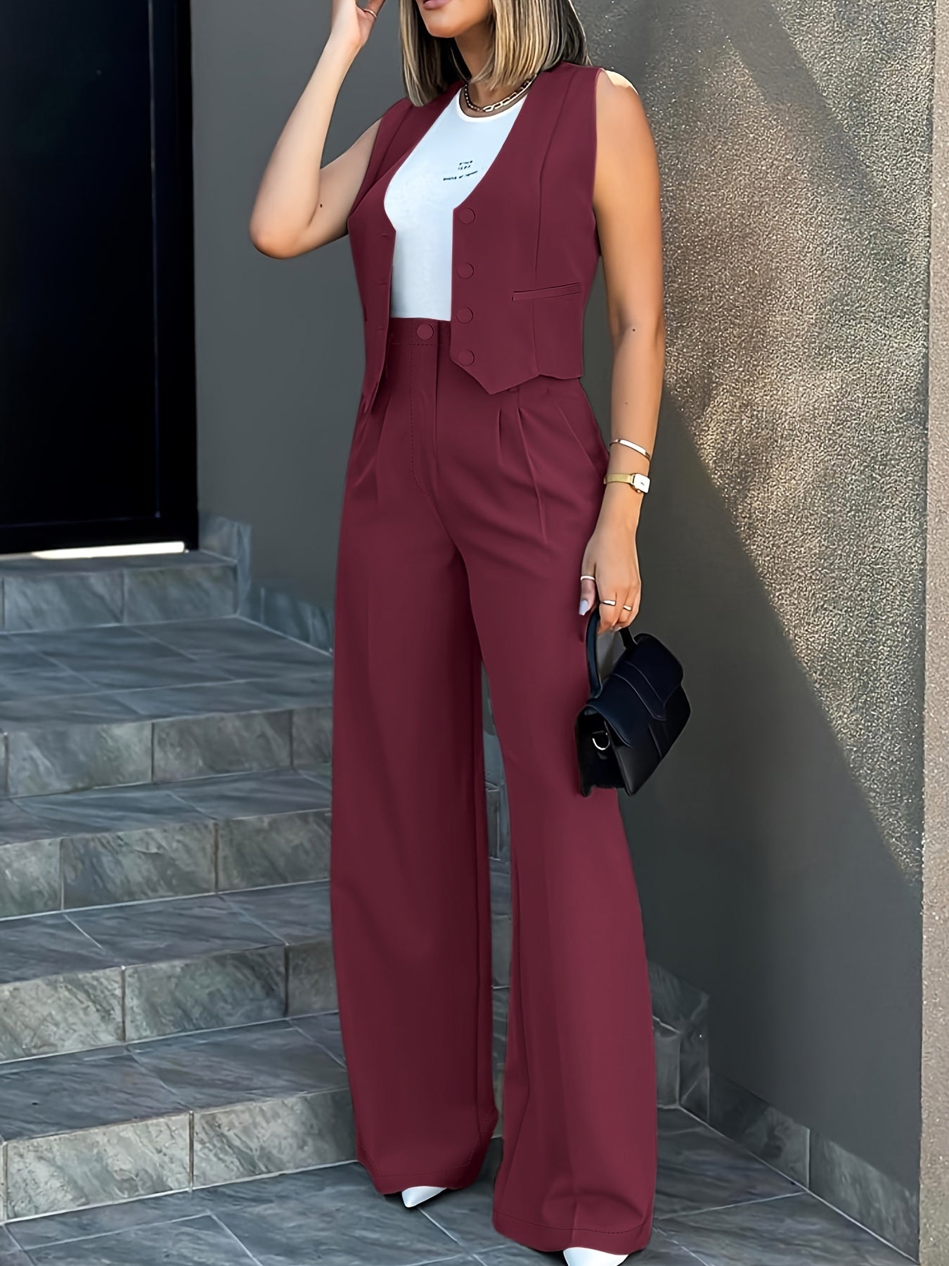Solid Color Stylish Pantsuits, Button Front Fake Pocket Sleeveless Vest & High Waist Pleated Pants Outfits, Women'S Clothing