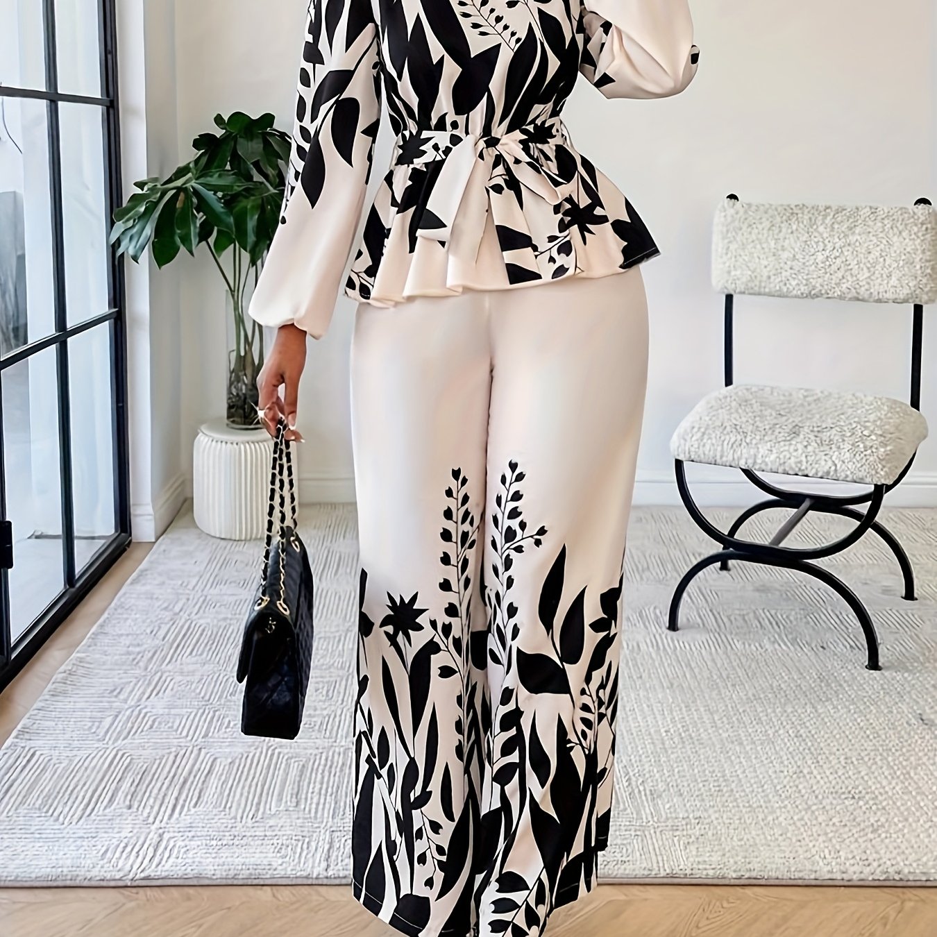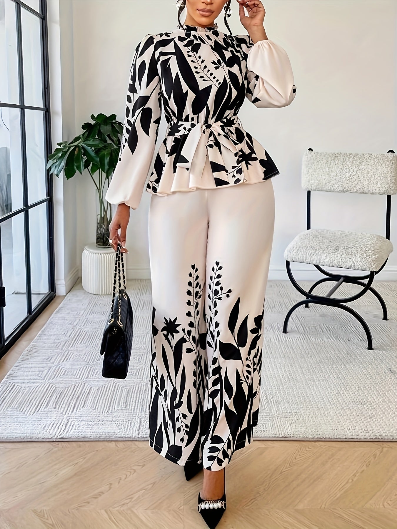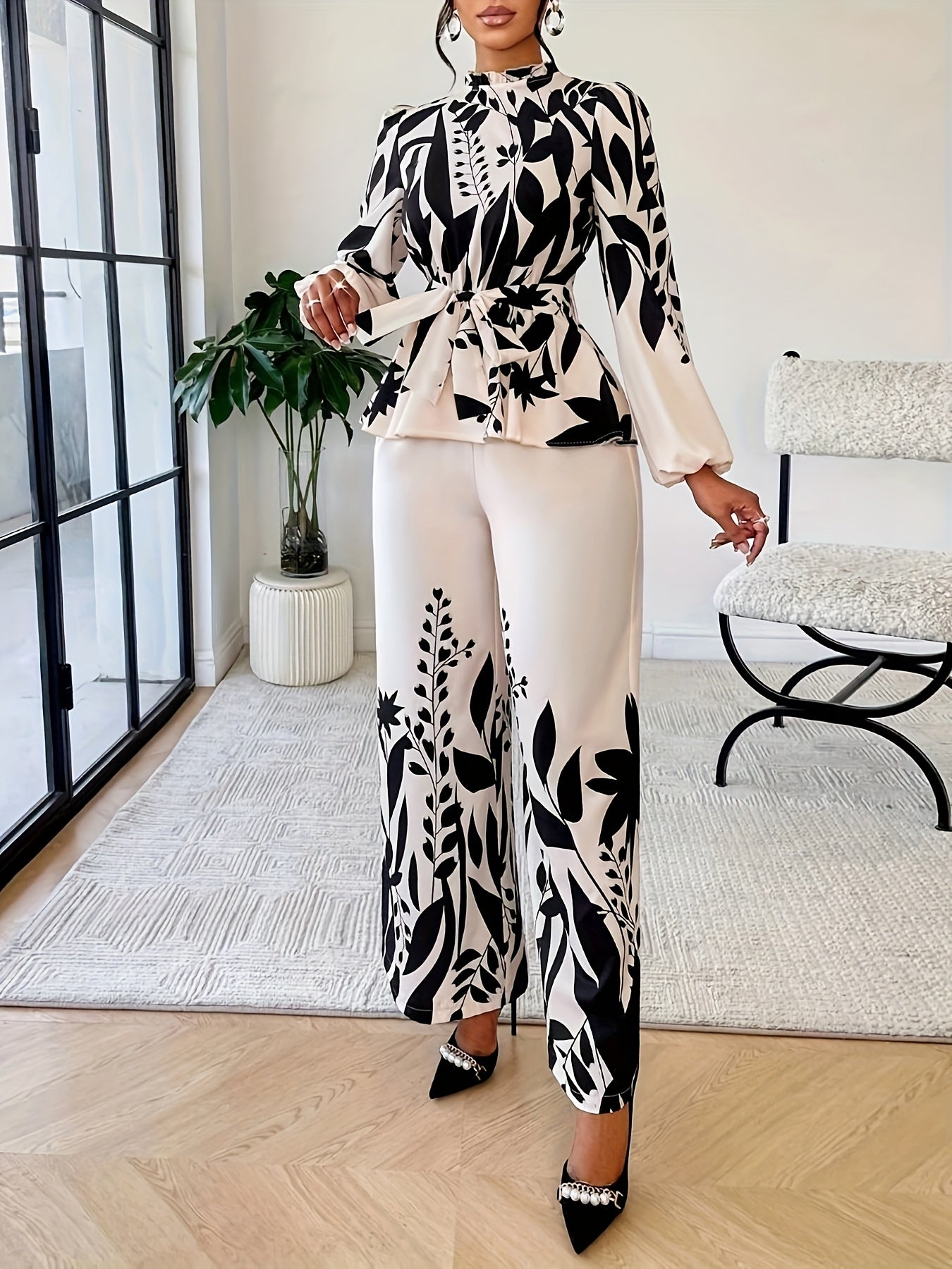 Spring And Autumn Fashionable Women'S Floral Long-Sleeve Top And Pants Set