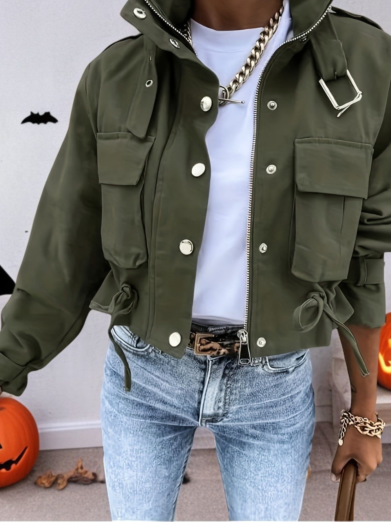 Spring and Autumn Women's Multi-Pocket Work Jacket, Stand Collar Design with Drawstring Waist - Versatile Fashion Coat for Various Occasions