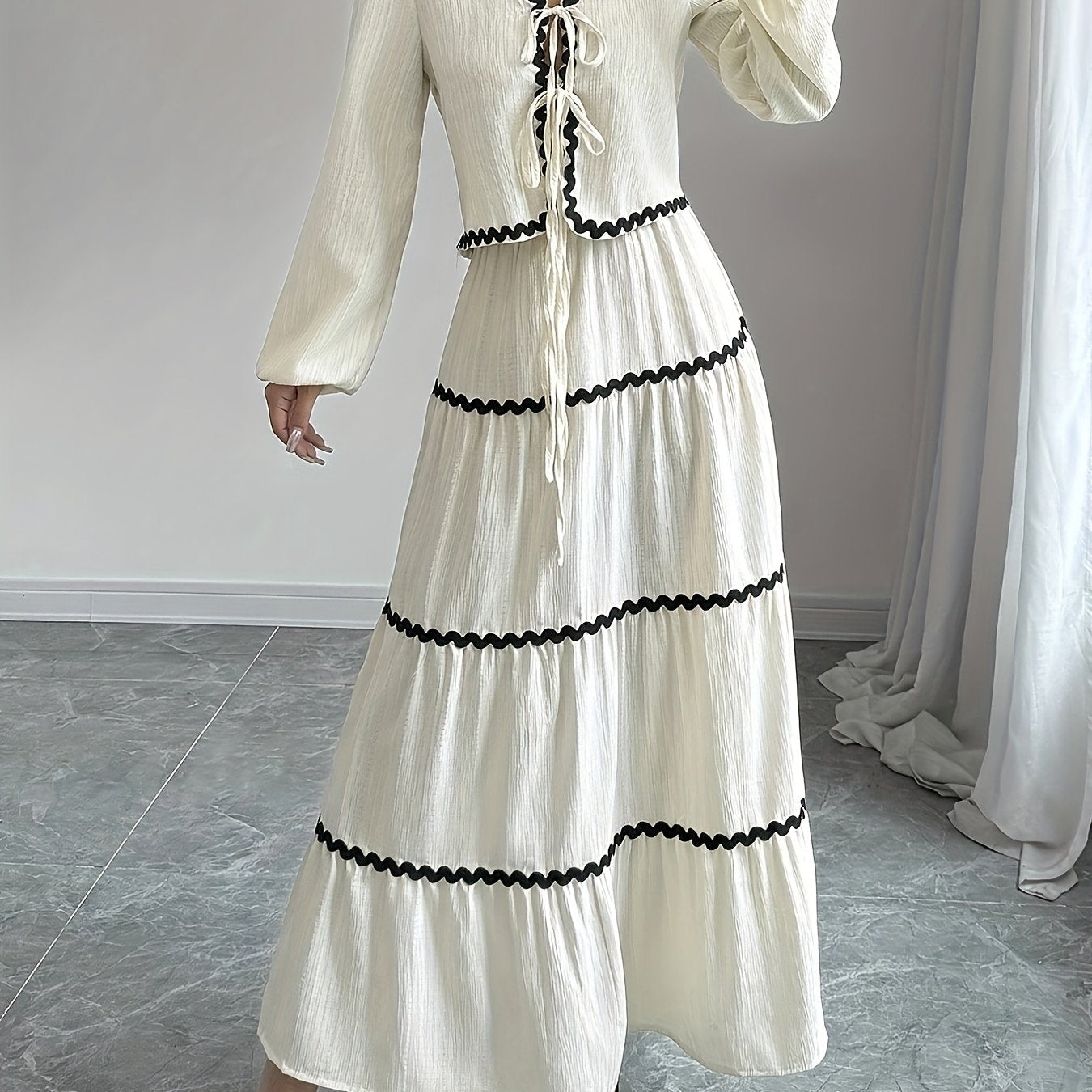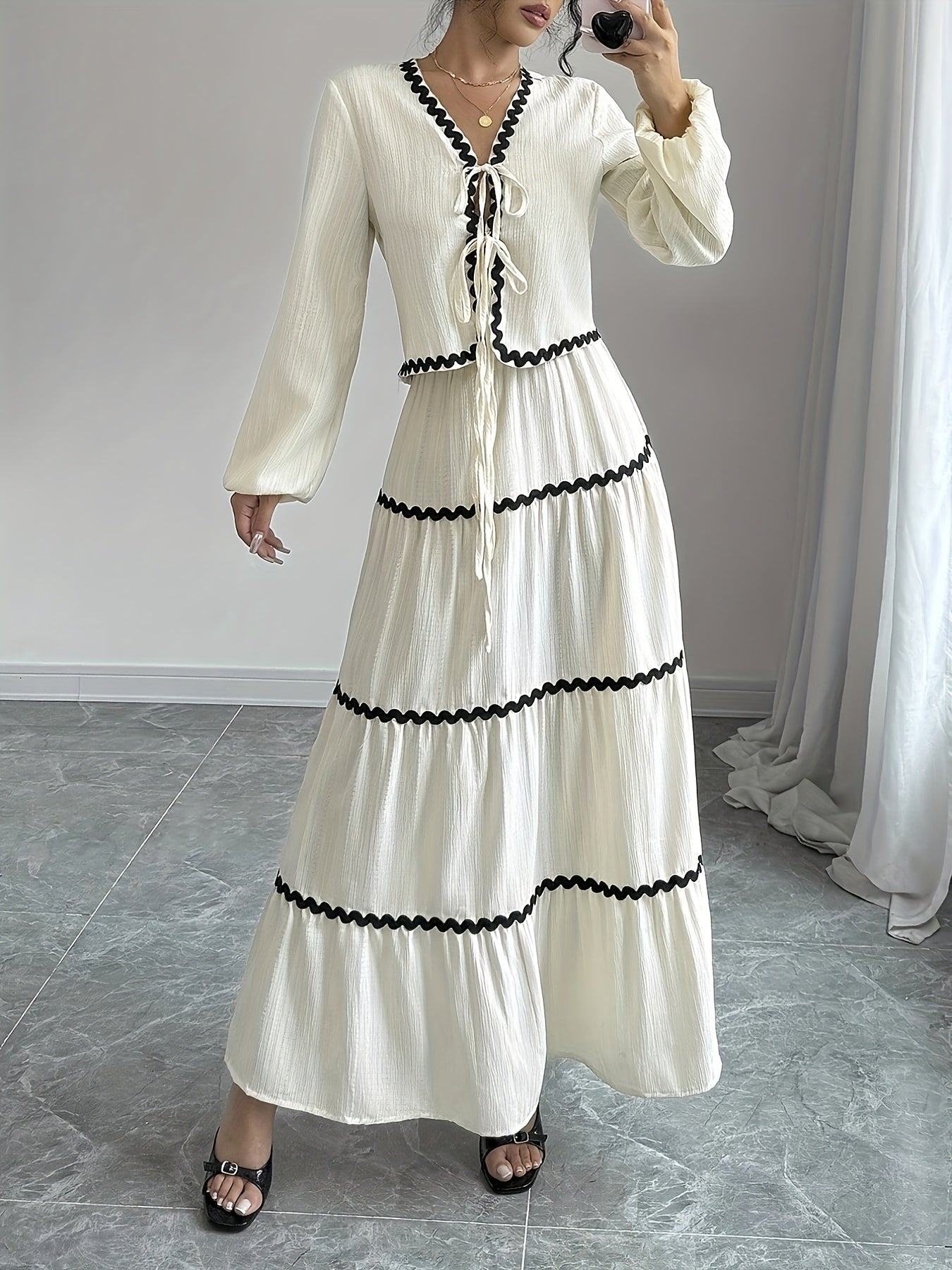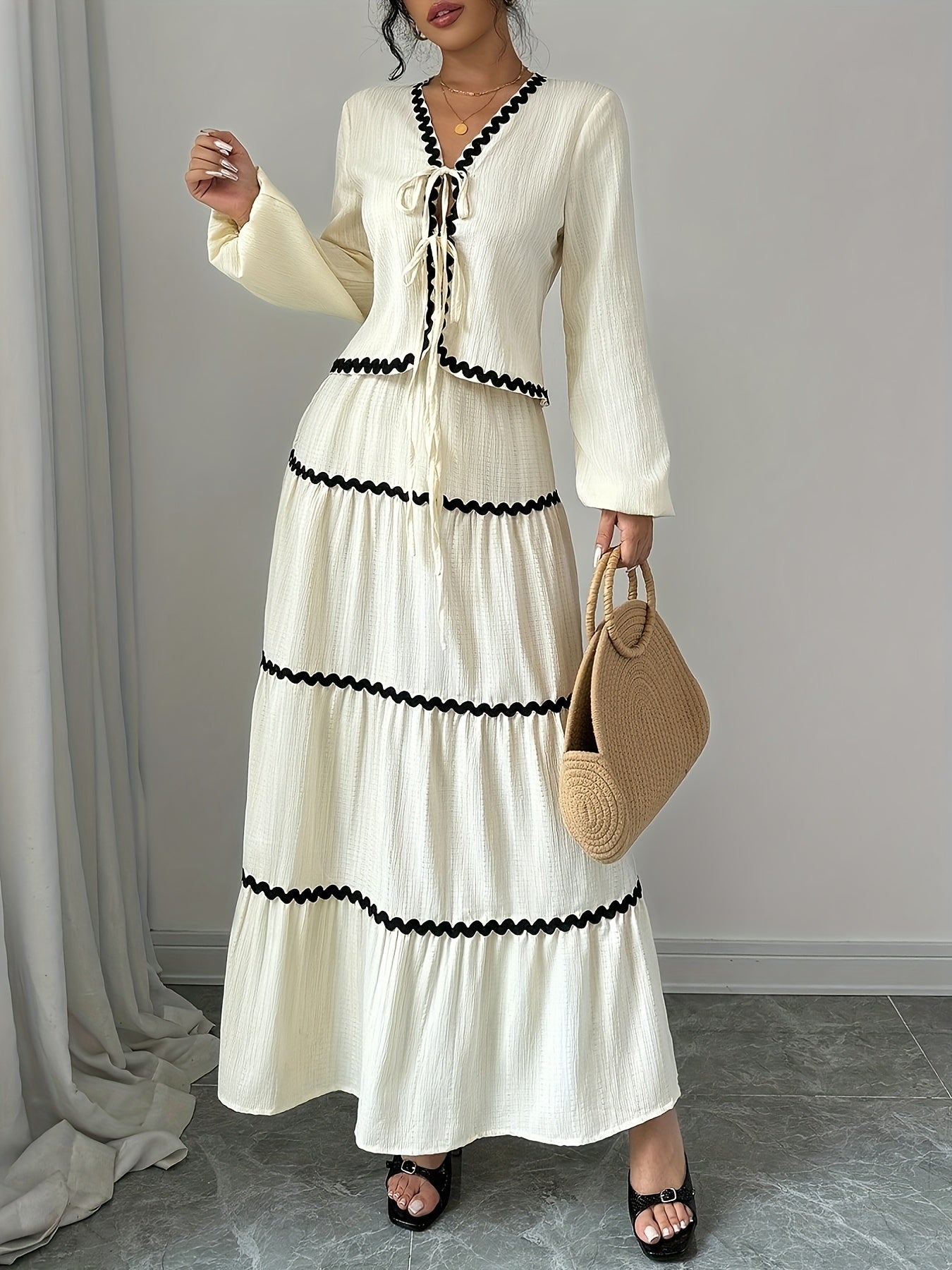 Spring-Summer Temperament Fashion Black Trim V-Neck Two-Piece Set with Tie Strap Long Sleeve Top and Skirt for Women