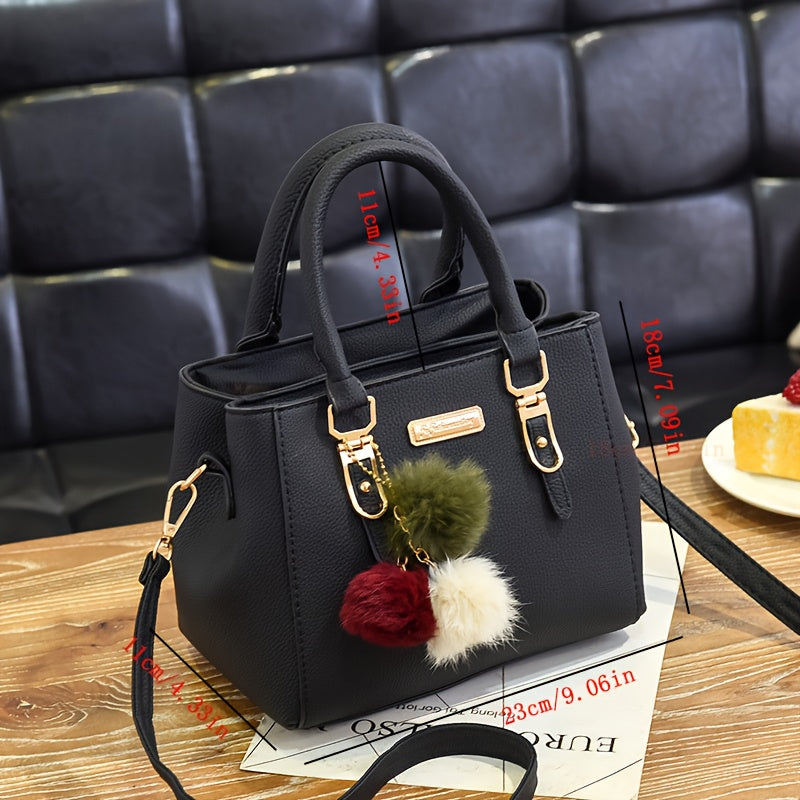 Stylish Lychee Pattern Handbag with Adjustable Strap and Pom Pom Ball Charms - Versatile Shoulder Handbag for Women in Black, Army Green, Khaki, Light Grey, Dark Grey, Red, Crossbody Purse, Charming Pom Pom Accents, Metallic