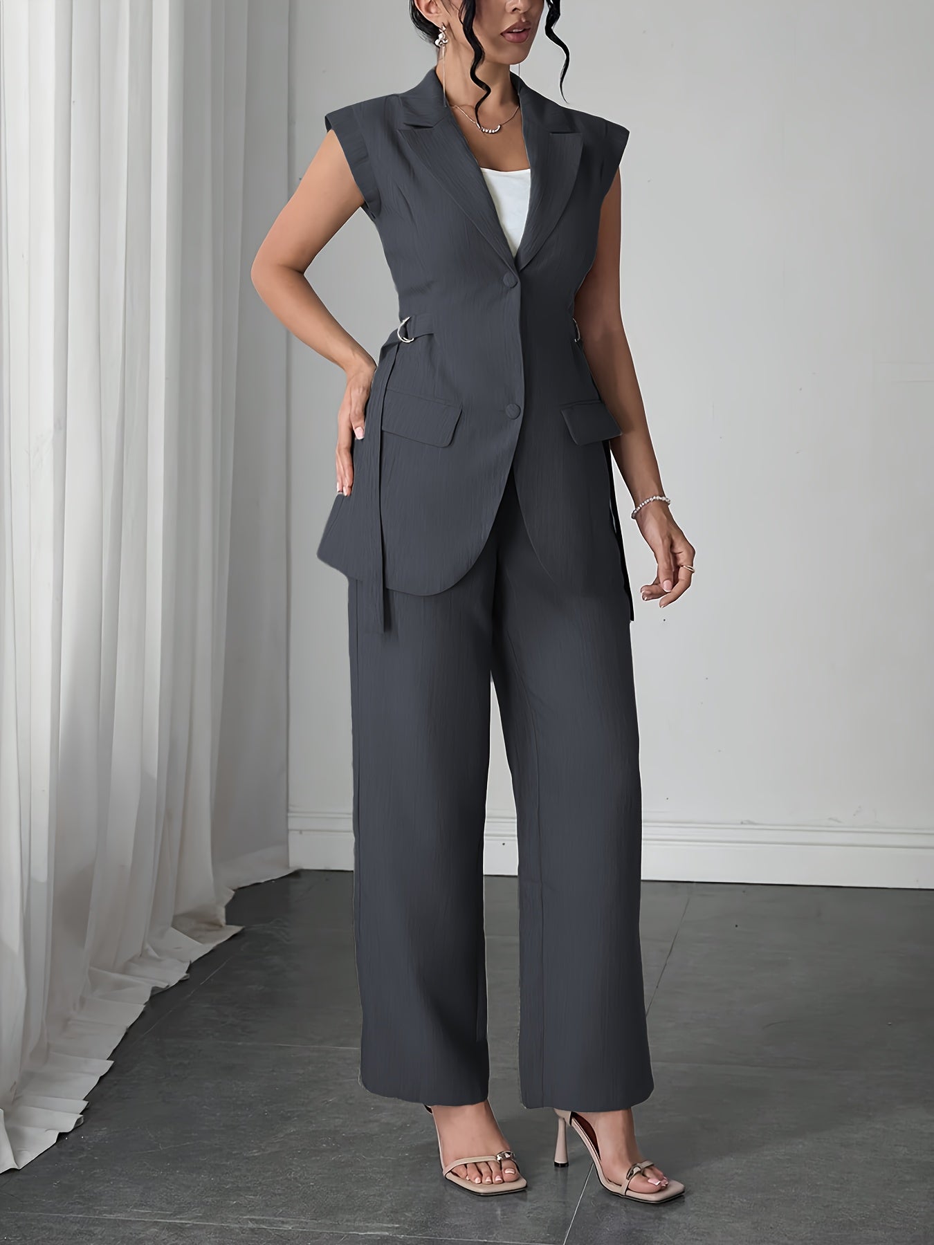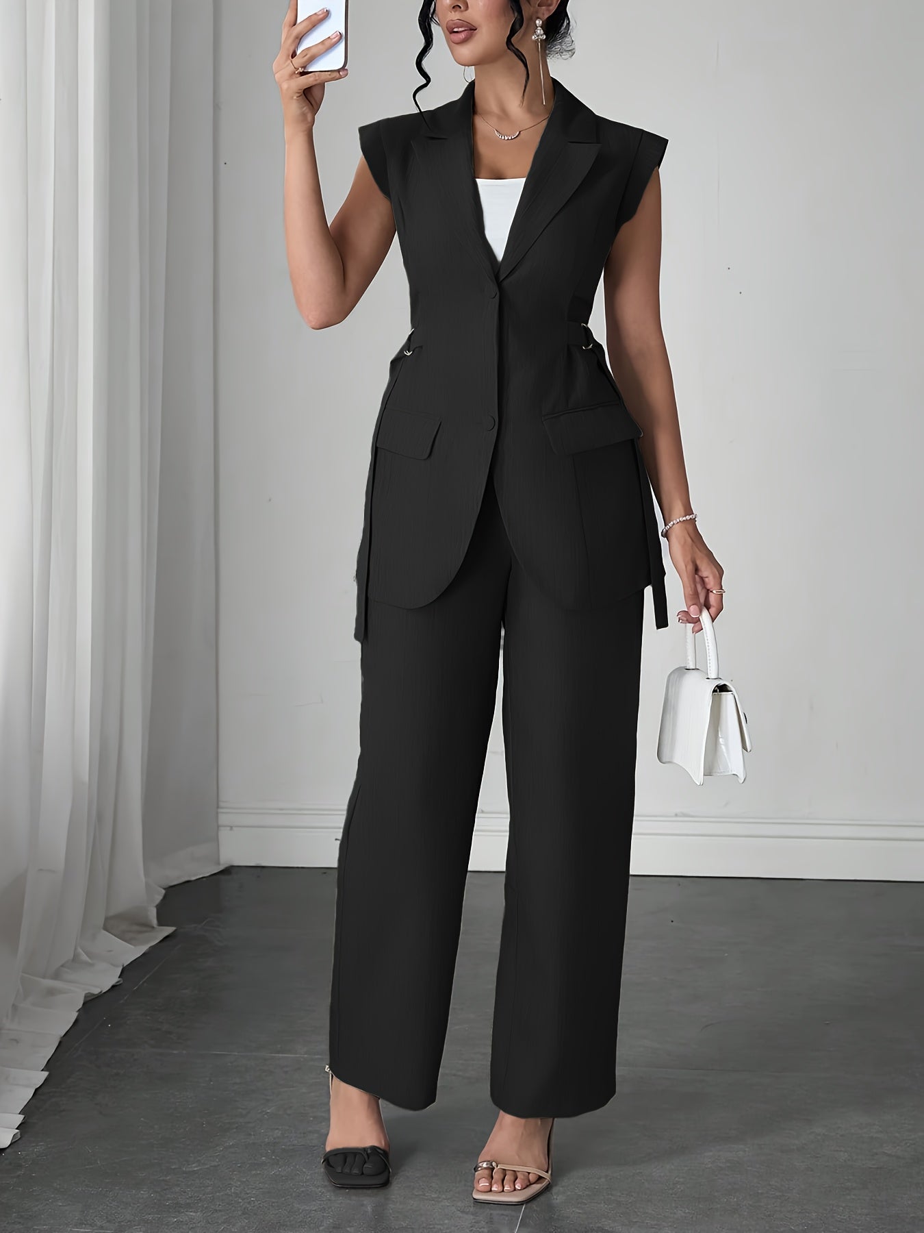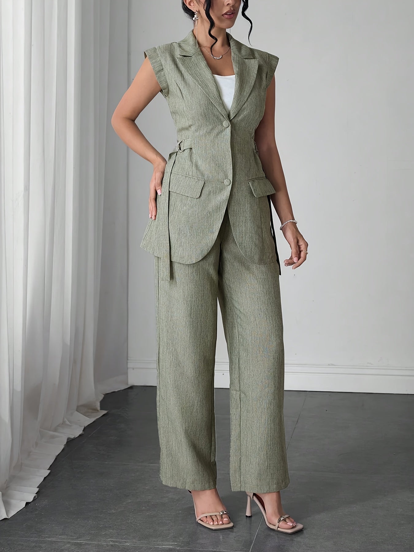Stylish Women'S Elegant Modern Two-Piece Set with Side-Waist Design, Solid Color Sleeveless Jacket and Pants for Spring/Summer