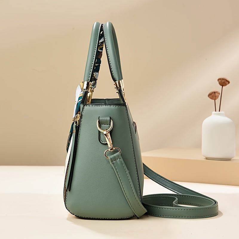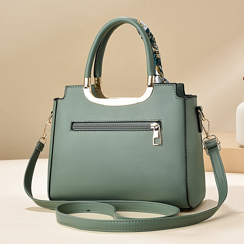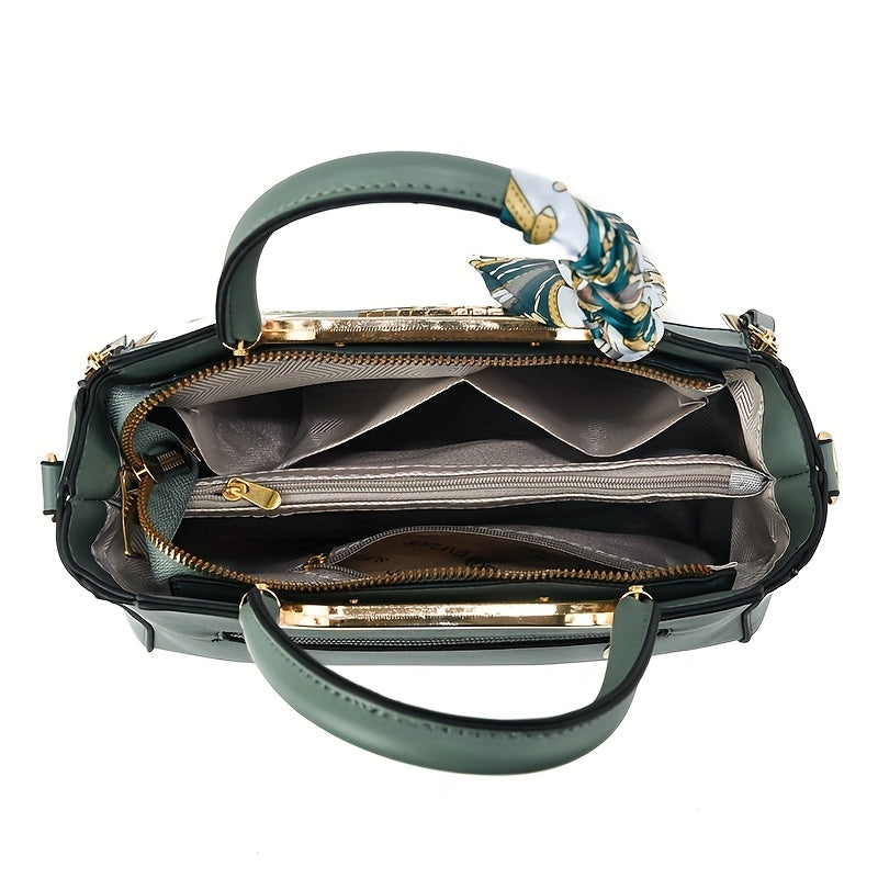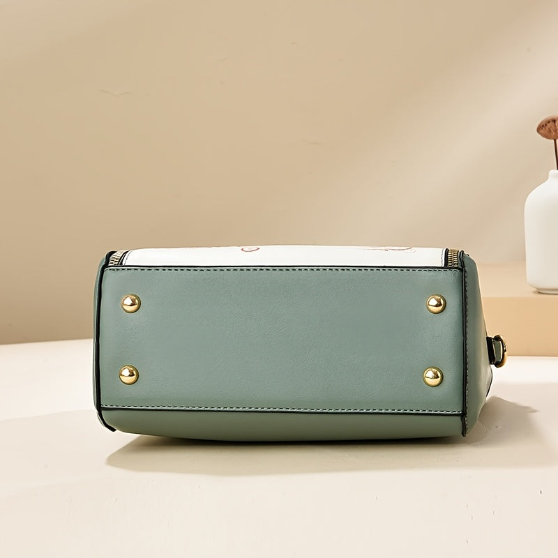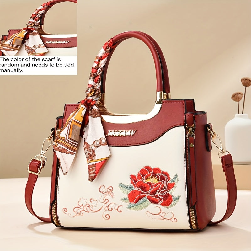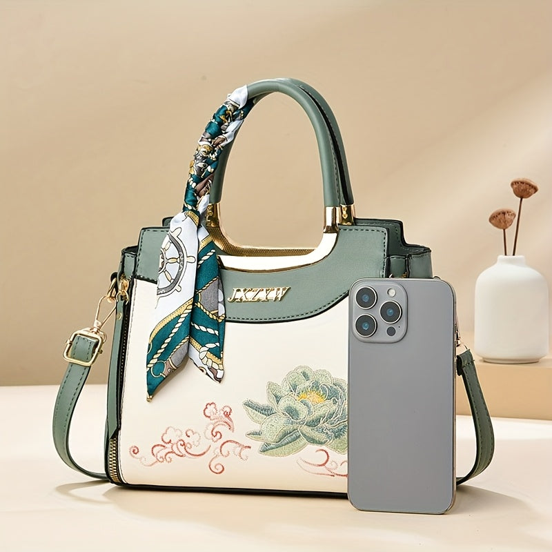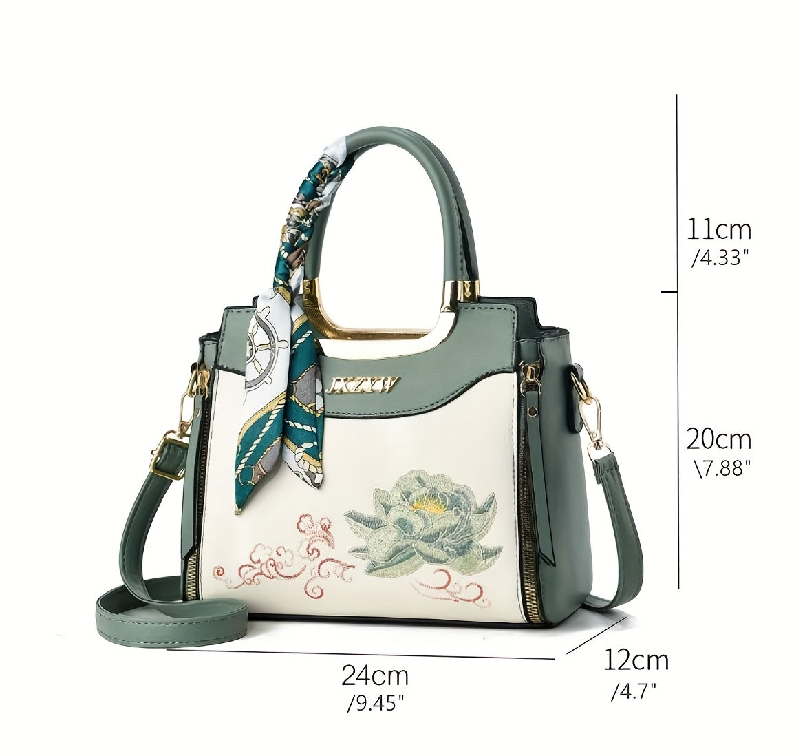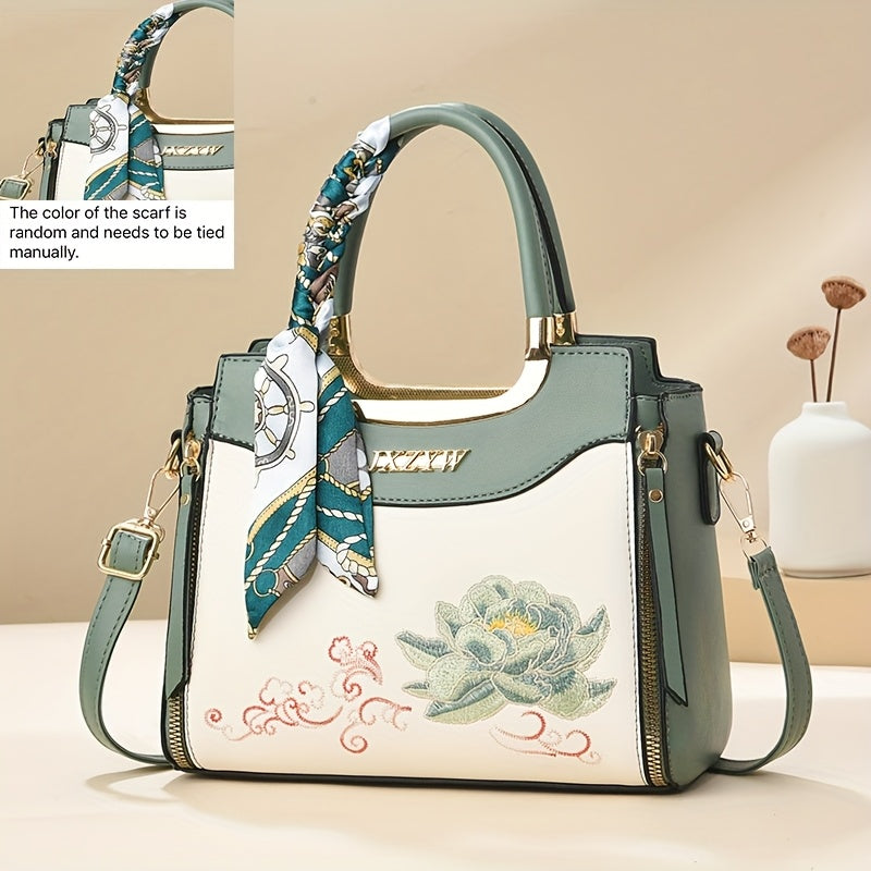Stylish Women's Large Capacity Handbag with Floral Embroidery, Color-Block Design & Golden-Tone Hardware - Navy/Green/Wine Red, Polyester Lining, Secure Zipper Closure, Durable Commuter Tote for Work, Travel, Gift