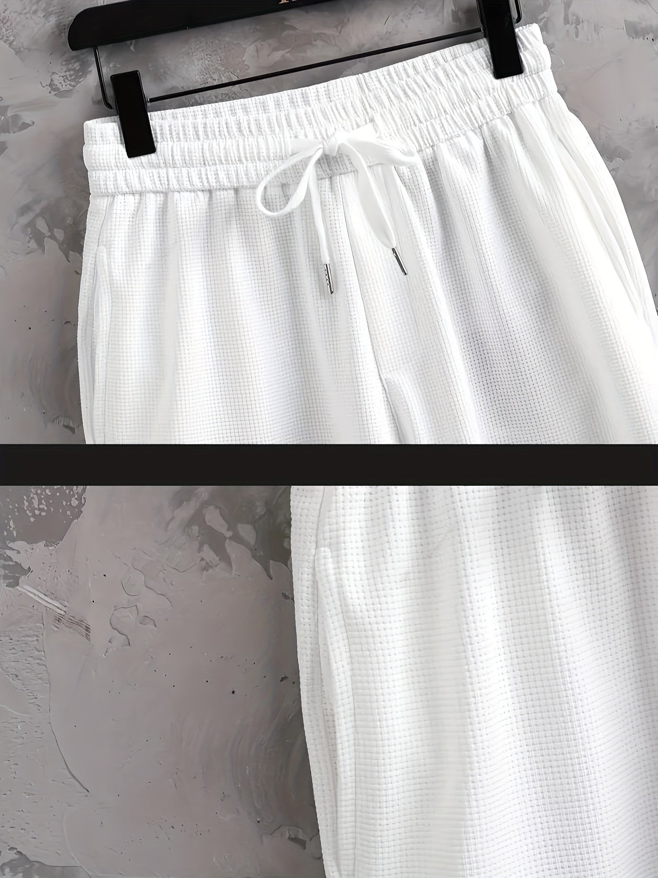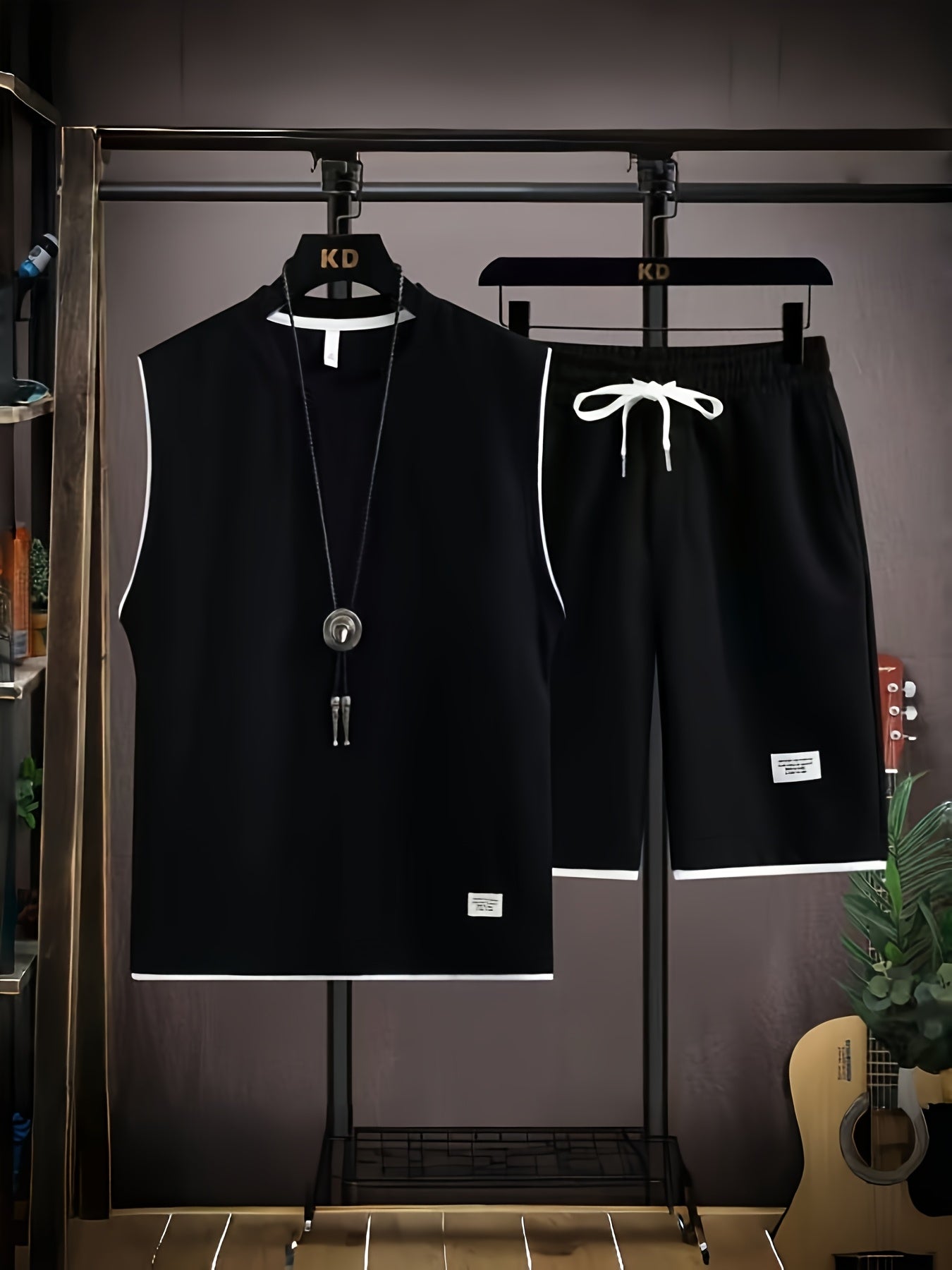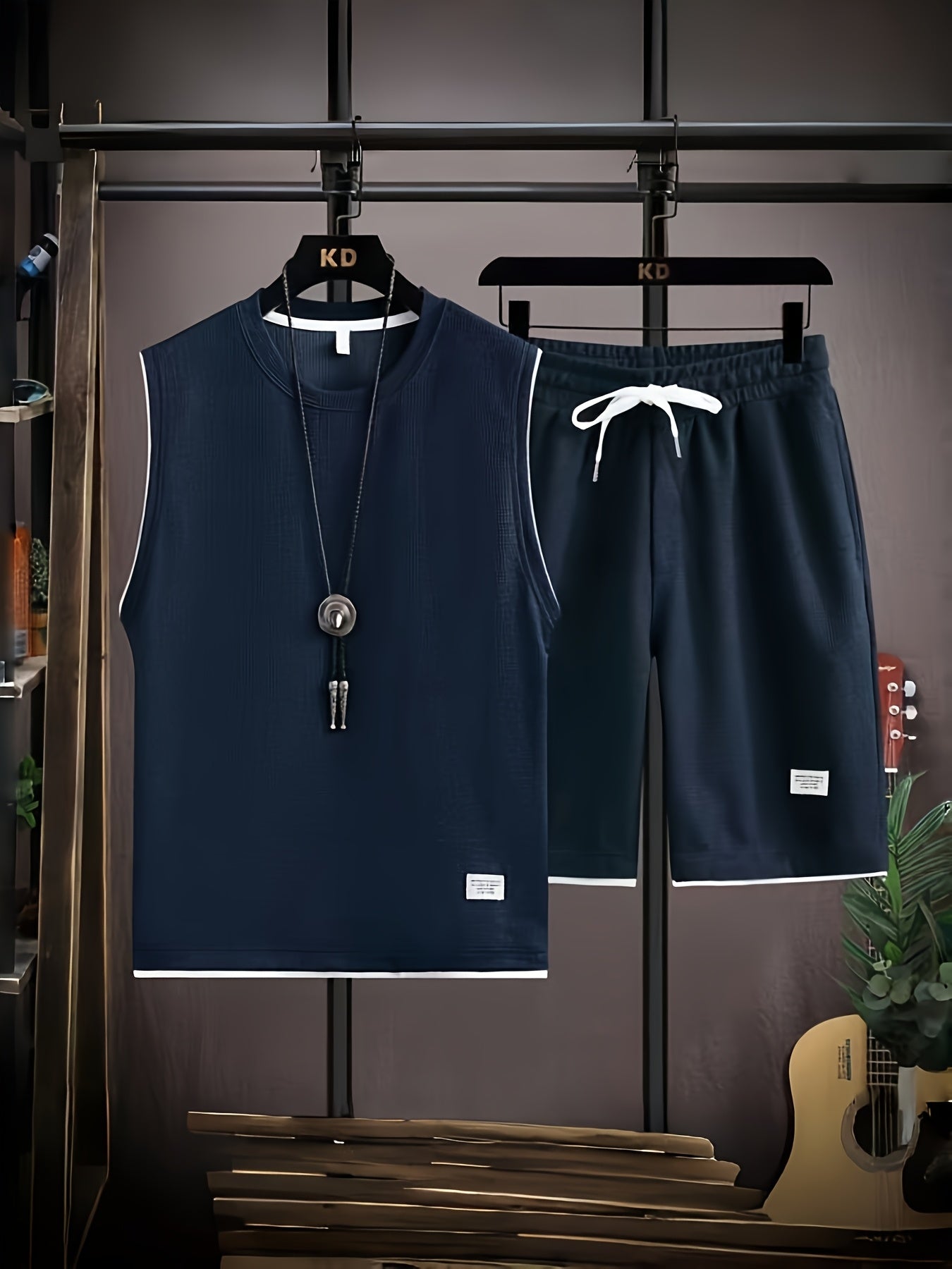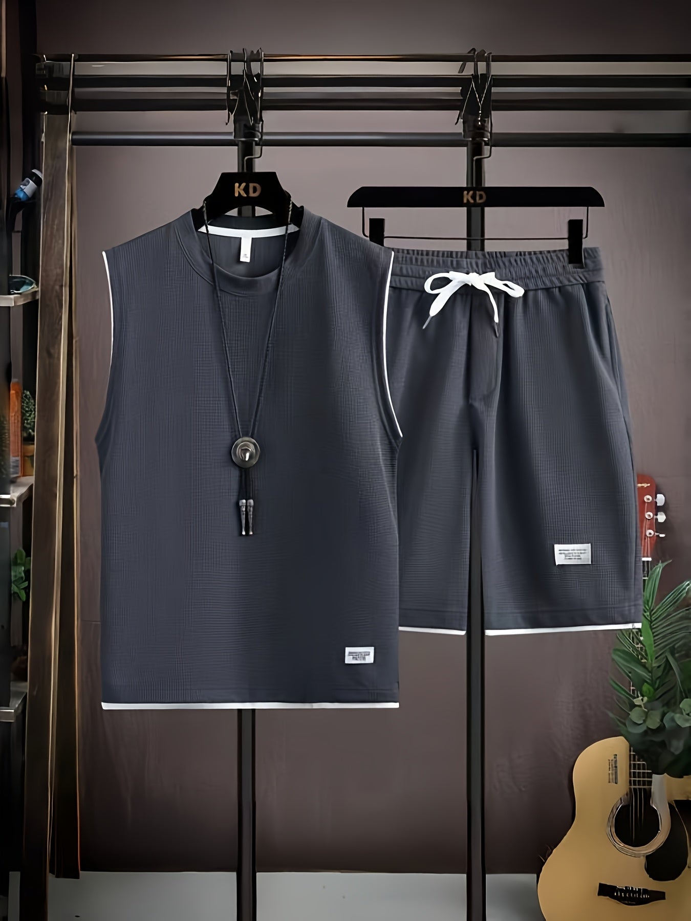 Summer Men's waffle vest set, casual fashion fake two-piece sleeveless vest and casual shorts two-piece set, sports set, breathable, soft and comfortable